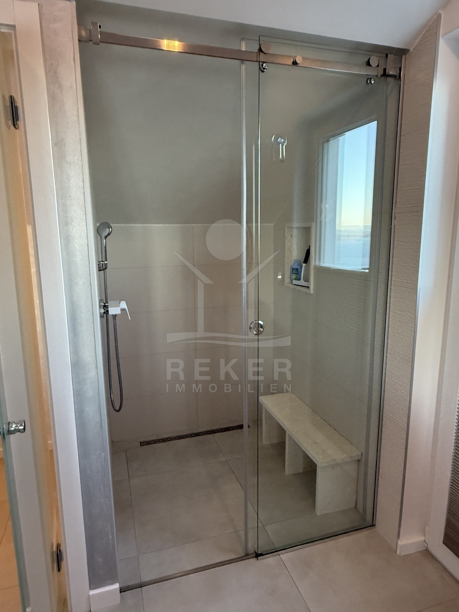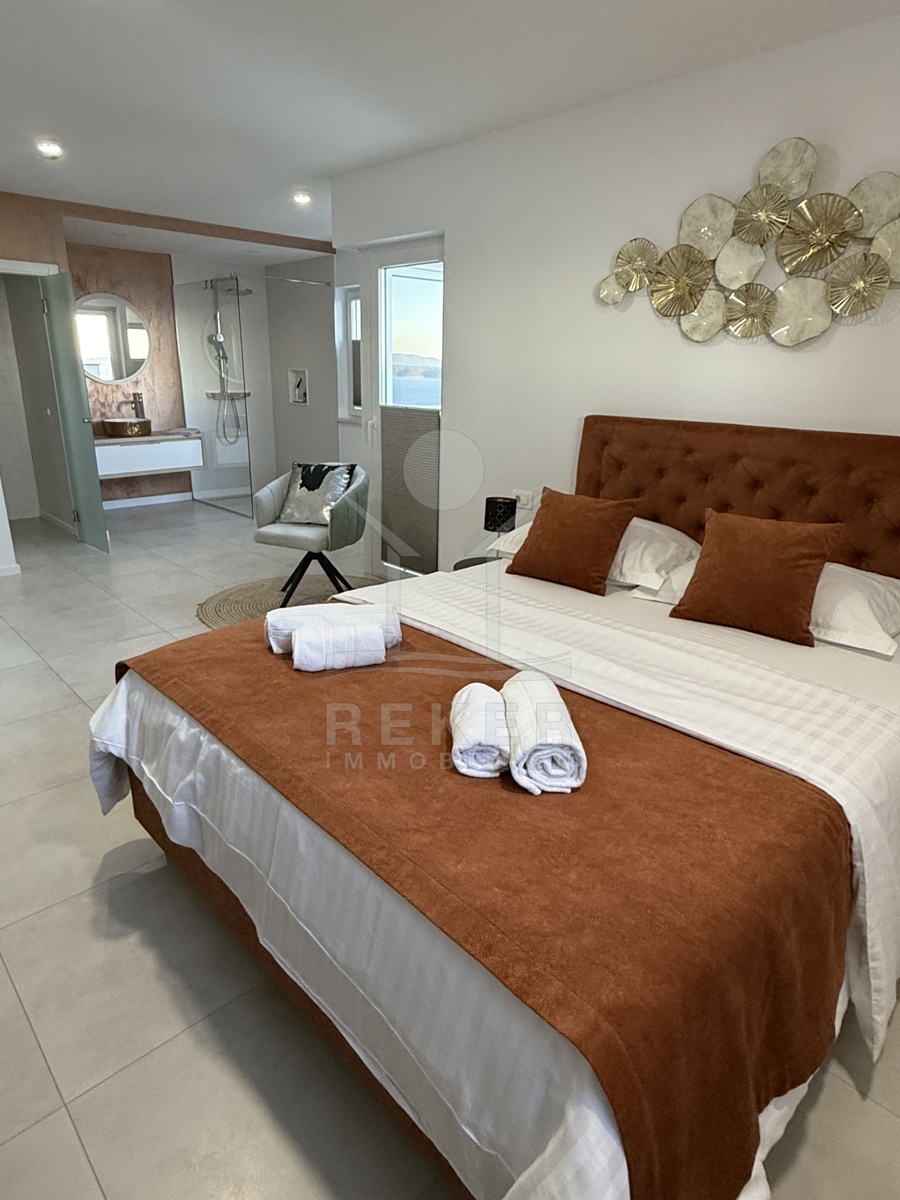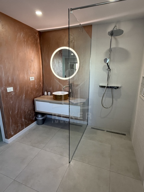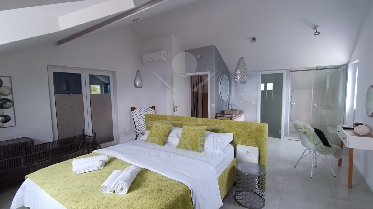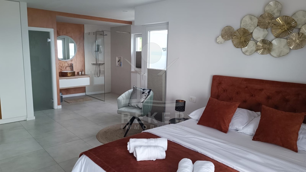 Im Inneren stehen ca. 260 m² Wohnfläche zur Verfügung, verteilt auf fünf Zimmer. Drei Schlafzimmer bieten Platz für Familie und Gäste. Zusätzlich gibt es eine Schlafmöglichkeit im Wohnzimmer. Vier modern ausgestattete Badezimmer mit aktuellen sanitären Anlagen sorgen für Komfort. Die Villa ist vollmöbliert und hochwertig ausgestattet. Fußbodenheizung und Klimaanlage sind in allen Räumen vorhanden. Ein Kamin ergänzt das Wohnkonzept und schafft auch in der kühleren Jahreszeit eine angenehme Atmosphäre. Der Gesamtzustand ist sehr gepflegt, die Bauausführung entspricht aktuellen Standards.