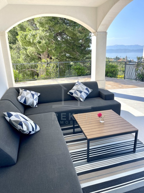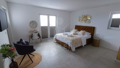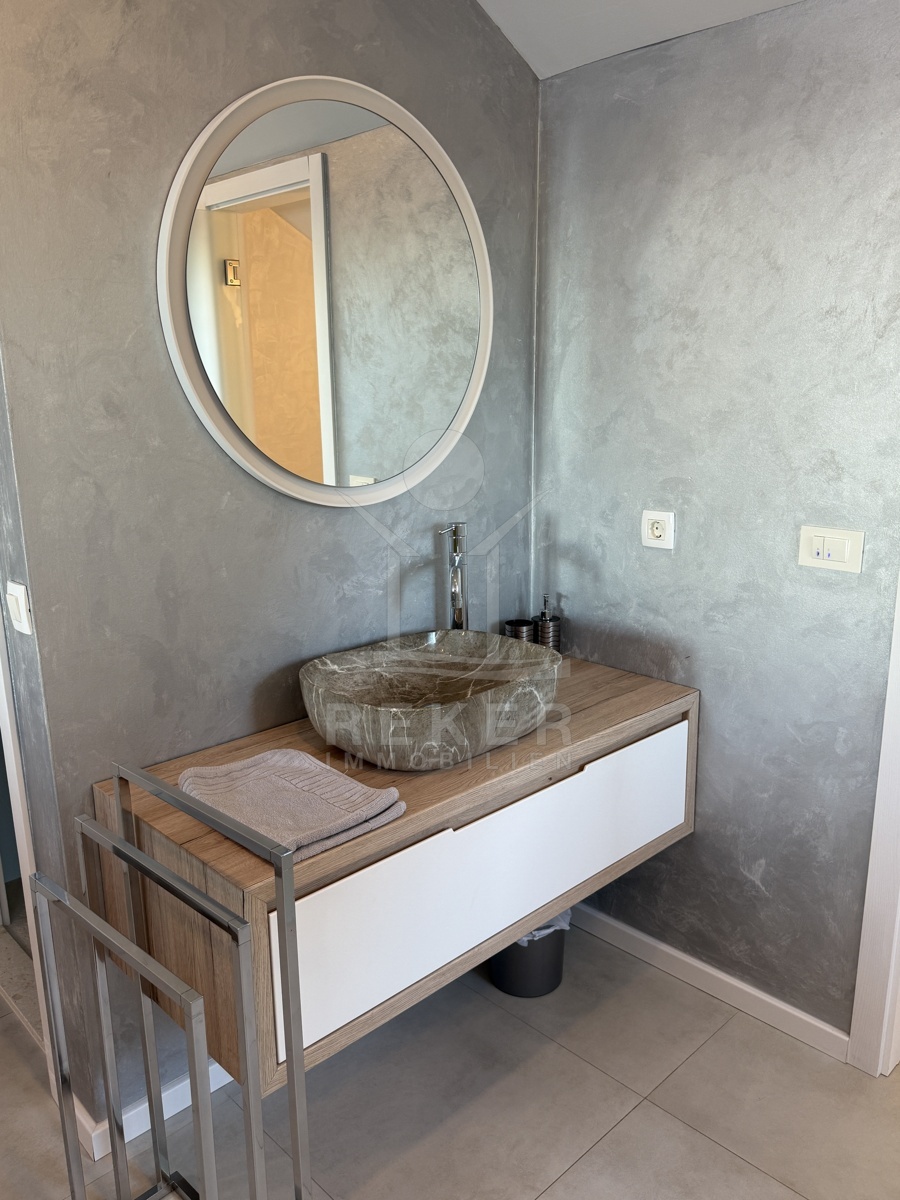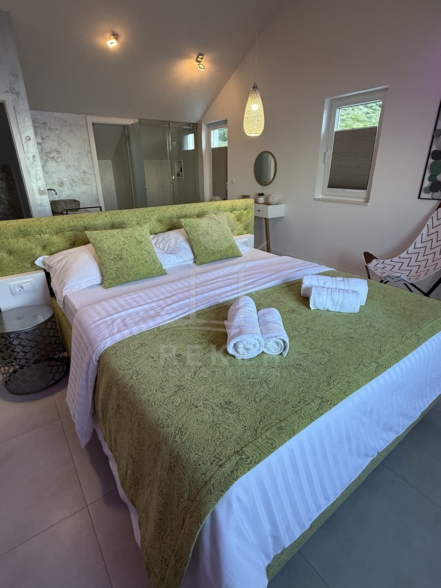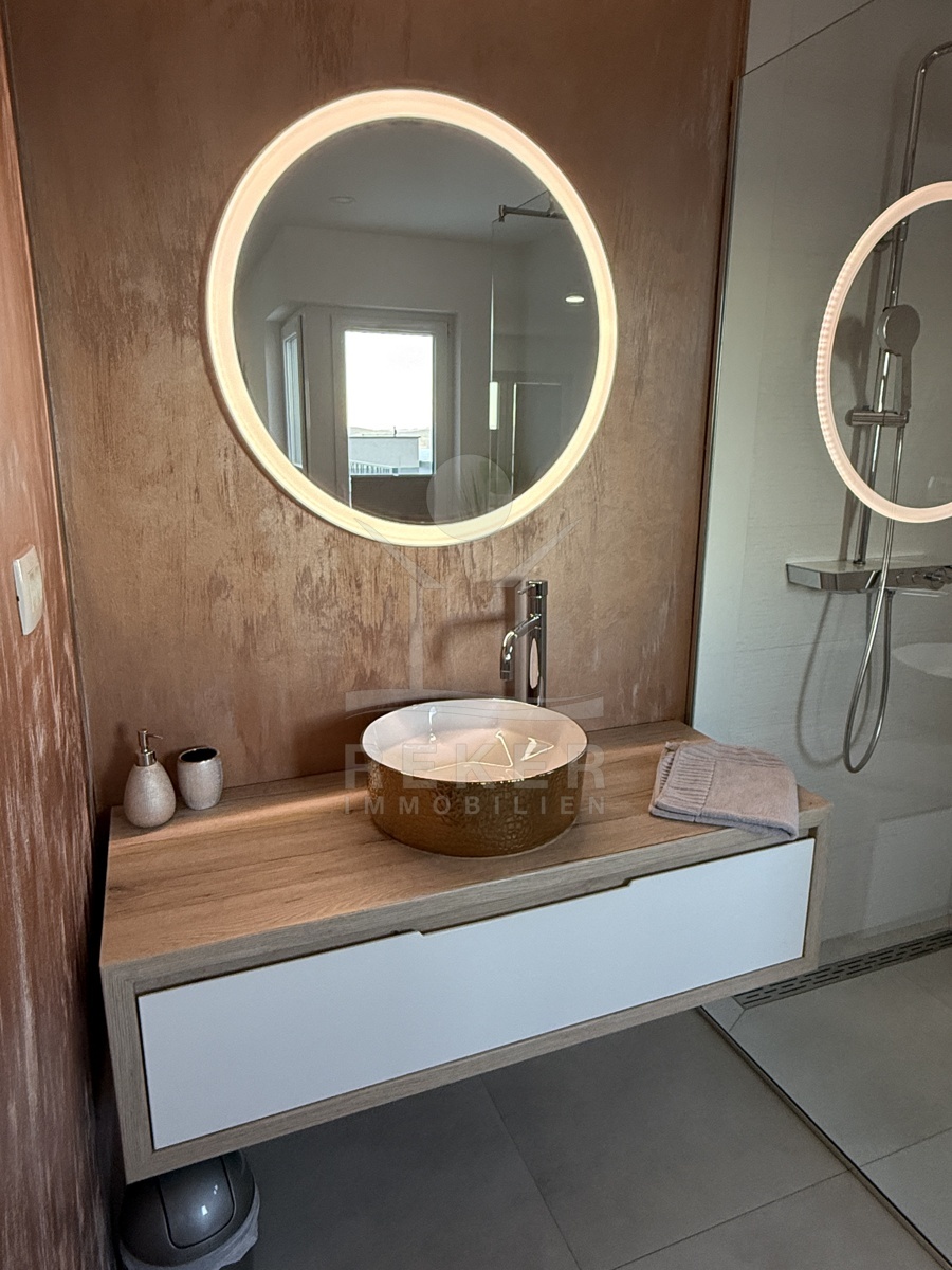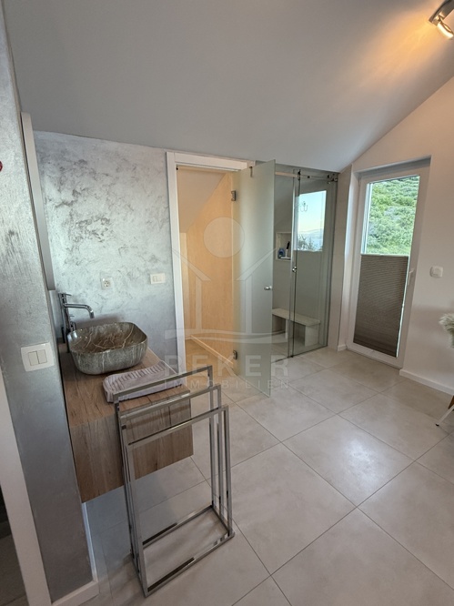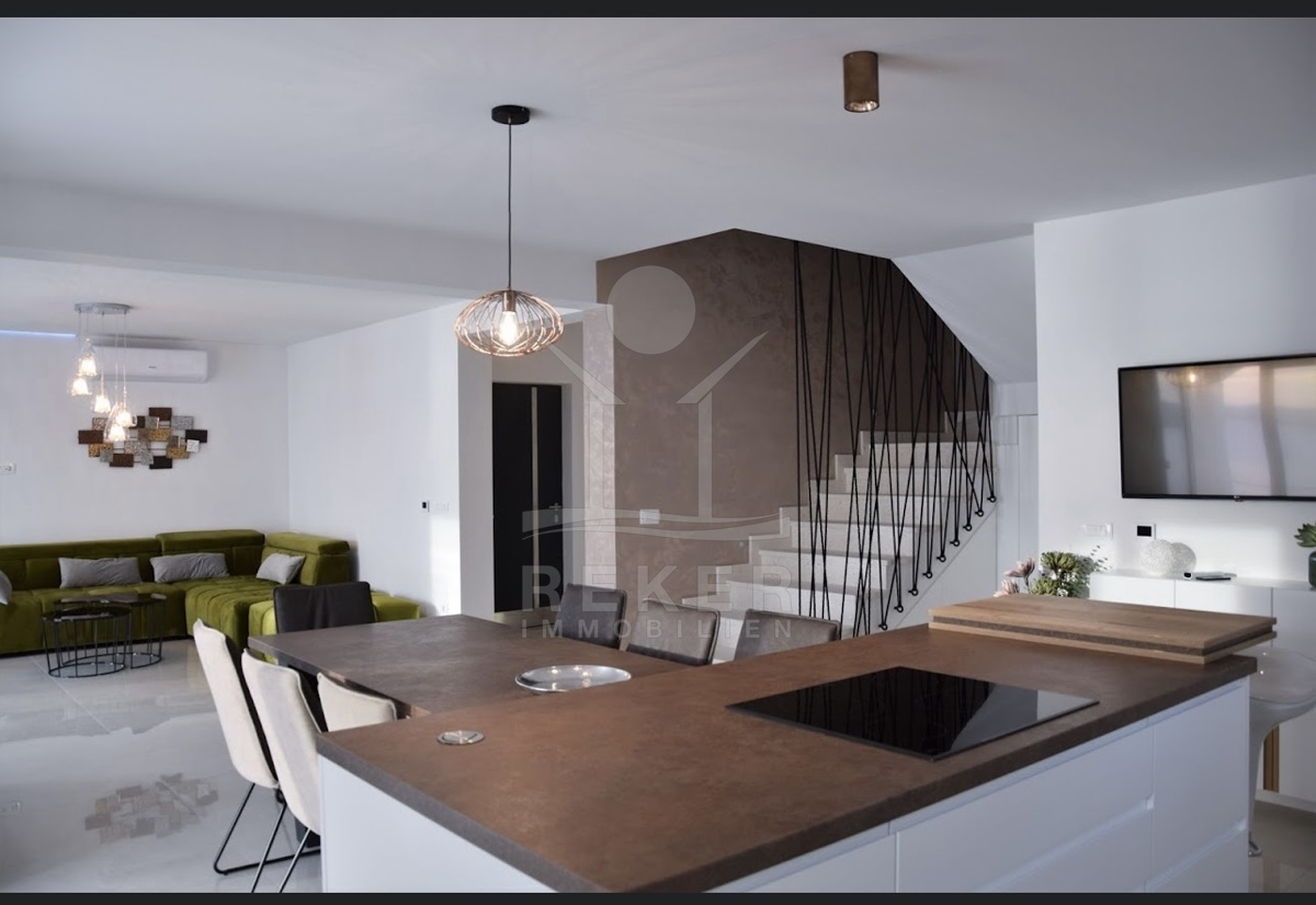 Im Inneren stehen ca. 260 m² Wohnfläche zur Verfügung, verteilt auf fünf Zimmer. Drei Schlafzimmer bieten Platz für Familie und Gäste. Zusätzlich gibt es eine Schlafmöglichkeit im Wohnzimmer. Vier modern ausgestattete Badezimmer mit aktuellen sanitären Anlagen sorgen für Komfort. Die Villa ist vollmöbliert und hochwertig ausgestattet. Fußbodenheizung und Klimaanlage sind in allen Räumen vorhanden. Ein Kamin ergänzt das Wohnkonzept und schafft auch in der kühleren Jahreszeit eine angenehme Atmosphäre. Der Gesamtzustand ist sehr gepflegt, die Bauausführung entspricht aktuellen Standards.