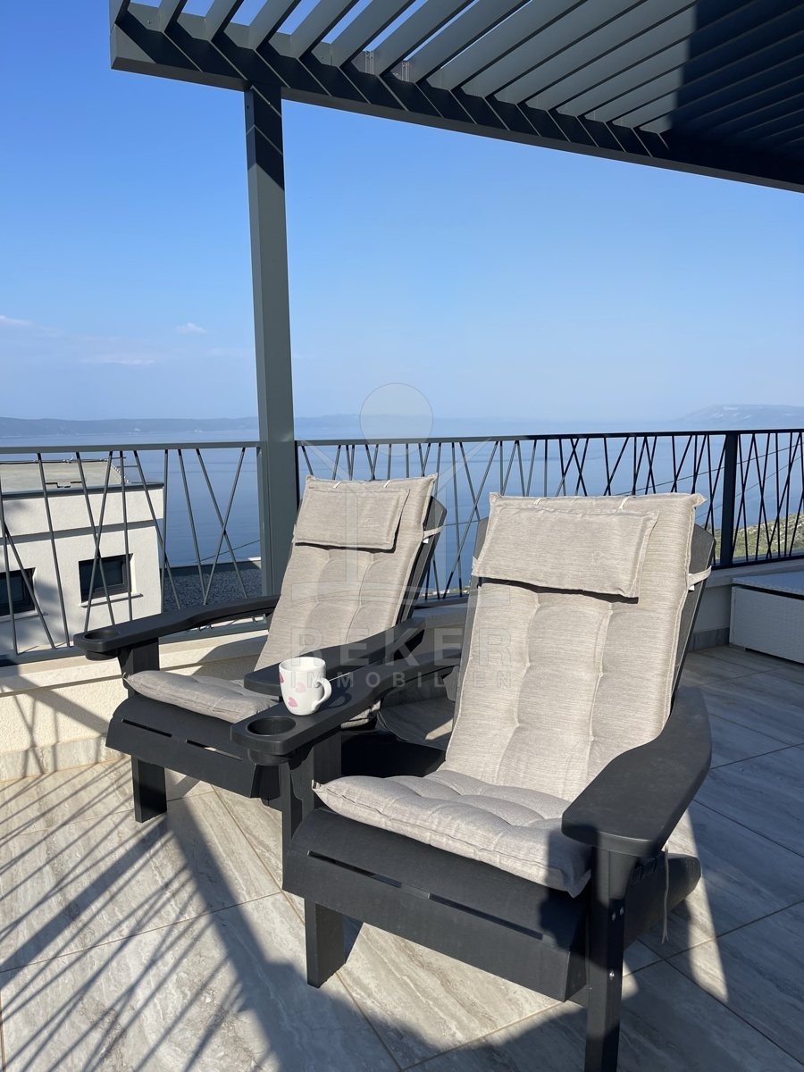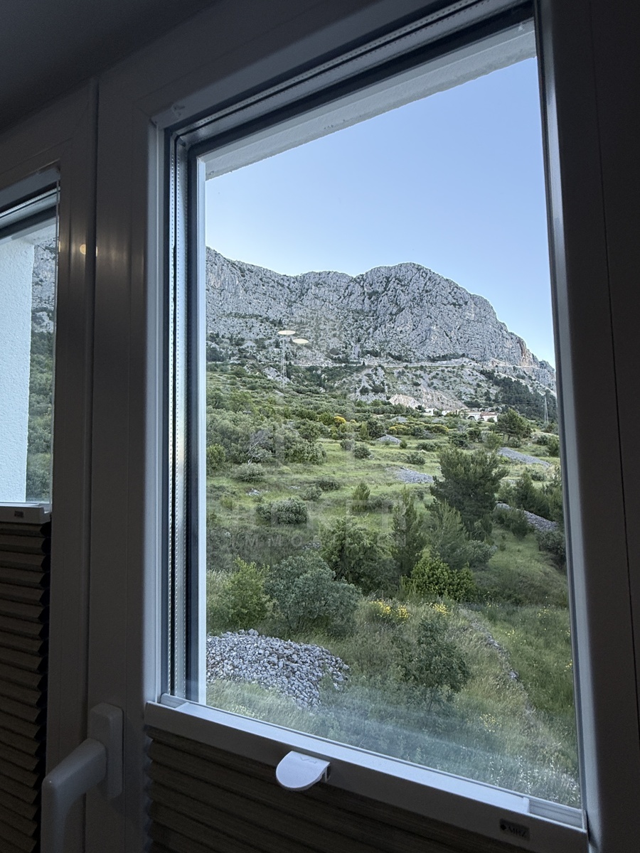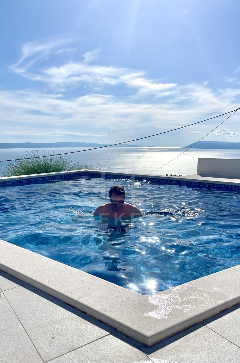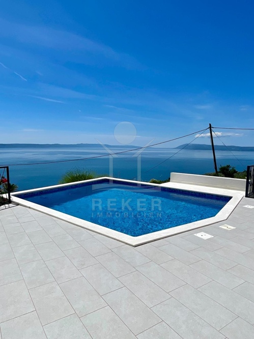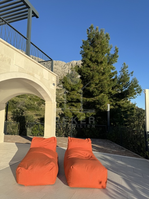Der Außenbereich ist auf entspannte Aufenthalte im Freien ausgelegt. Mittelpunkt ist der ca. 32 m² große Pool, der beheizt und gekühlt werden kann. Die großzügige Poolumrandung und eine Außendusche ergänzen die Anlage. Von hier aus genießen Sie den freien Blick über Podgora bis zur Adria. Das Grundstück umfasst ca. 500 m². Im Mai 2025 erhielt die Villa einen neuen Außenanstrich, ausgeführt von einer deutschen Fachfirma.