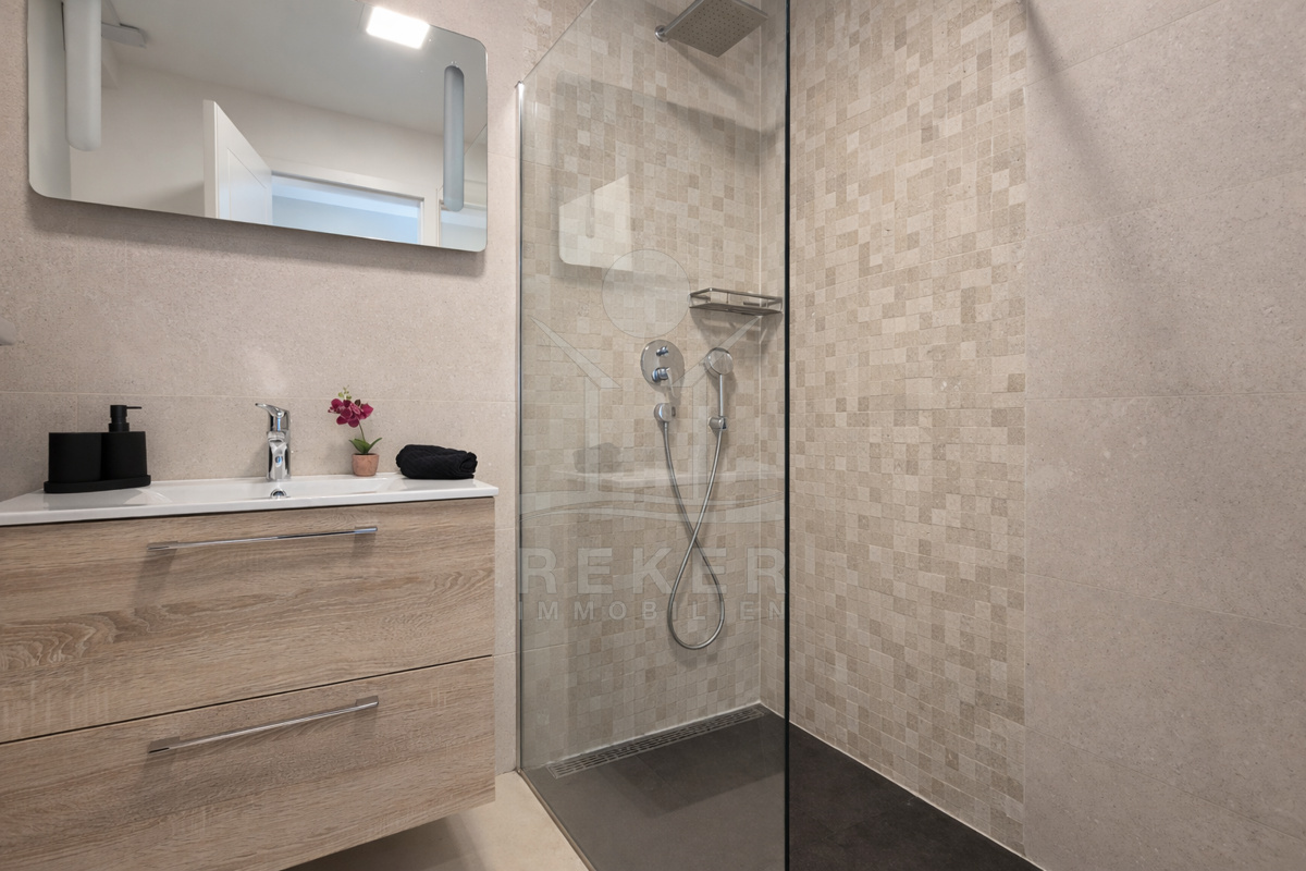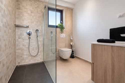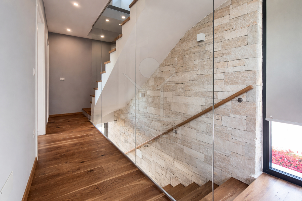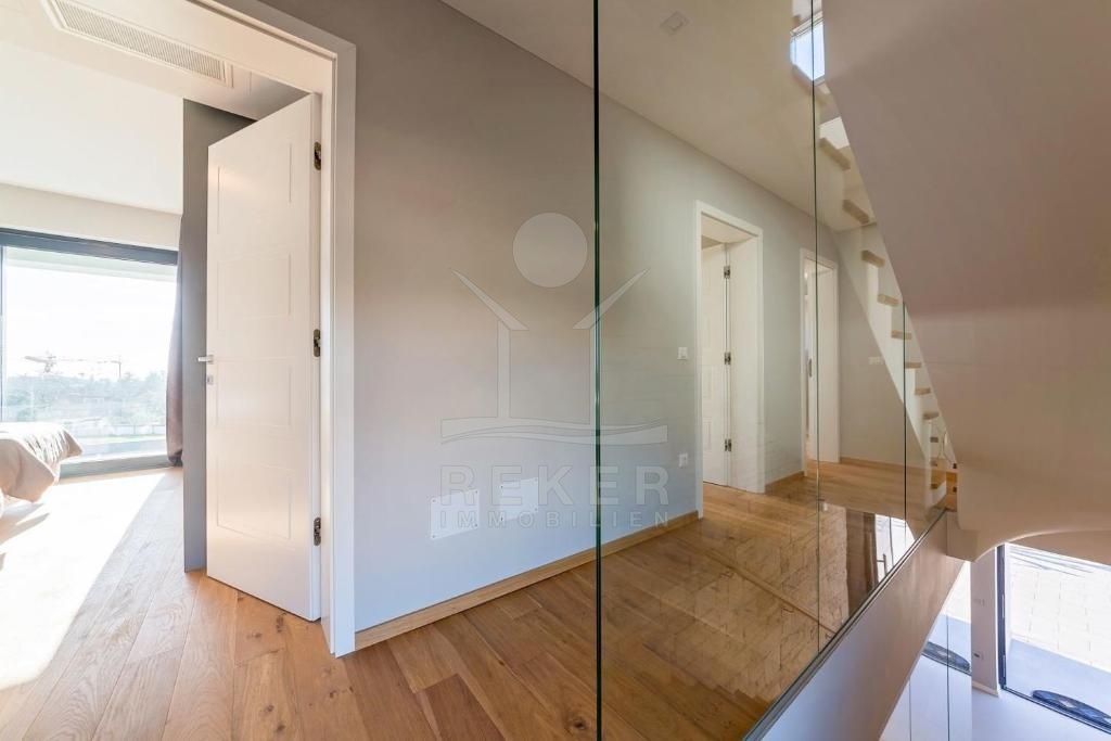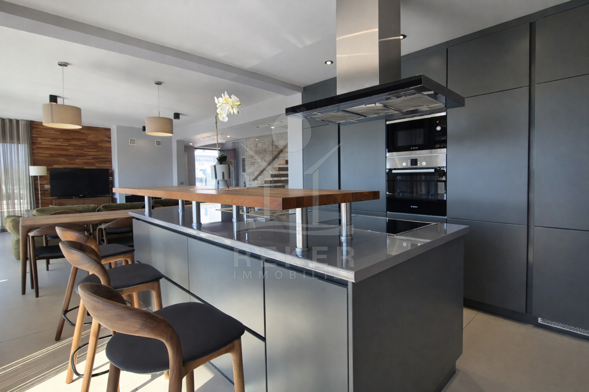 Eine elegante interne Holztreppe führt ins Obergeschoss, wo Sie 3 Schlafzimmer mit jeweils eigenen Badezimmern erwarten – ideal für Privatsphäre und Komfort. Ein weiteres Highlight ist die Dachterrasse mit Whirlpool, die einen atemberaubenden Blick auf die Umgebung und das Meer bietet – der perfekte Ort, um den Tag ausklingen zu lassen.