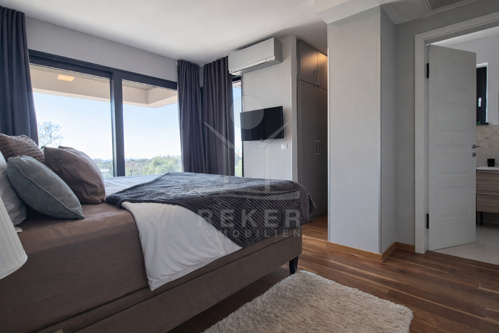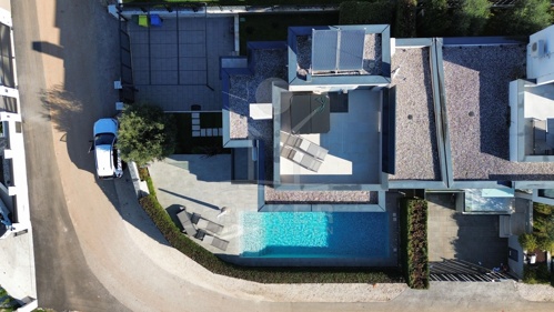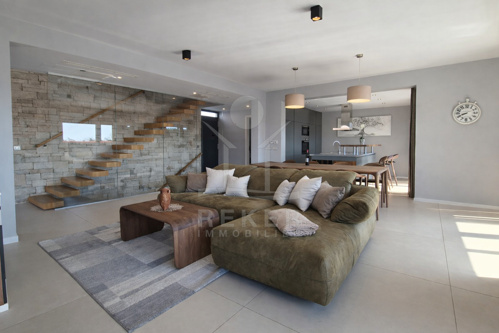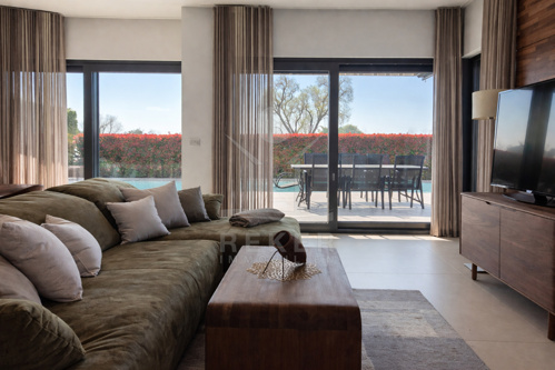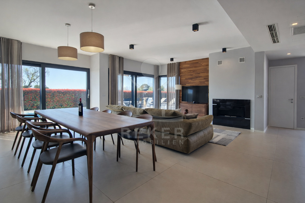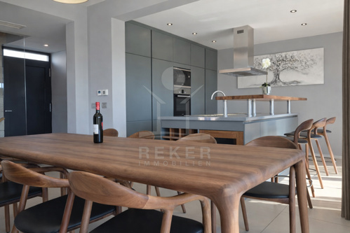 Die Villa ist mit einer Klimaanlage ausgestattet und wird mit stilvollen Designer-Möbeln verkauft, die den hohen Wohnkomfort unterstreichen. Im Erdgeschoss befindet sich ein offenes Wohnzimmer, das nahtlos in den Ess- und Küchenbereich übergeht und durch eine große Glasfront einen herrlichen Blick auf die Außenterrasse mit Pool bietet.