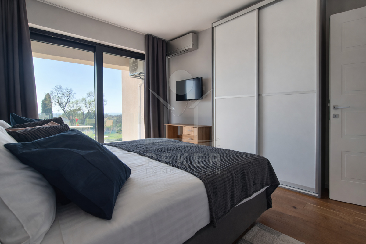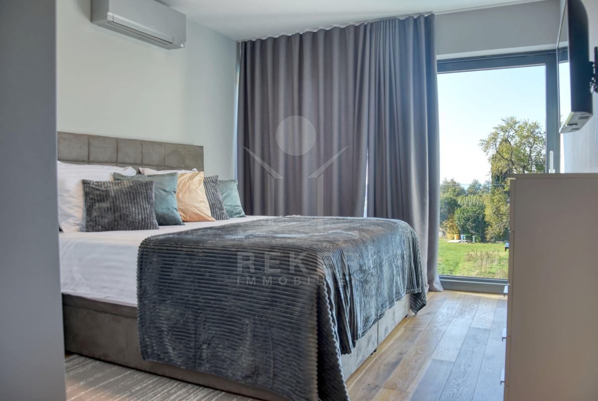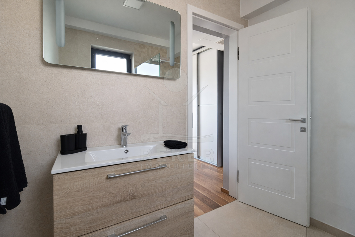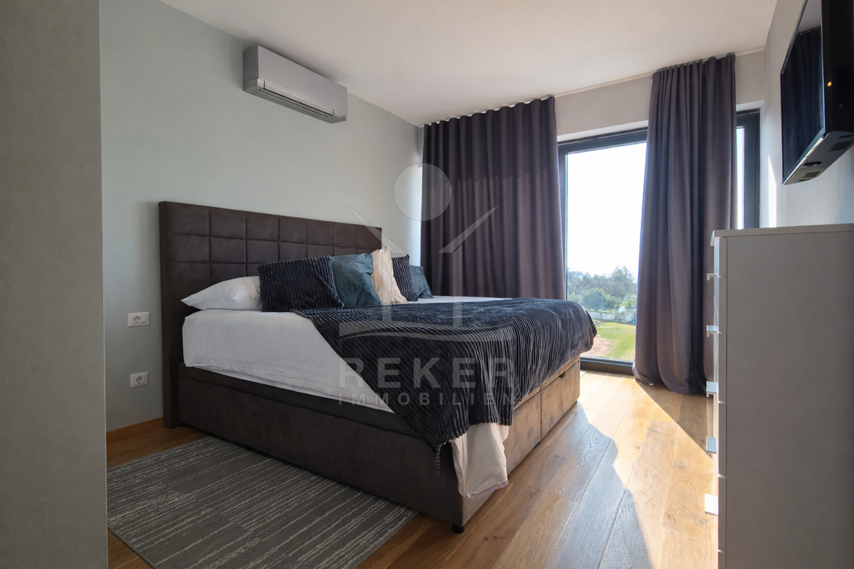 Die moderne Villa befindet sich in einer malerischen Lage eines charmanten Dorfes, umgeben von idyllischer ländlicher Schönheit und üppigem Grün. Der wunderschöne Strand ist nur 500 Meter entfernt, sodass Sie jederzeit einen erfrischenden Tag am Meer verbringen können. Zudem erreichen Sie das lebendige Stadtzentrum von Poreč in etwa 1,5 km, wo eine Vielzahl an Restaurants, Geschäften und kulturellen Attraktionen auf Sie warten.