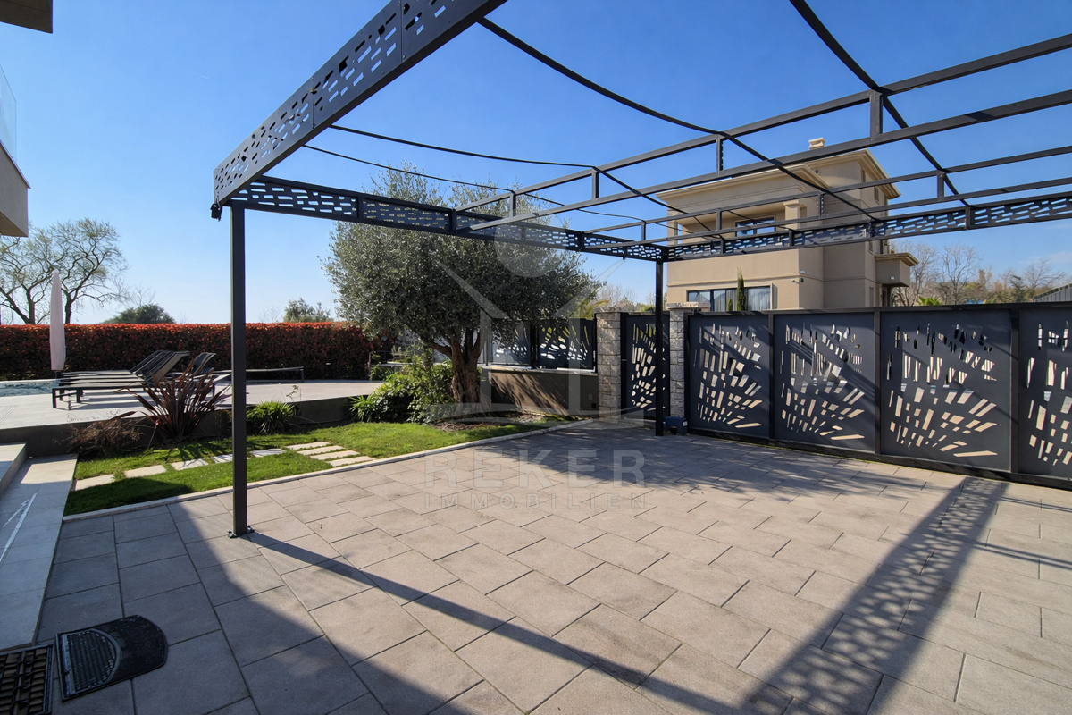 Die moderne Villa erstreckt sich über 2 Etagen und einen Keller, mit einer Wohnfläche von 250 m². Zwei Parkplätze stehen zur Verfügung, und die sichere Einzäunung sowie die grüne Hecke bieten Privatsphäre und Ruhe. Der Außenbereich ist ein wunderbarer Rückzugsort mit überdachter Terrasse, Grill und einem Swimmingpool, der Ihnen pure Entspannung und Urlaubsfeeling bietet.