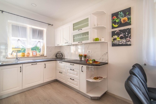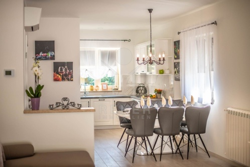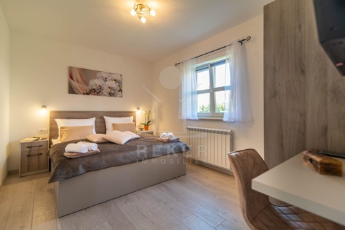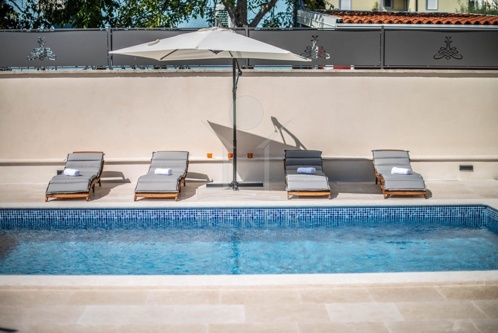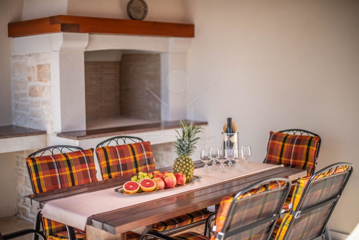 Der großzügige Außenbereich beherbergt eine Sonnenterrasse mit einem erfrischenden Pool (24,50 m²), der für Abkühlung sorgt. Der Poolbereich ist mit Kanfanar-Steinen ausgelegt und bietet ein sonniges Deck. Die Sommerküche mit Überdachung lädt zu Grillabenden ein, während die überdachte Terrasse geeignet ist, um bei jedem Wetter im Freien zu entspannen. Mit drei Stellplätzen müssen Sie sich keine Gedanken über Parkmöglichkeiten machen. Dieses Anwesen ist die ideale Oase für Entspannung und Unterhaltung in Poreč.