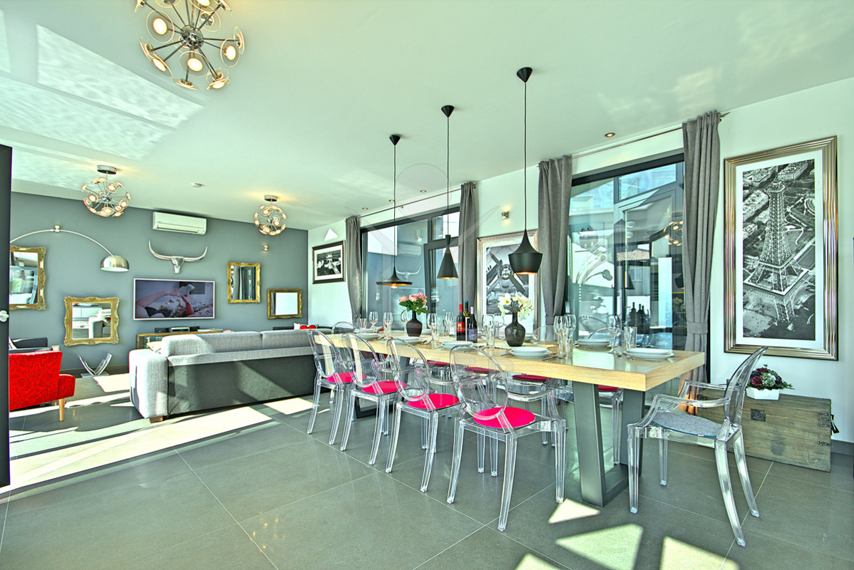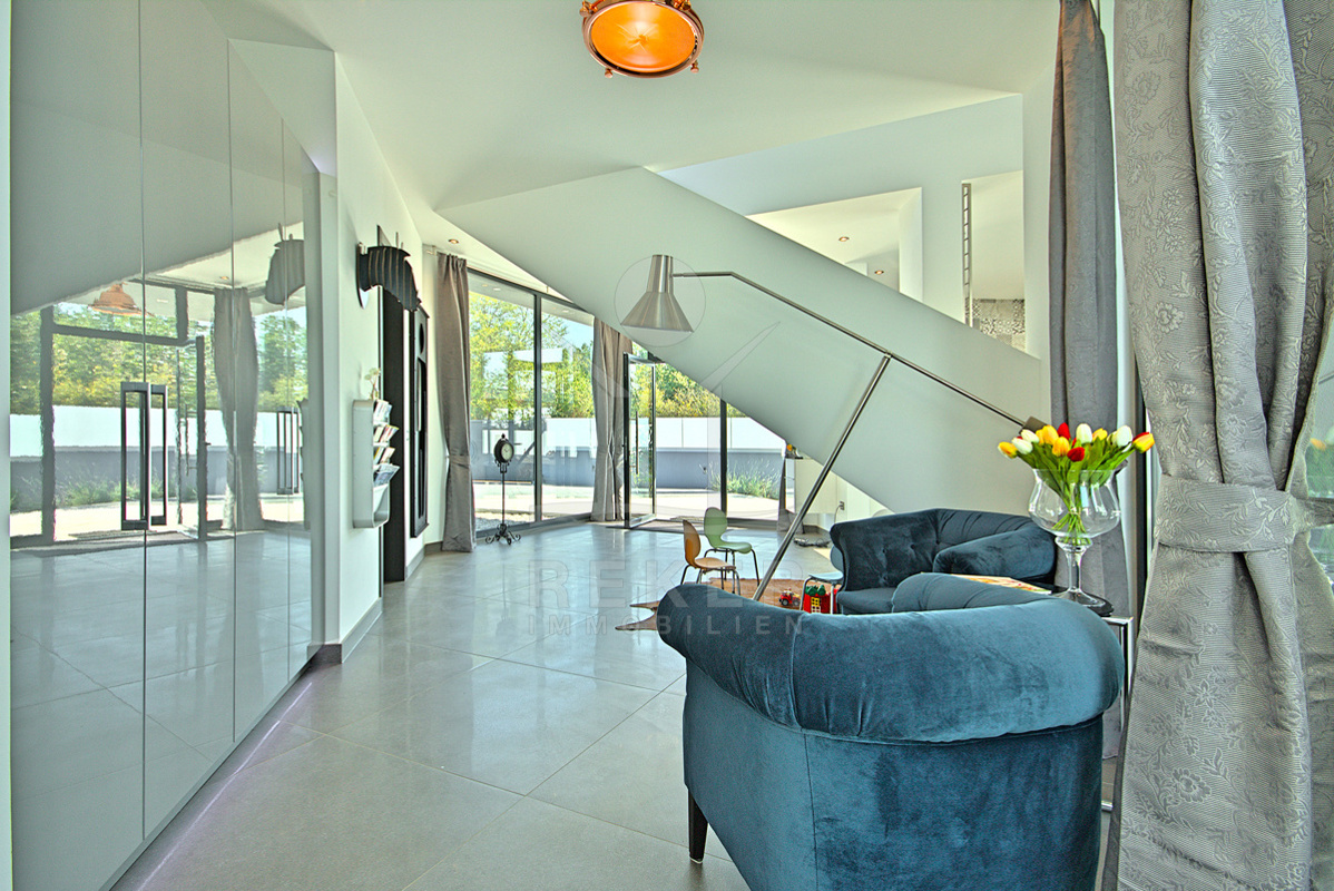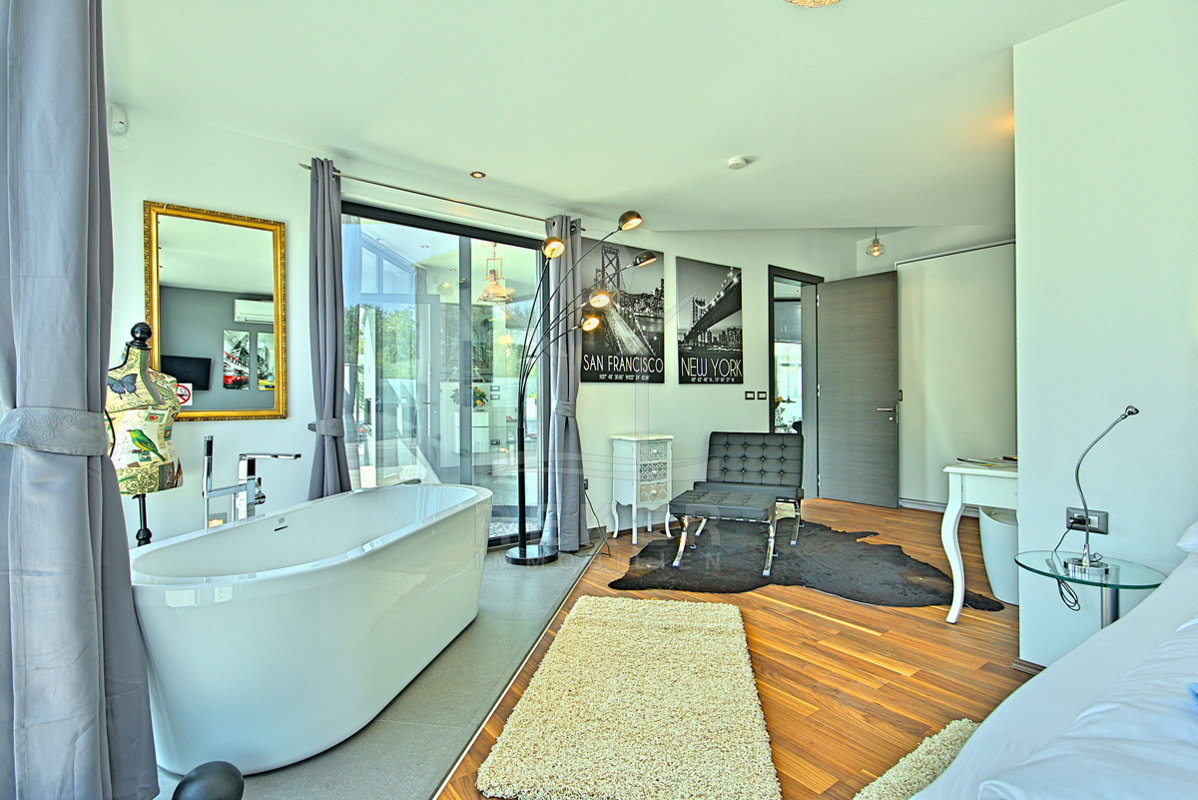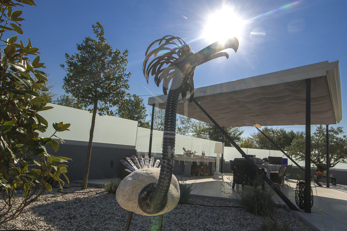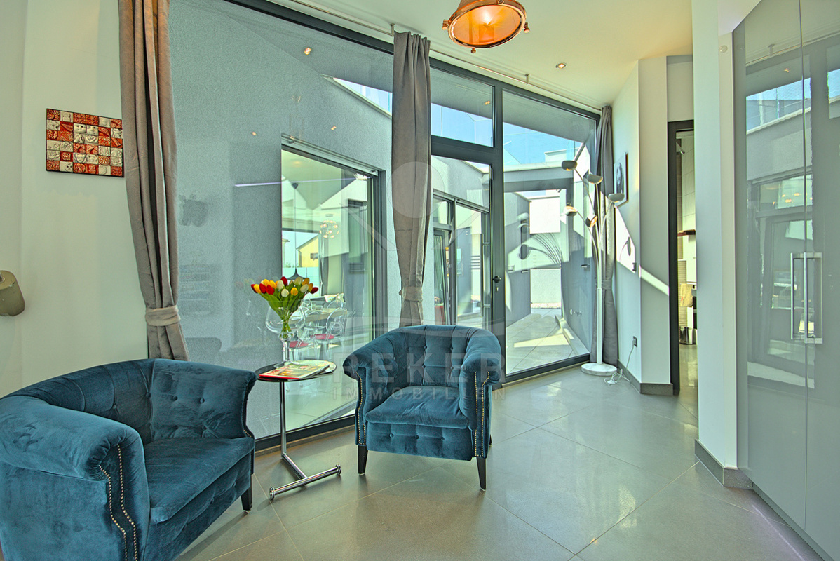 Die Villa bietet einen schön angelegten Garten, der harmonisch mit einer großen Terrasse verbunden ist. Eine beeindruckende 38 m² große Swimmingpool-Anlage, ausgestattet mit einer Außendusche und genügend Liegeplätzen, verwandelt den Außenbereich in einen privaten Vergnügungsort. Der überdachte Bereich mit einer stilvollen Sitzlounge lädt zur Entspannung ein und ist perfekt für gesellige Abende mit Freunden und Familie.
