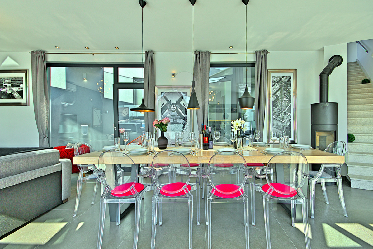 Erdgeschoss: herrlicher Wohnbereich mit Kamin, Ess- & voll ausgestatteter Küche, direkter Poolbereich
