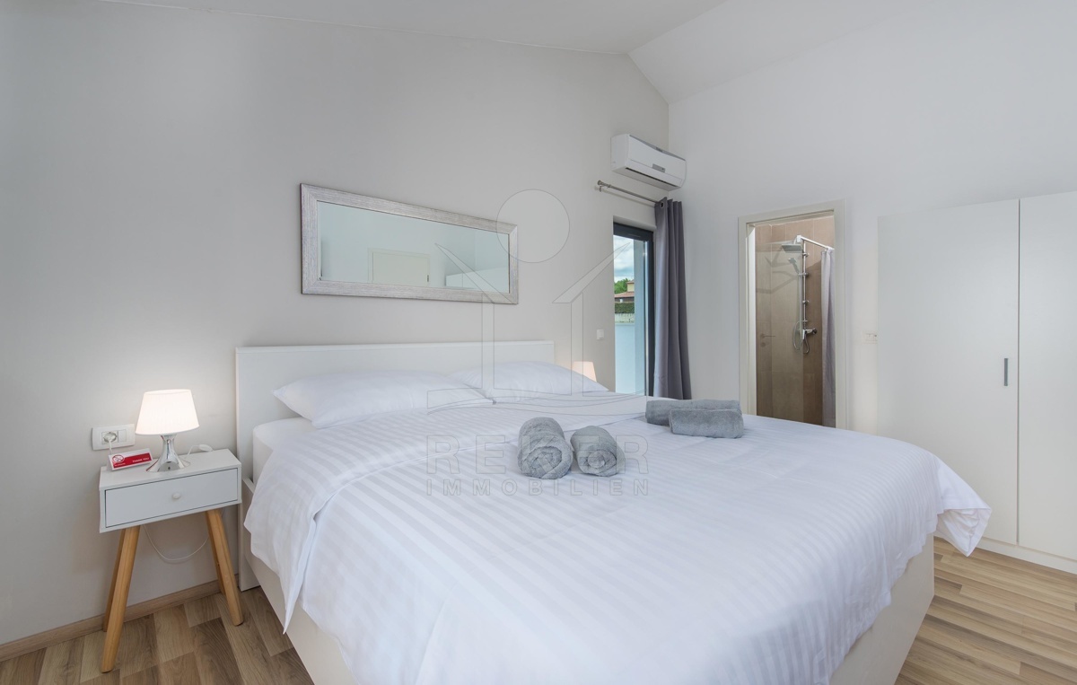 Im Obergeschoss befinden sich 3 komfortable Schlafzimmer, die für Ruhe und Privatsphäre sorgen. Zwei moderne Badezimmer bieten zusätzlichen Komfort, während eine großzügige Terrasse mit Meerblick der perfekte Ort ist, um den Sonnenuntergang zu genießen. Alle Zimmer sind klimatisiert, um das ganze Jahr über ein angenehmes Raumklima zu gewährleisten.