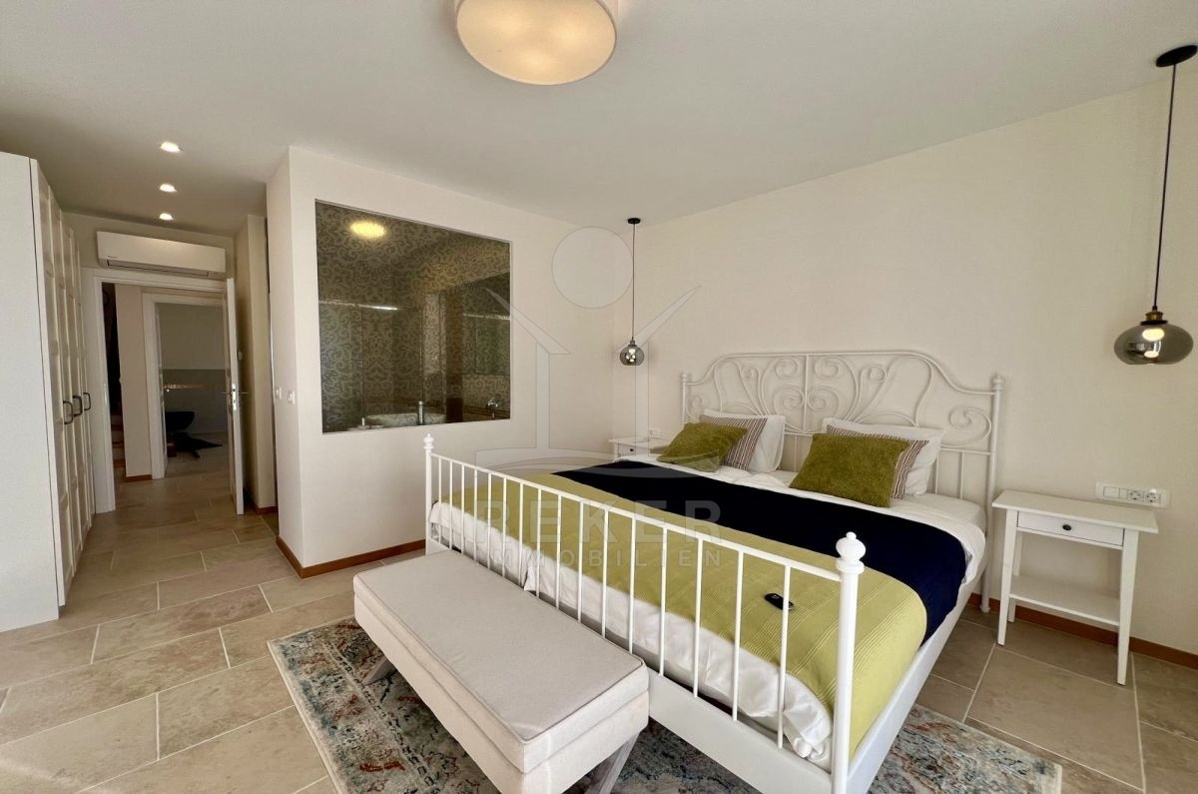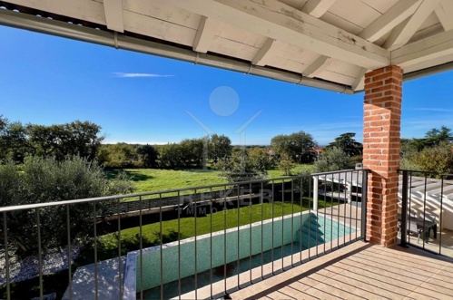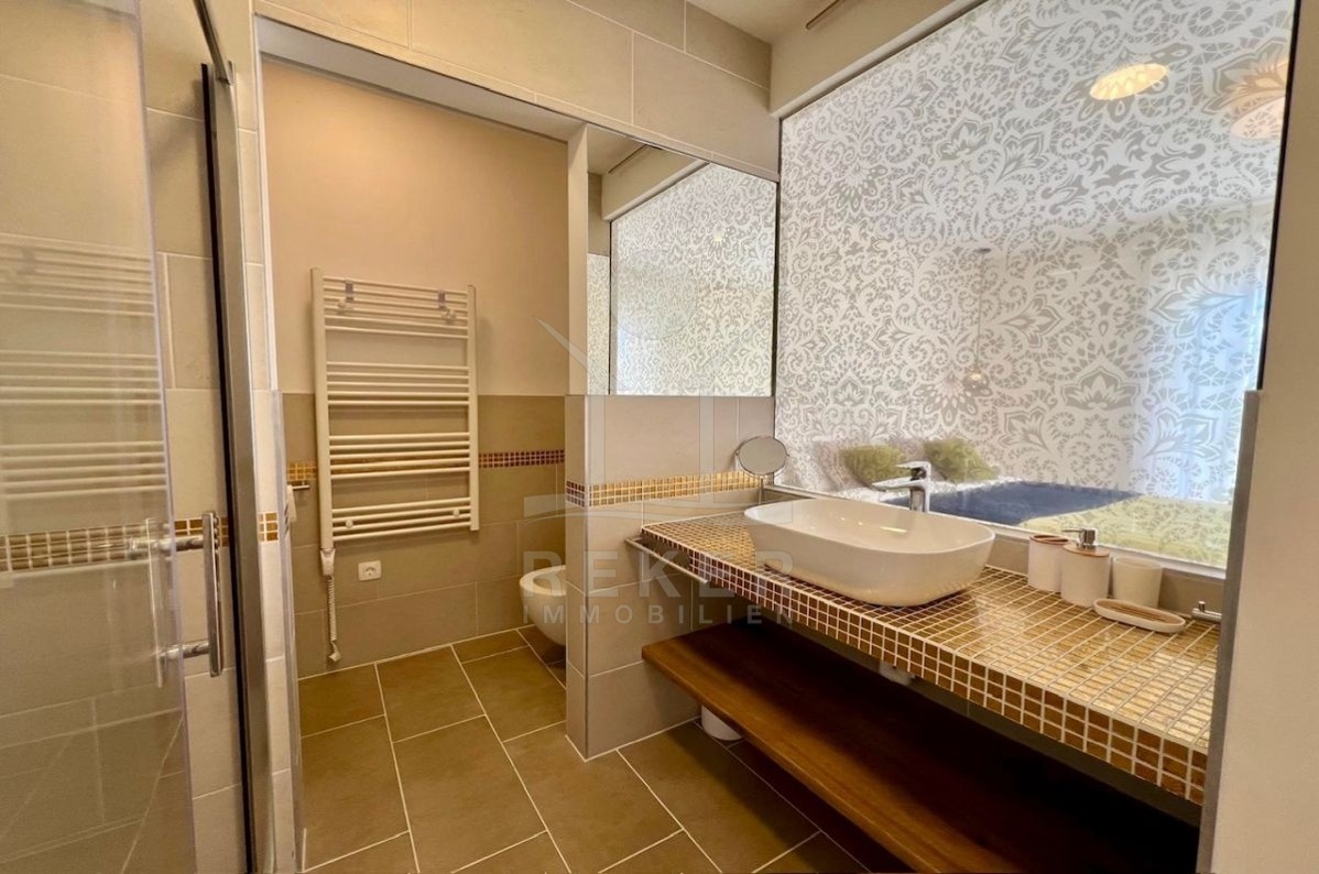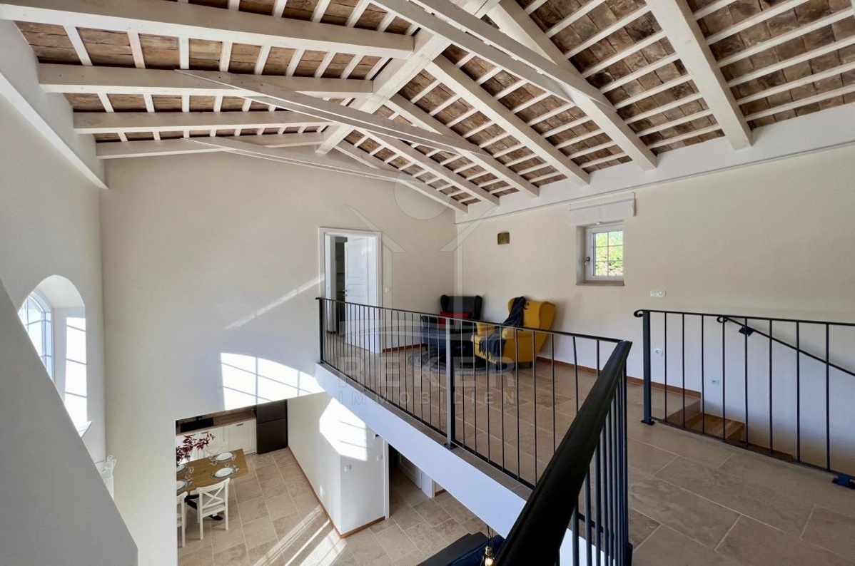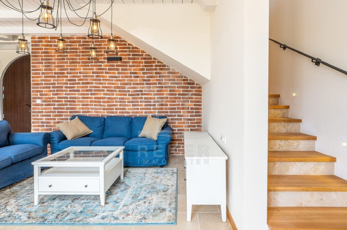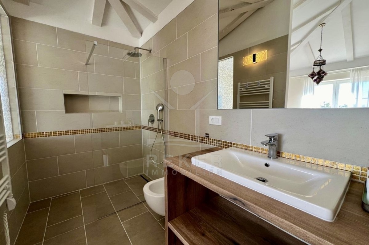 Im Obergeschoss warten zwei weitere Schlafzimmer, jeweils mit eigenem Bad und privater Terrasse. Eine luftige Galerie verbindet die Räume und sorgt für ein offenes, angenehmes Raumgefühl. Fußbodenheizung, Kamin und Klimaanlage garantieren zu jeder Jahreszeit hohen Wohnkomfort. Ob dauerhaftes Zuhause oder Ferienrefugium, diese Villa bietet alles, was ein entspanntes Leben in Istrien ausmacht.