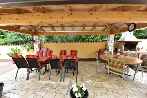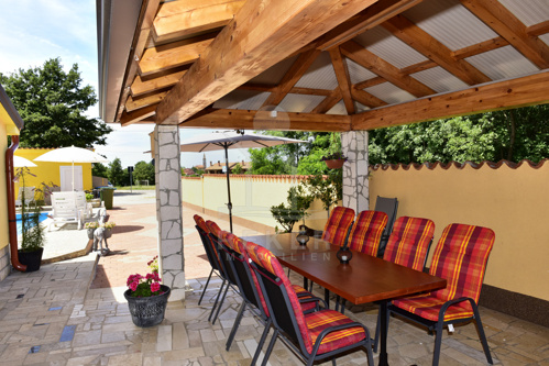 Die Außenanlage der Villa lädt zu entspannten Stunden im Freien ein. Ein 24 m² großer Pool mit Außendusche bietet Erfrischung, während Liegestühle rundherum zum Sonnenbaden einladen. Ein überdachter Bereich mit eingebautem Steingrill sorgt für kulinarische Genüsse und gesellige Treffen im Freien. Eine Pergola mit Sitzgelegenheiten bietet zusätzlichen schattigen Platz zum Entspannen und Genießen. Diese mediterrane Terrasse wurde geschaffen, um Spaß, Freude und unvergessliche Momente mit Freunden und Familie zu erleben.
