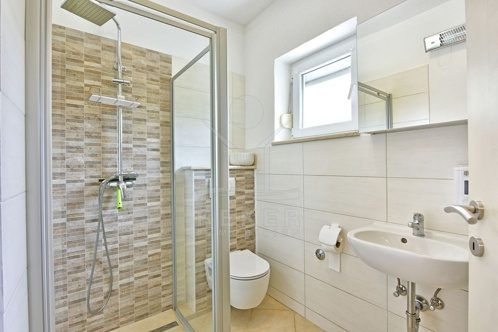 Die externe zweiläufige Treppe führt in den 1. Stock, die höchste Etage des Hauses. Auf 107,48 m² erwarten Sie zwei weitere Ferienwohnungen und ein Flur für einen angenehmen Aufenthalt.