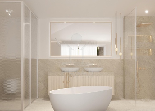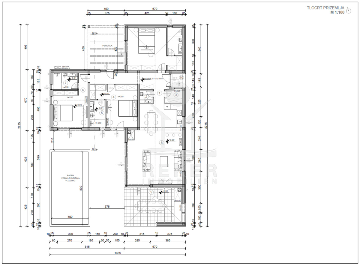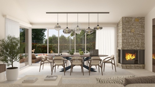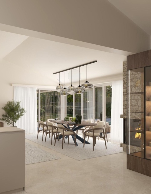 Die Villa bietet 156 m² Wohnfläche auf einer Ebene. Der offene Wohnbereich mit Kamin, Esszone und moderner Küche öffnet sich durch große Glasflächen zur Terrasse und zum Pool. Drei Schlafzimmer, jeweils mit eigenem Bad, bieten Rückzug und Bequemlichkeit. Ergänzt wird der Grundriss durch ein Gäste-WC und einen Abstellraum. Hohe Decken und gezielte Beleuchtung betonen den großzügigen Charakter der Räume.
