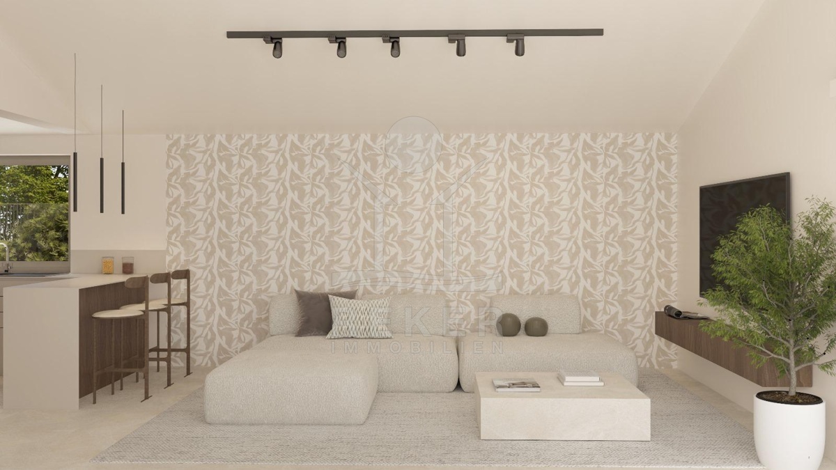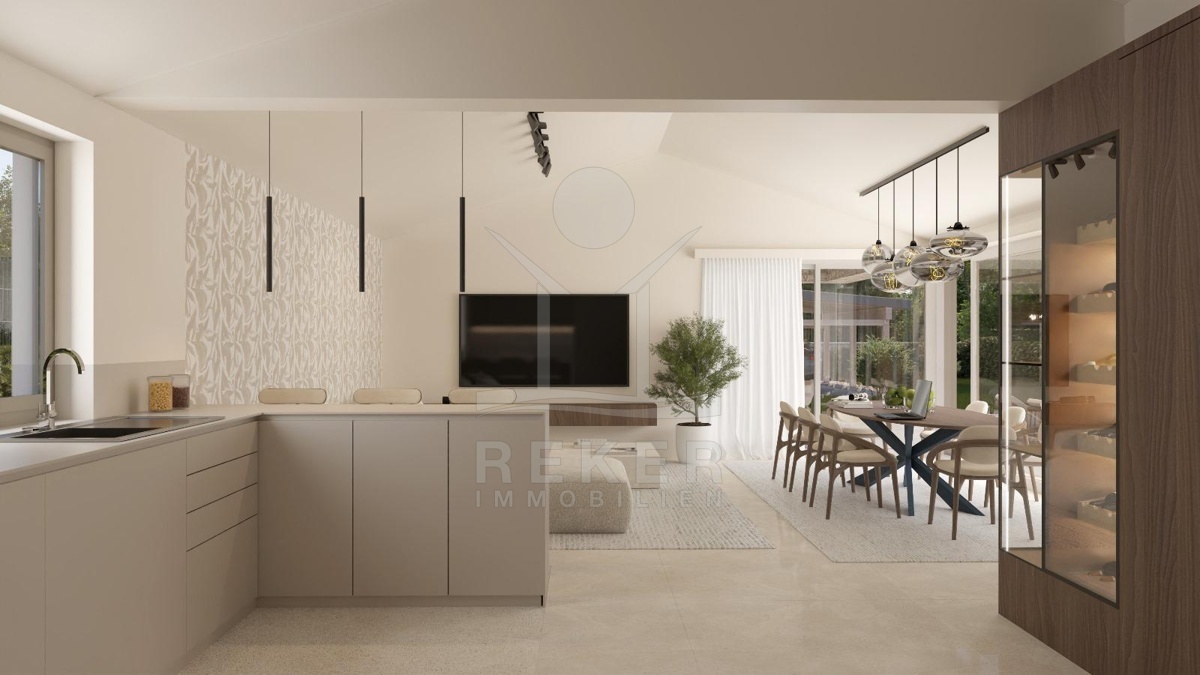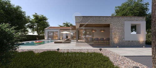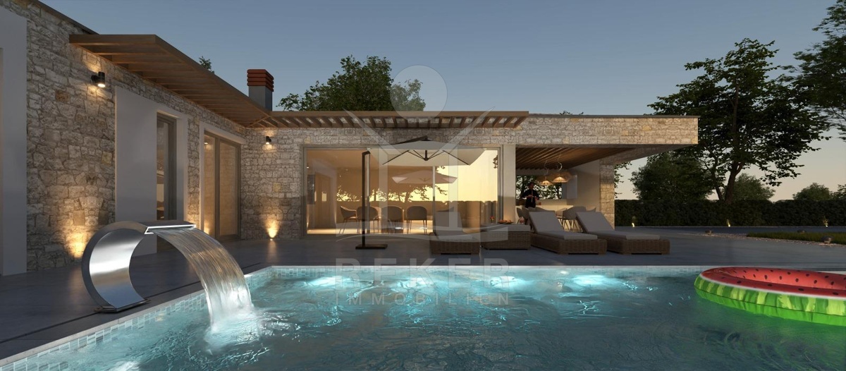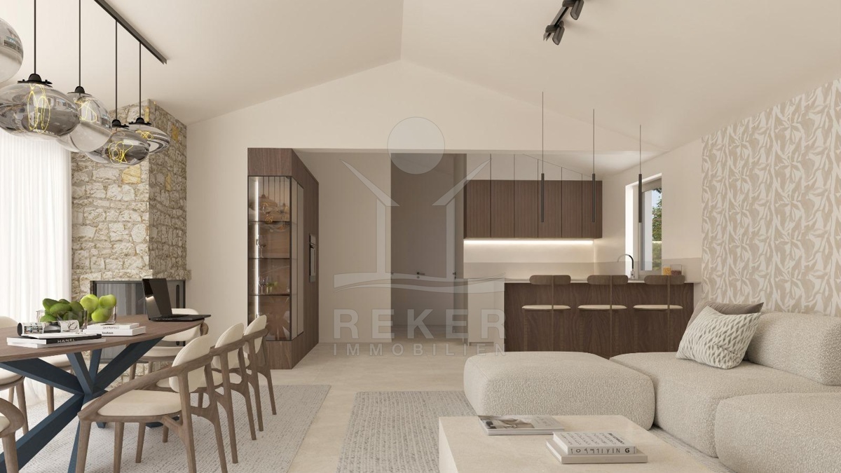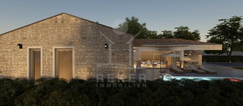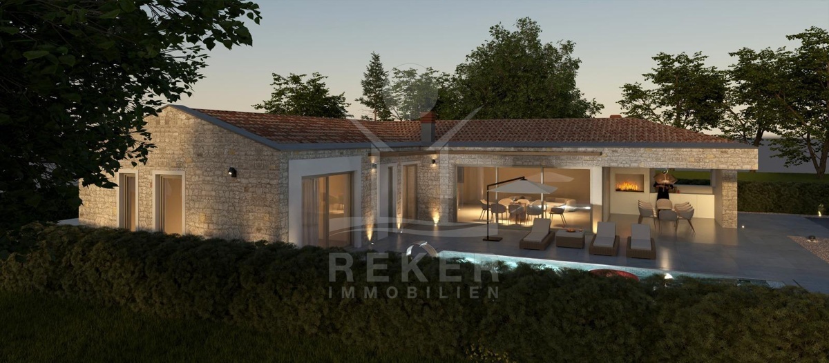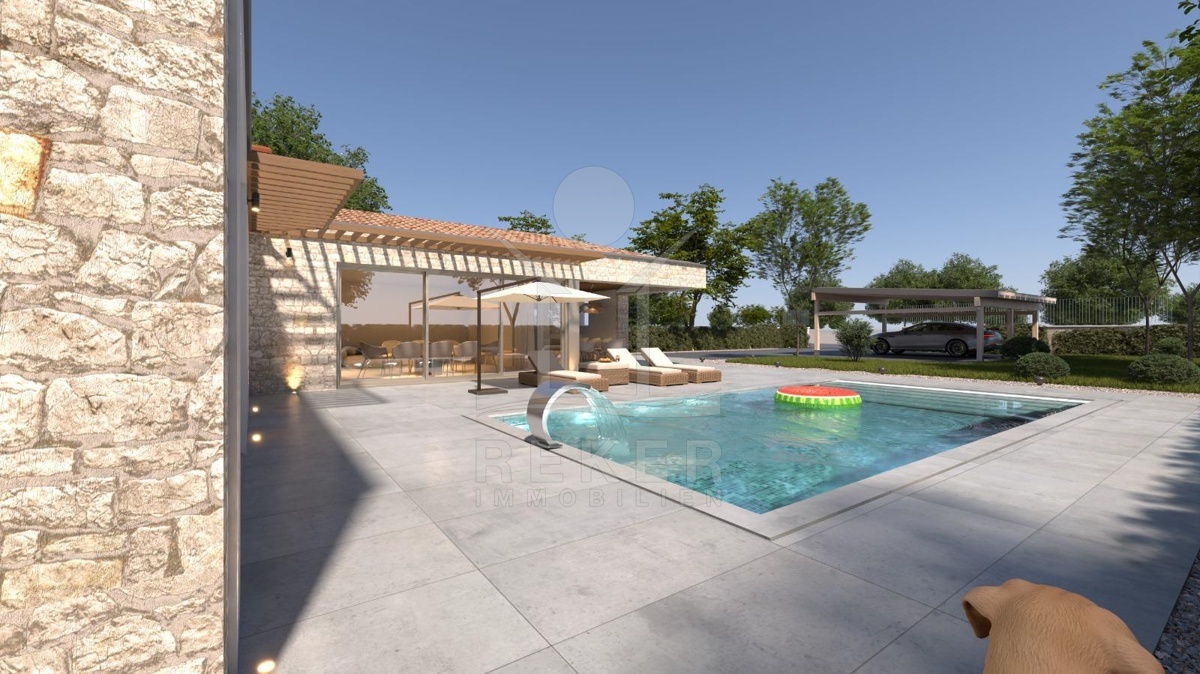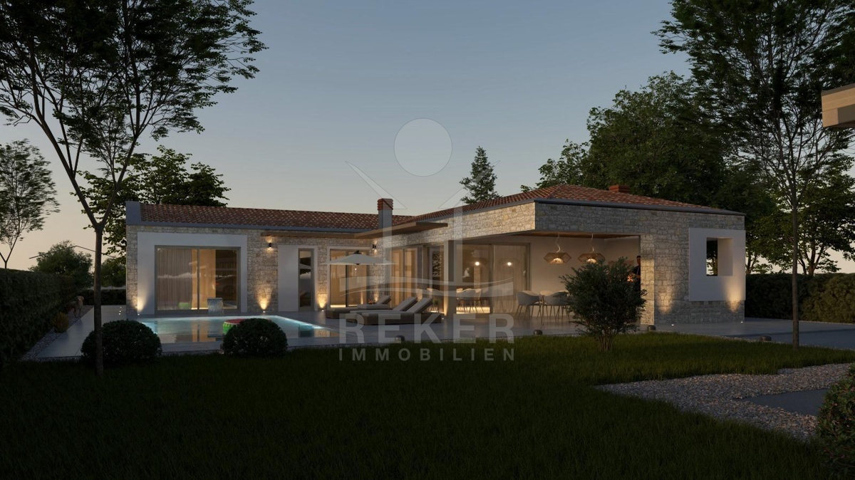 Etwa 16 Kilometer von Poreč und der Adria entfernt entsteht eine Villa, die modernes Wohnen und istrische Bautradition verbindet. Am Rand eines kleinen Dorfes, umgeben von Wiesen und Wäldern, bietet das 1.000 m² große Grundstück viel Raum und Privatsphäre. Eine gepflegte Zufahrt führt direkt zu vier Stellplätzen neben dem Haus.