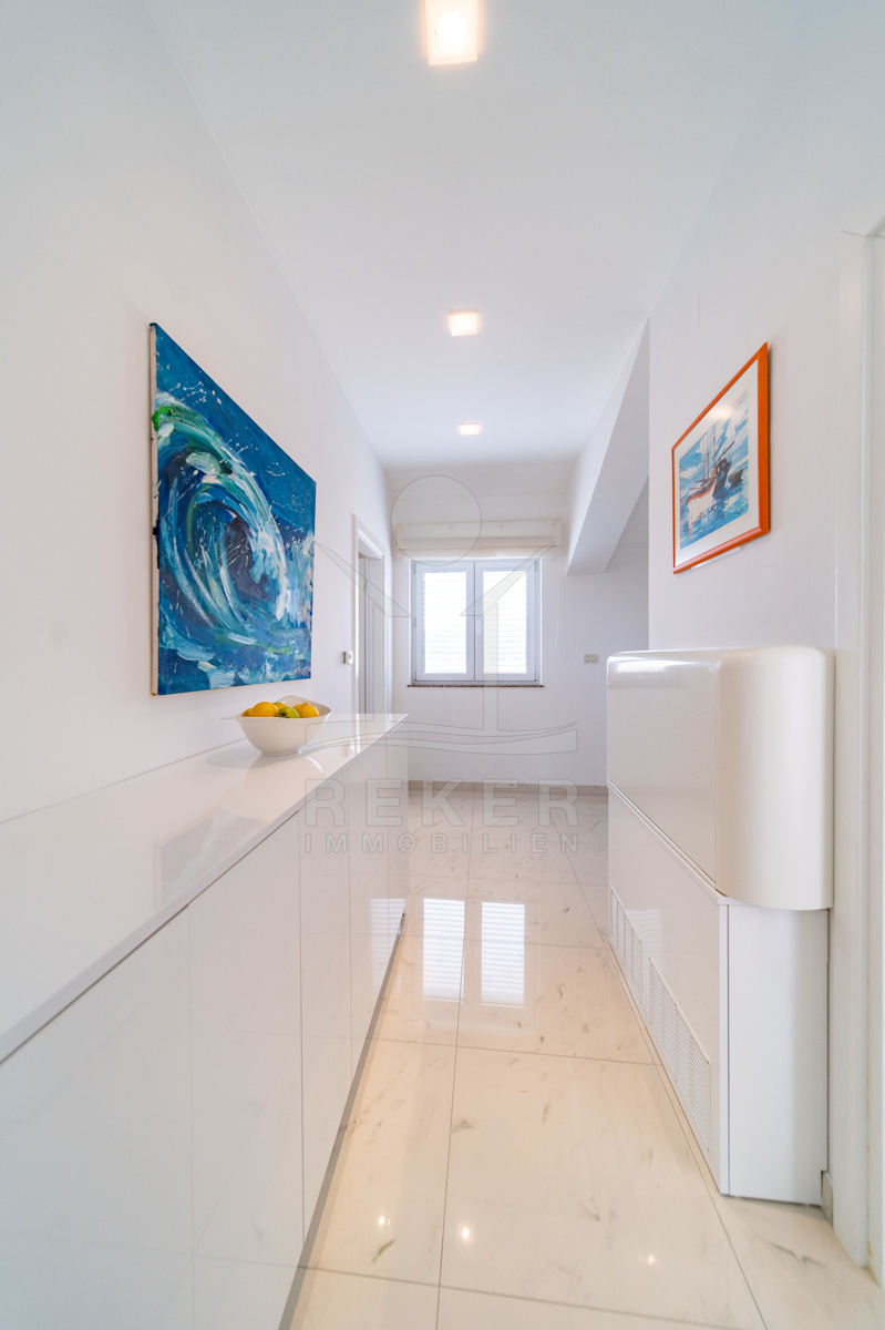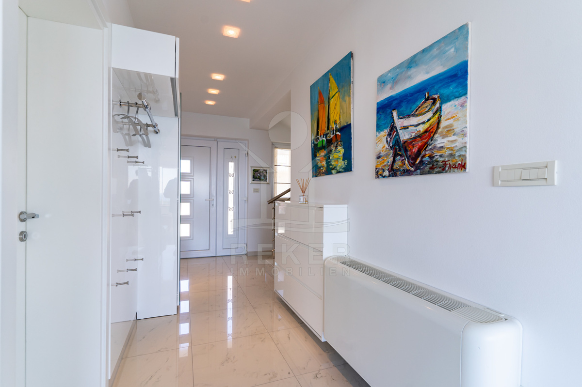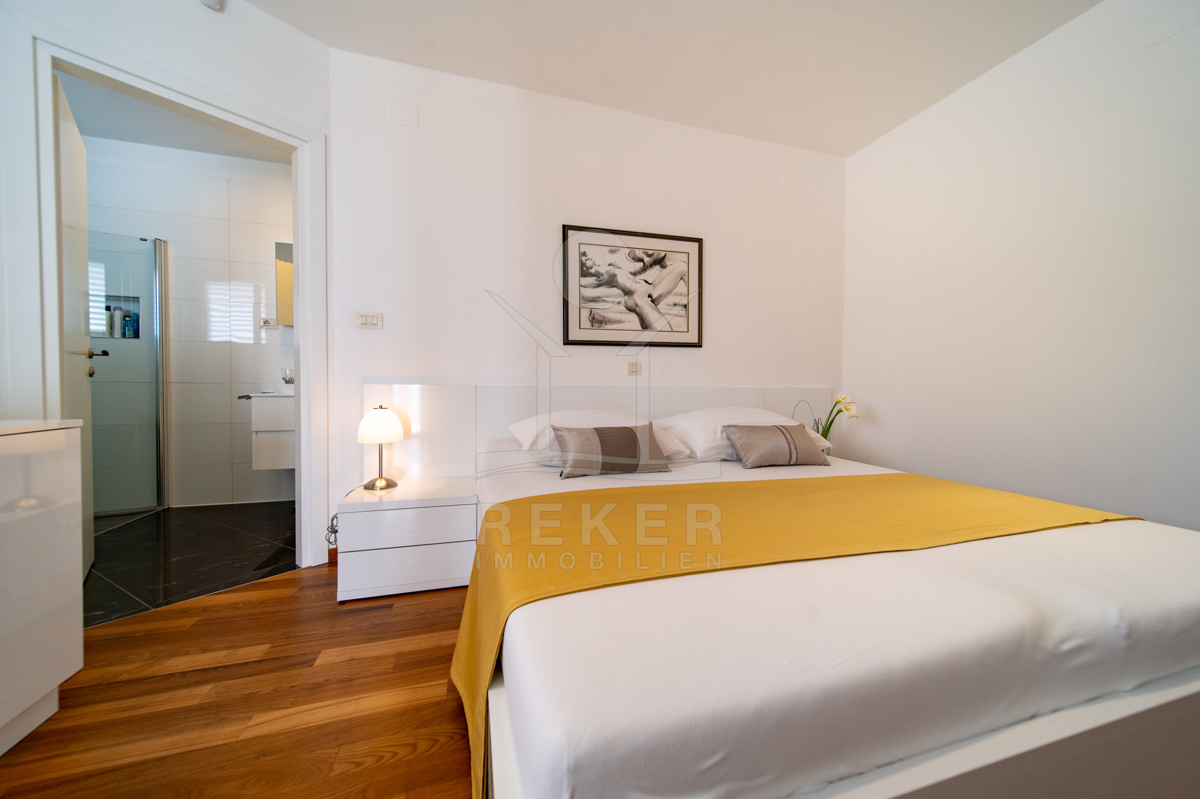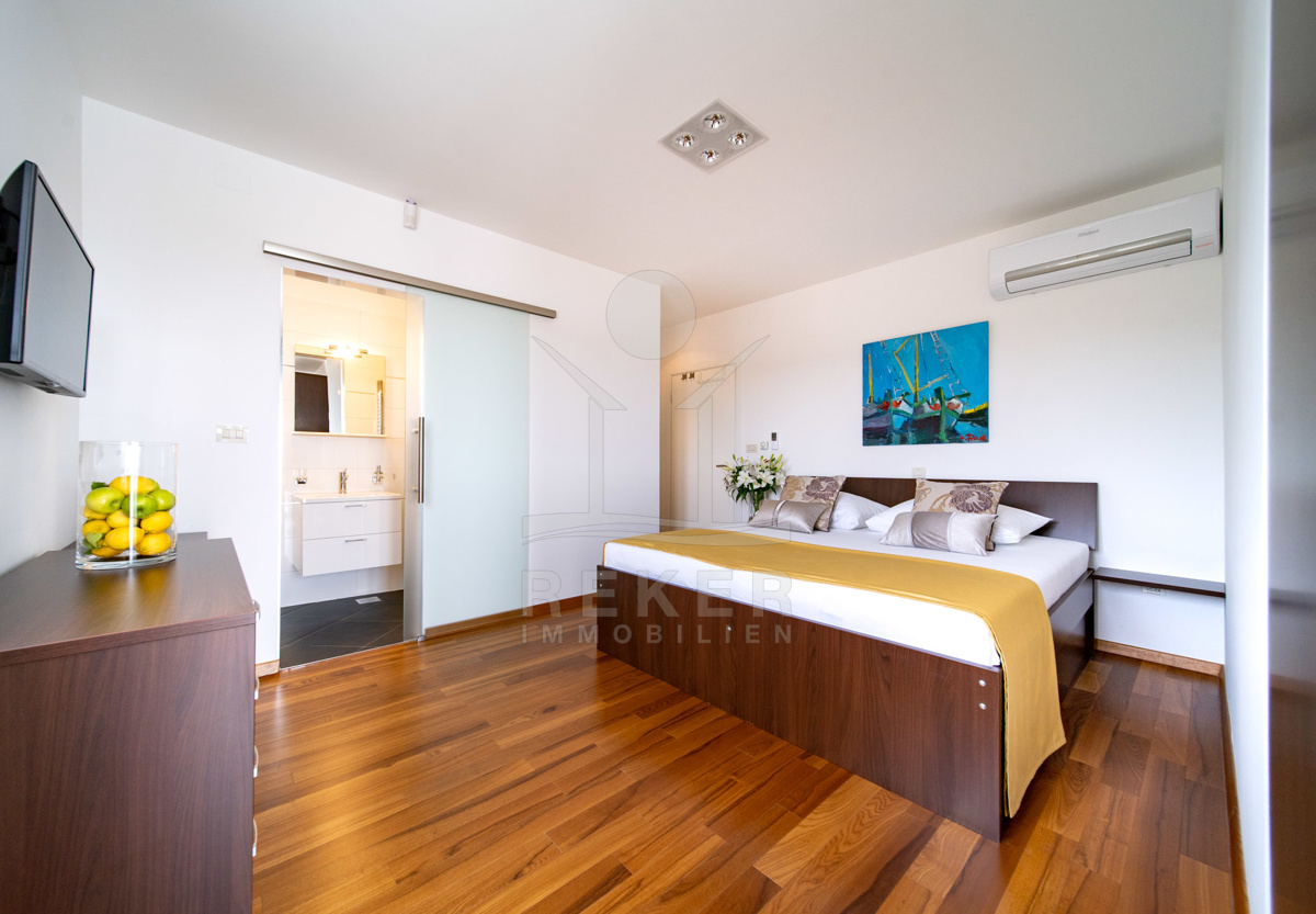 Im Obergeschoss befinden sich 3 Schlafzimmer, jedes mit eigenem Bad und Ausgang zum Balkon mit spektakulärem Meerblick. Eine Fußbodenheizung bereichert die klimatisierte Wohlfühloase, die stilvoll und luxuriös möbliert verkauft wird.
