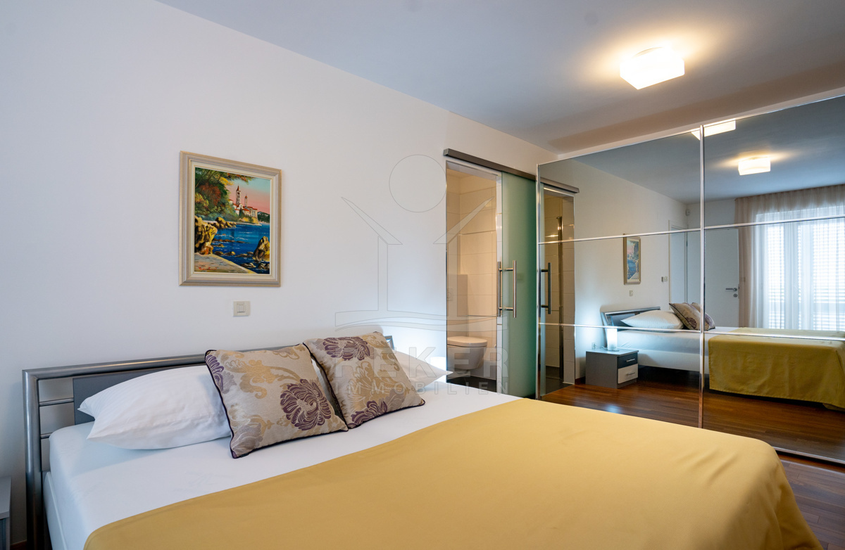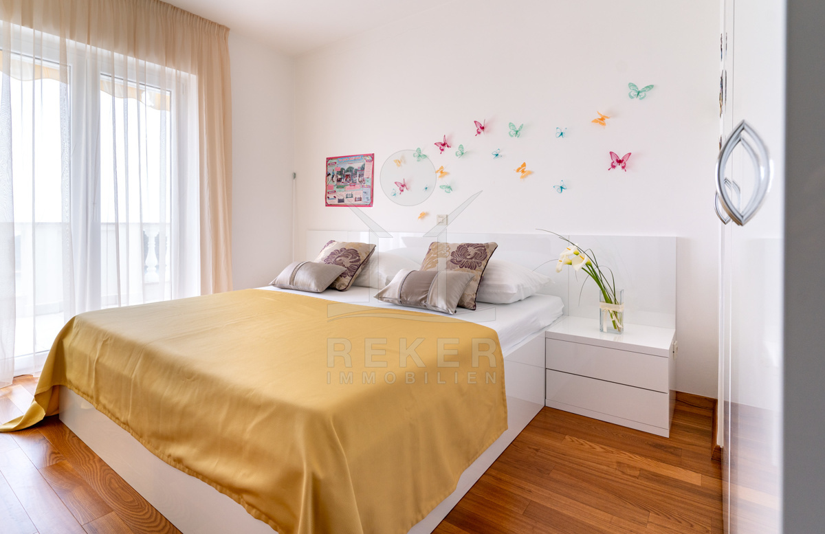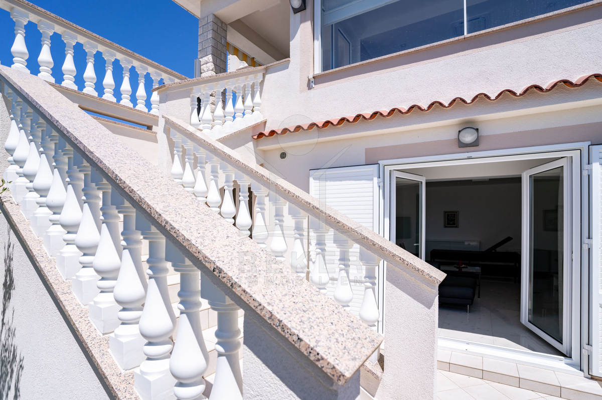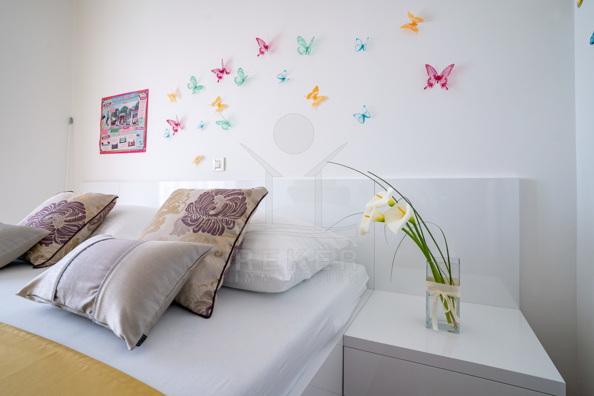 Im Obergeschoss befinden sich 3 Schlafzimmer, jedes mit eigenem Bad und Ausgang zum Balkon mit spektakulärem Meerblick. Eine Fußbodenheizung bereichert die klimatisierte Wohlfühloase, die stilvoll und luxuriös möbliert verkauft wird.