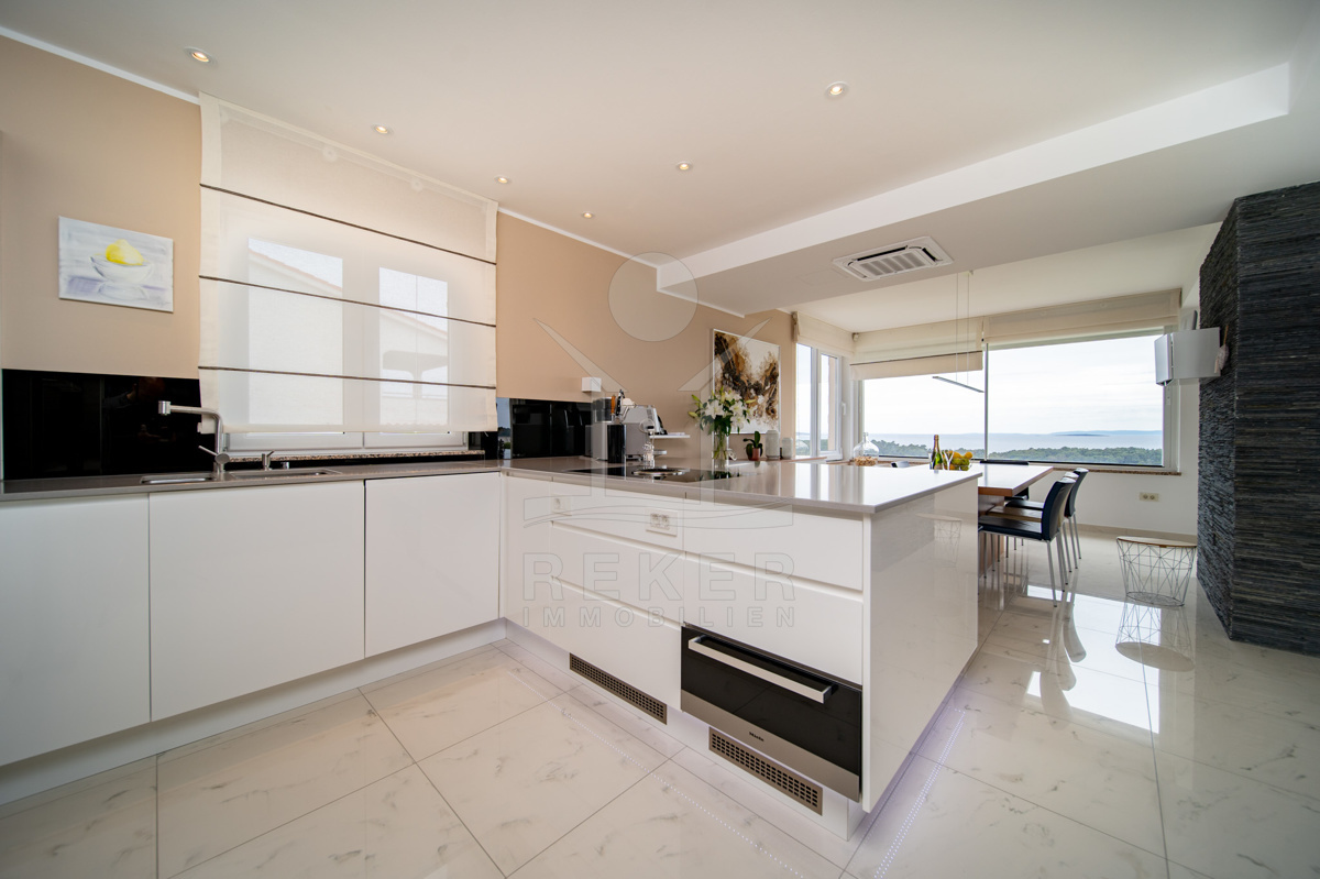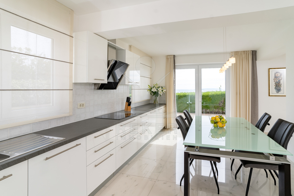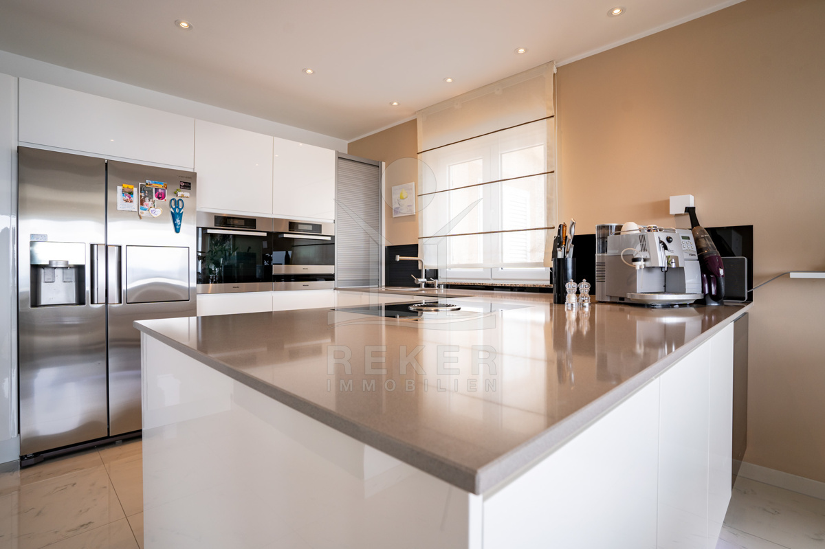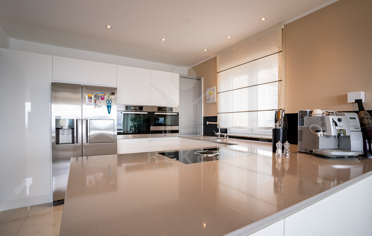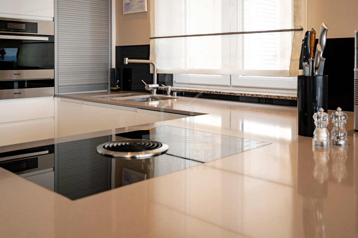 Die Küche im Wohnbereich verfügt über Geräte inklusive eines Weinschranks von Miele und einem Kochfeld von Bora. Der zauberhafte Kamin im Wohnzimmer sichert Ihnen in der kalten Jahreszeit wohlige Wärme mit einem Hauch Romantik.