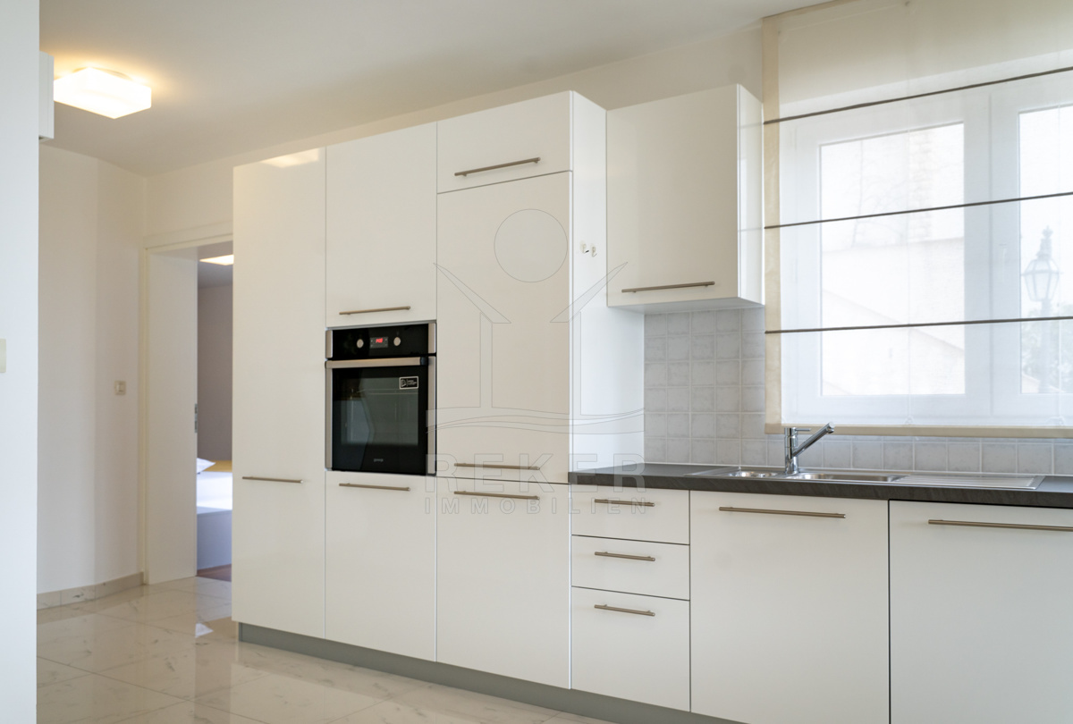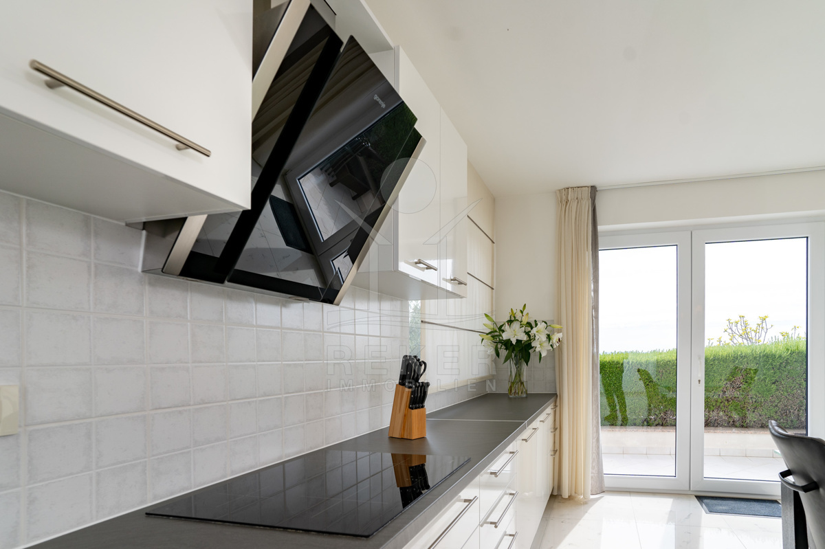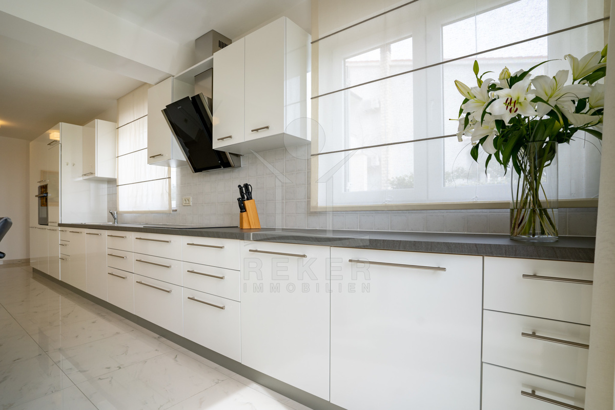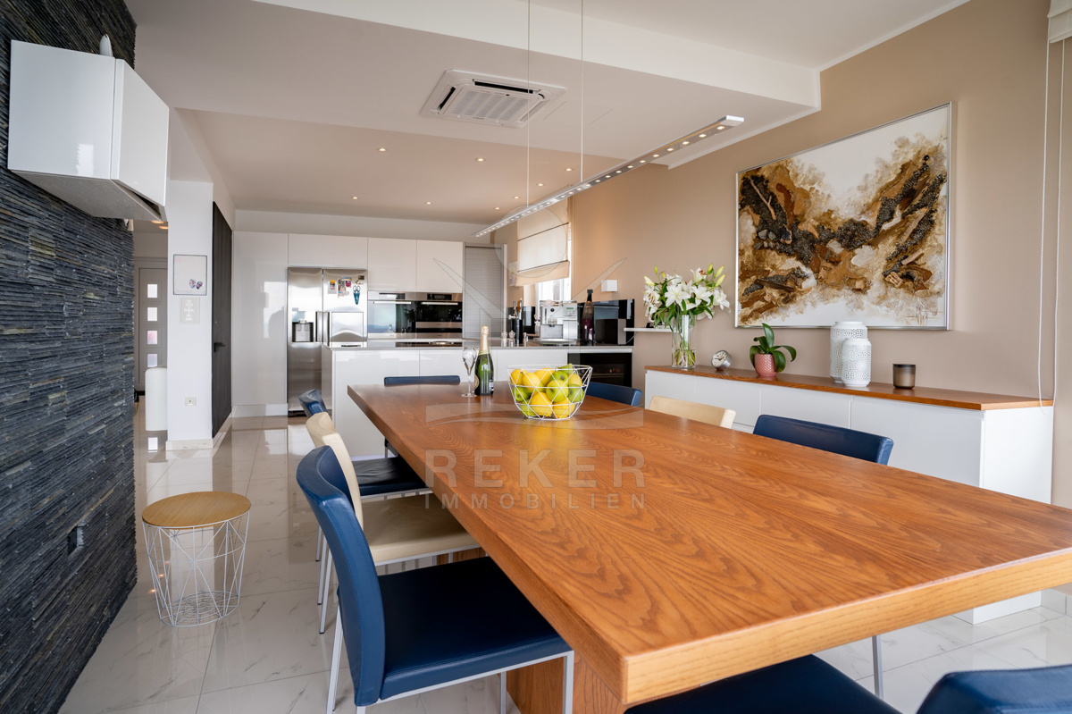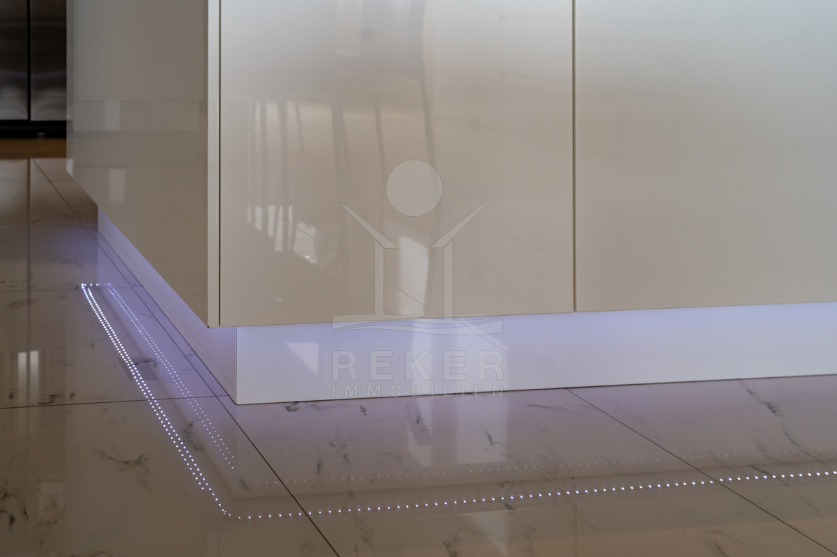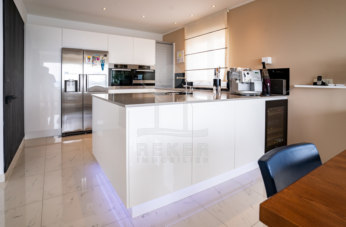 Die Küche im Wohnbereich verfügt über Geräte inklusive eines Weinschranks von Miele und einem Kochfeld von Bora. Der zauberhafte Kamin im Wohnzimmer sichert Ihnen in der kalten Jahreszeit wohlige Wärme mit einem Hauch Romantik.