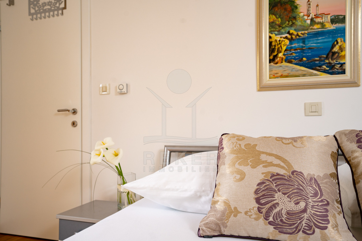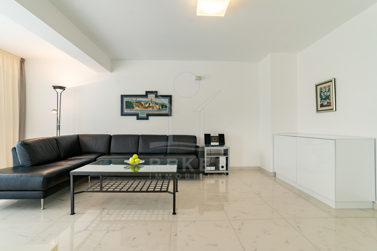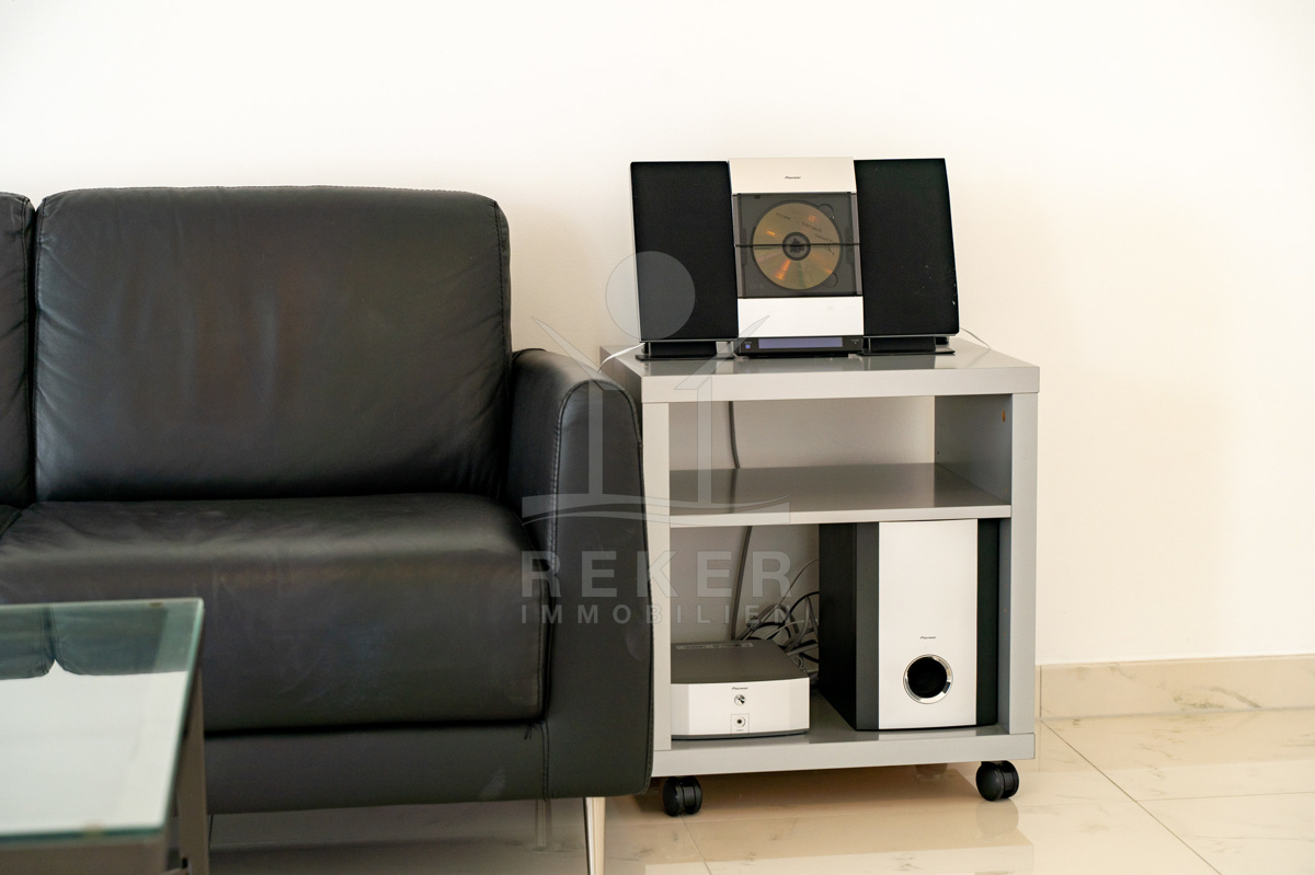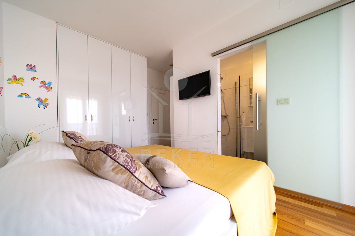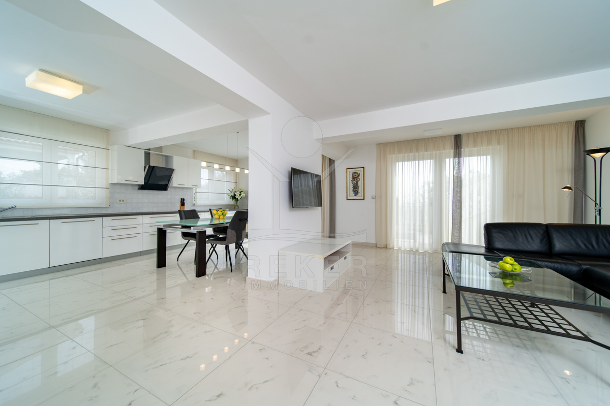 Die Küche im Wohnbereich verfügt über Geräte inklusive eines Weinschranks von Miele und einem Kochfeld von Bora. Der zauberhafte Kamin im Wohnzimmer sichert Ihnen in der kalten Jahreszeit wohlige Wärme mit einem Hauch Romantik.