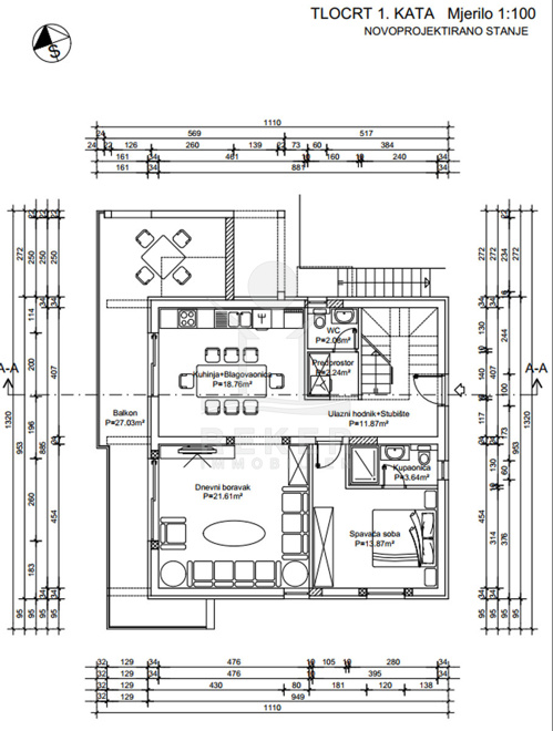 Im 1. Obergeschoss erwartet Sie eine elegante 2-Zimmerwohnung, die aus einem Flur, einem WC, einem Schlafzimmer mit eigenem Bad sowie einem Wohnzimmer mit Ess- und Küchenbereich besteht. Ein Highlight ist der zugängliche Balkon von 27 m², ideal für entspannte Stunden im Freien.