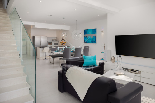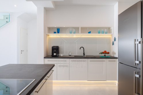Die Villa ist über drei Etagen aufgeteilt. Im Erdgeschoss wohnen Sie offen und hell – mit moderner Küche und direktem Zugang zur Terrasse. Drei Schlafzimmer mit jeweils eigenem Bad liegen im mittleren Stock, eines davon mit zusätzlichem Kinderzimmer. Oben erwartet Sie ein separates Studio-Apartment – ideal für Gäste oder zur Vermietung. Alles komplett möbliert, alles sofort bezugsfertig. Und egal in welchem Raum Sie stehen: Der Meerblick ist immer dabei.