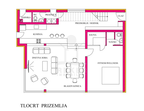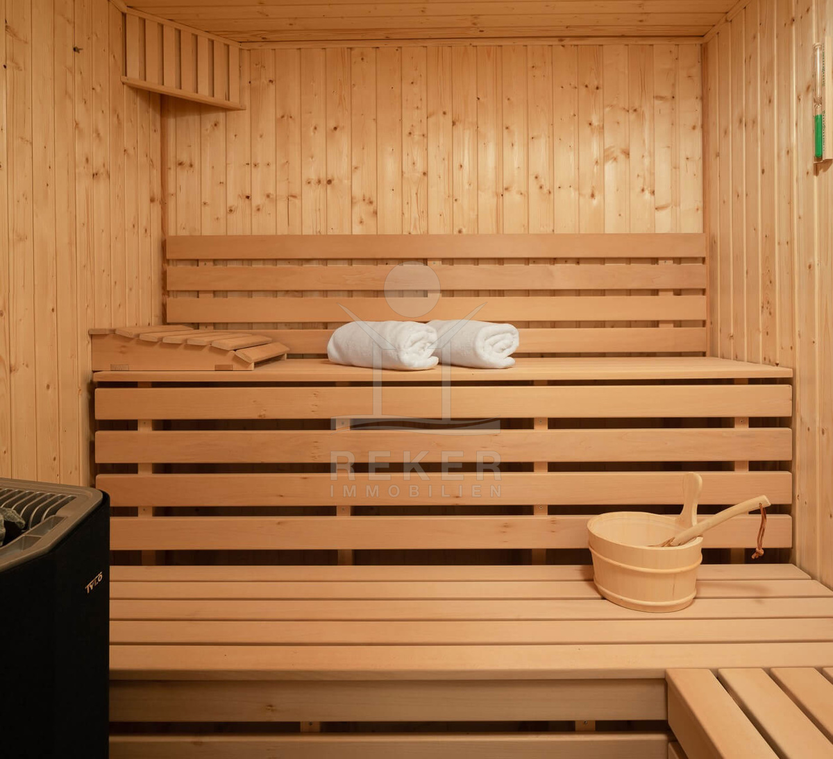 Im Erdgeschoss des Hauses befinden sich ein großzügiger Flur, eine Waschküche mit WC und ein Wohnzimmer mit offener Küche und Essplatz. Das Highlight auf dieser Etage ist der separate Ruhebereich mit Sauna, Bad und Wellnessraum.