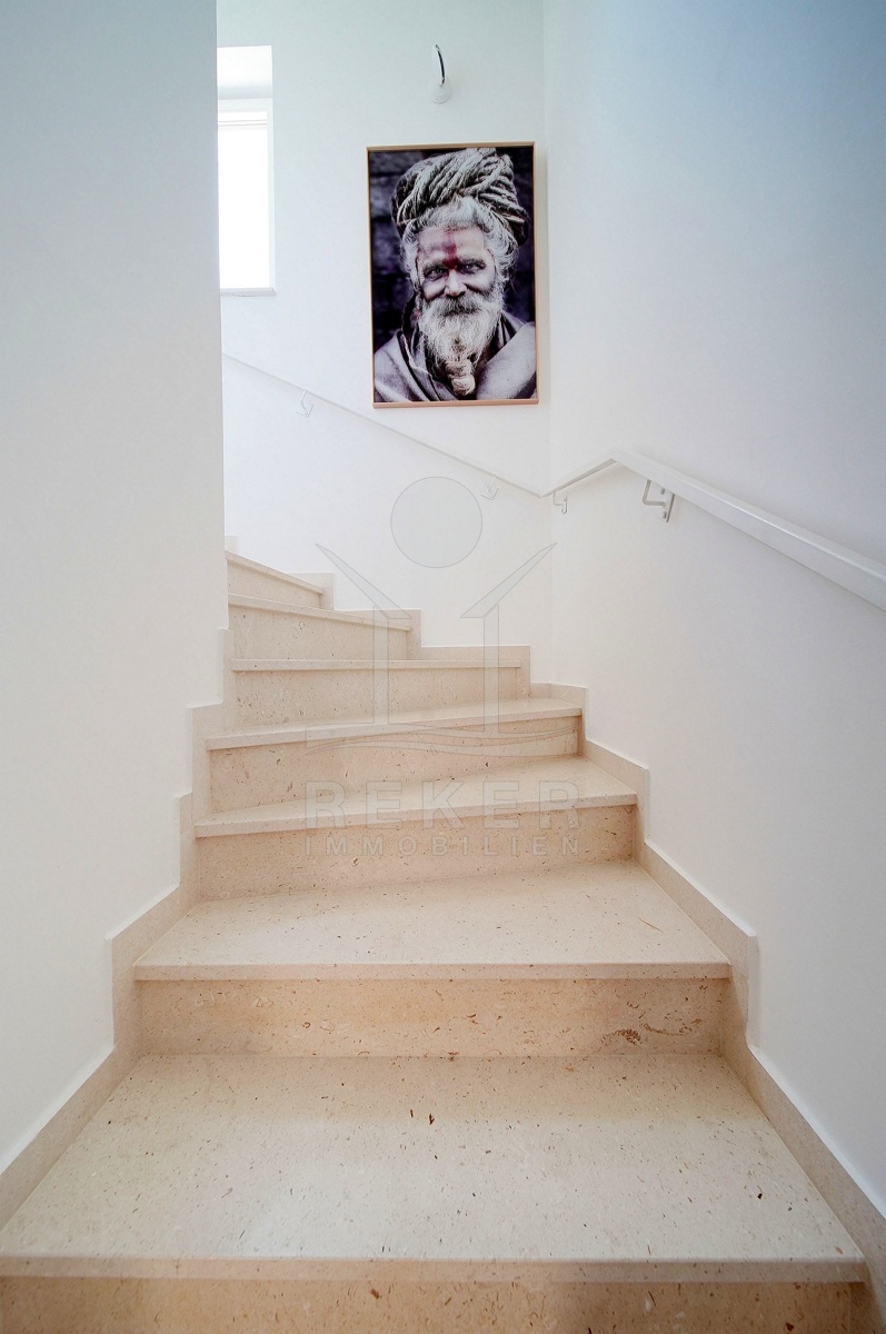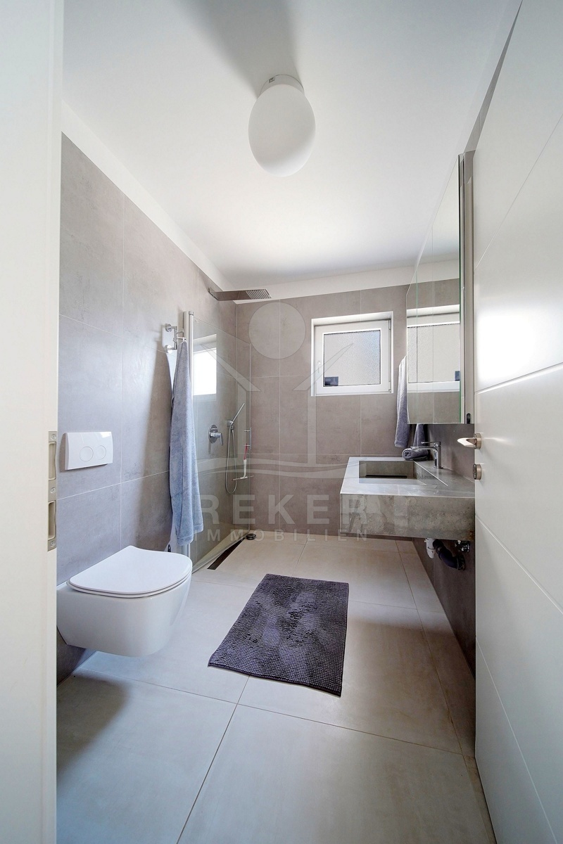 Die hochwertige Villa verfügt über eine Fußbodenheizung und ist vollständig möbliert. Im Erdgeschoss befindet sich ein großzügiges Wohnzimmer mit direktem Zugang zur überdachten Terrasse. Eine moderne Küche und ein Esszimmerbereich sind nur wenige Stufen darüber platziert. Zusätzlich gibt es ein Schlafzimmer mit eigenem Badezimmer und Zugang zum Hof, ein Gäste-WC und eine separate Waschküche.