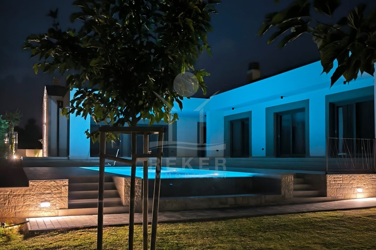 Das Anwesen erstreckt sich über ein großzügiges Grundstück von 1184 m², das von einer stilvollen Betonmauer umgeben ist. Der sorgfältig angelegte Garten mit einer Vielzahl von Hecken und Laubbäumen bietet nicht nur einen angenehmen Schatten, sondern auch eine wunderbare grüne Oase im Freien. Die gut durchdachte Außenbeleuchtung und das automatische Bewässerungssystem mit Tröpfchenbewässerung sorgen dafür, dass die Vegetation stets in voller Pracht erstrahlt. Ein motorbetriebener Schiebetorantrieb und eine elegante Metalltür gewährleisten Sicherheit und einfaches Zutrittsmanagement. Die Villa wurde im Jahr 2024 mit einer Wohnfläche von 209 m² errichtet und überzeugt mit durchdachten Ausstattungsdetails. Darunter eine Video-Gegensprechanlage, Alarmanlage, Videoüberwachung sowie eine hochwertige Sicherheits-Eingangstür aus Aluminium. Die Fenster bestehen aus doppelt verglastem PVC mit einem umweltfreundlichen Hebe-Schiebe-System. Für eine angenehme Wohnatmosphäre sorgt die Kombination aus Fußbodenheizung mit Wärmepumpe, Klimaanlage von Daikin und einem kombinierten Warmwasserspeicher. Vier Stellplätze stehen zur Verfügung.