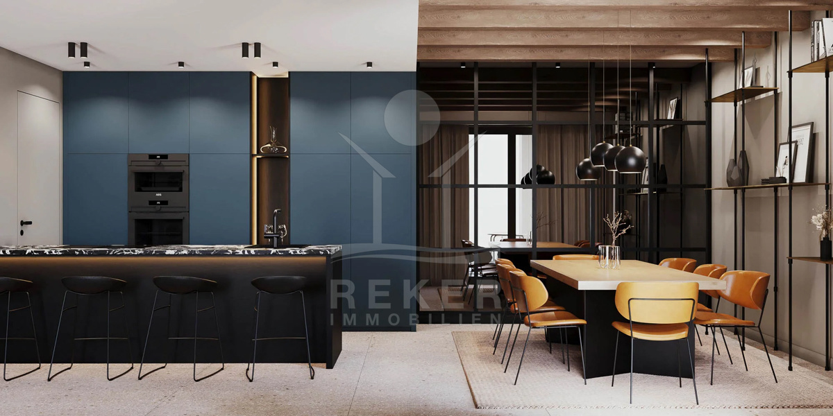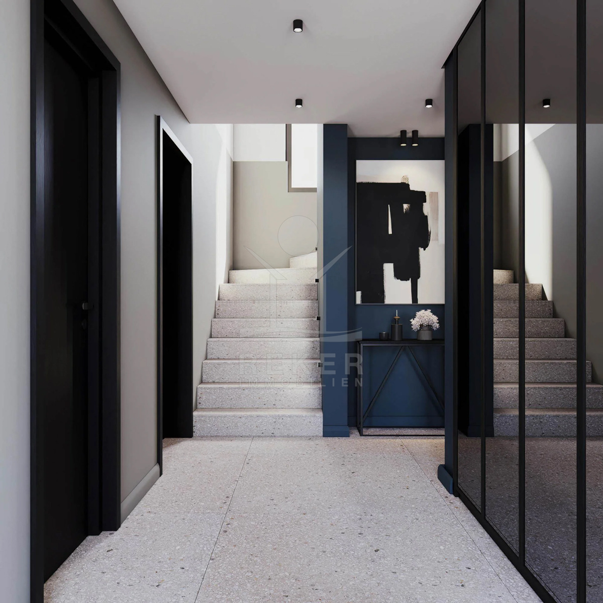 Im Inneren setzt sich der hochwertige Eindruck fort. Das Erdgeschoss ist offen gestaltet: Wohnbereich mit Kamin, Essplatz und Designküche gehen fließend ineinander über. Die Möbel sind keine Massenware, ausgesuchte Stücke, harmonisch aufeinander abgestimmt. Dazu ein Gäste-WC, eine Speisekammer, ein Abstellraum und der Zugang zur Terrasse.
