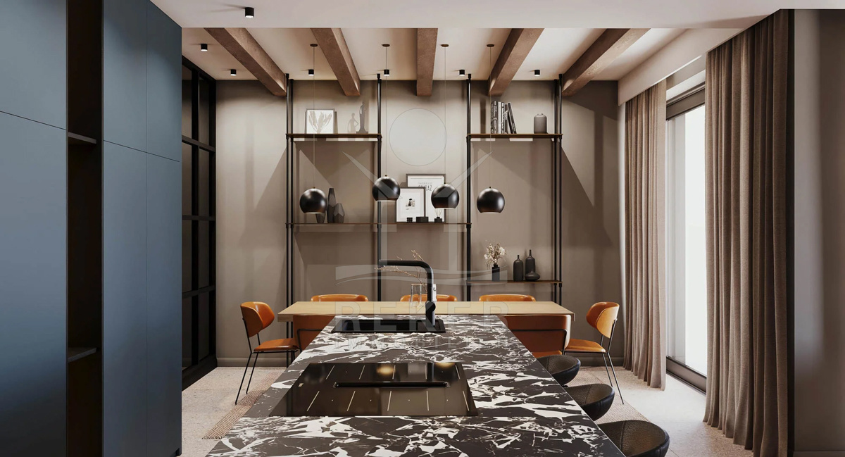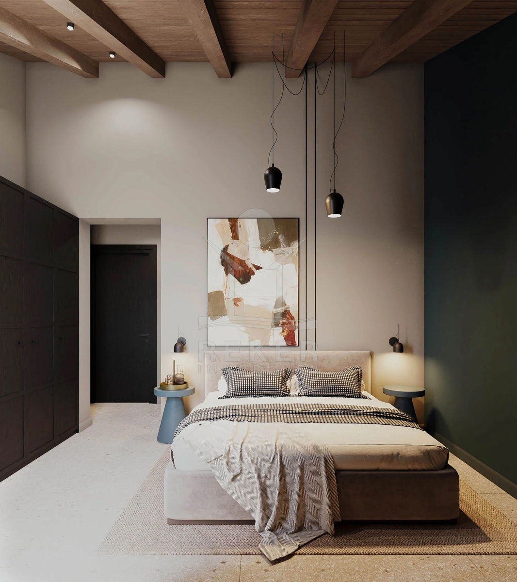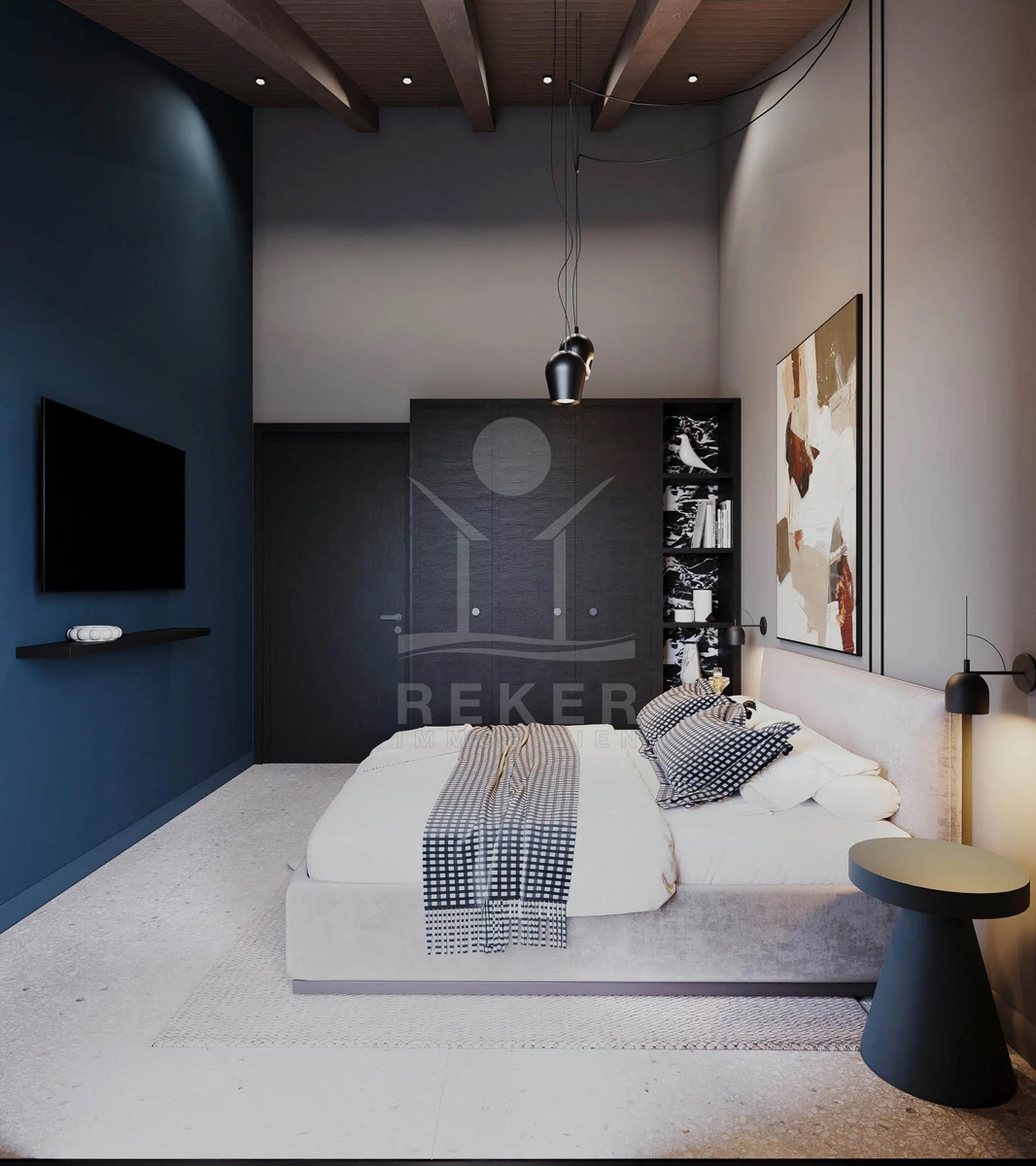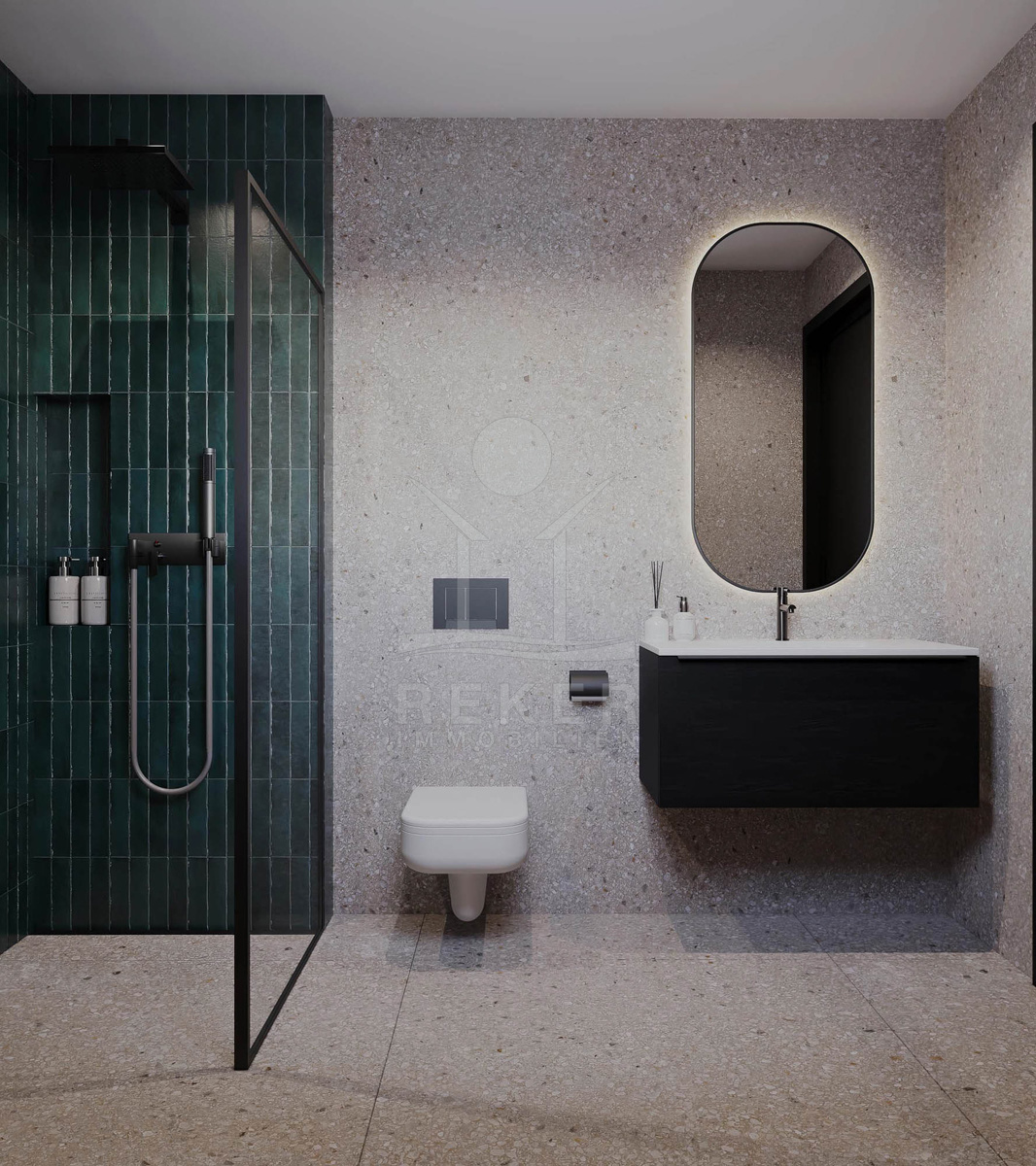 Oben: vier Schlafzimmer, jedes mit eigenem Bad. Zwei überdachte Balkone geben zusätzlichen Raum im Freien. Auch hier: stilvolle Möbel, klare Linien, warme Töne. Fußbodenheizung und Klimaanlage sorgen für Komfort zu jeder Jahreszeit. Die Fertigstellung ist für April 2026 geplant.