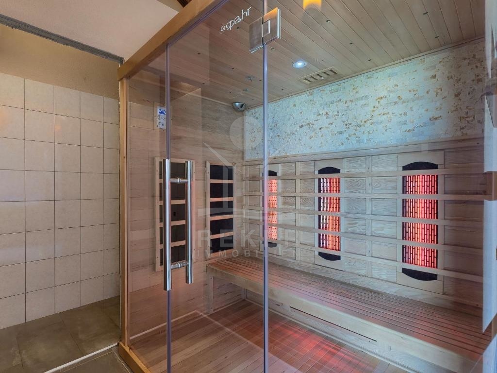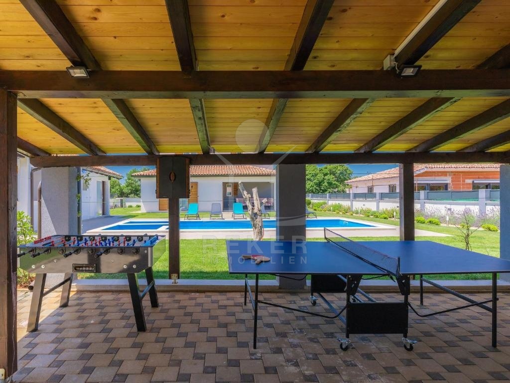 Die Terrasse bietet zahlreiche paradiesische Außenbereiche. Der 50 m² große Swimmingpool mit Liegewiese und ein Kinderbereich sind perfekt für heiße Tage. Es gibt auch eine überdachte Grillterrasse und Außenküche sowie eine zusätzliche Bar für Abende mit Freunden und Familie. Ein Nebengebäude mit Sauna und Tischtennis ist ebenfalls vorhanden und bietet eine zusätzliche Möglichkeit der Entspannung und des Spaßes. Dieses Haus ist ein echtes Juwel und bietet alle Voraussetzungen für ein traumhaftes Leben.