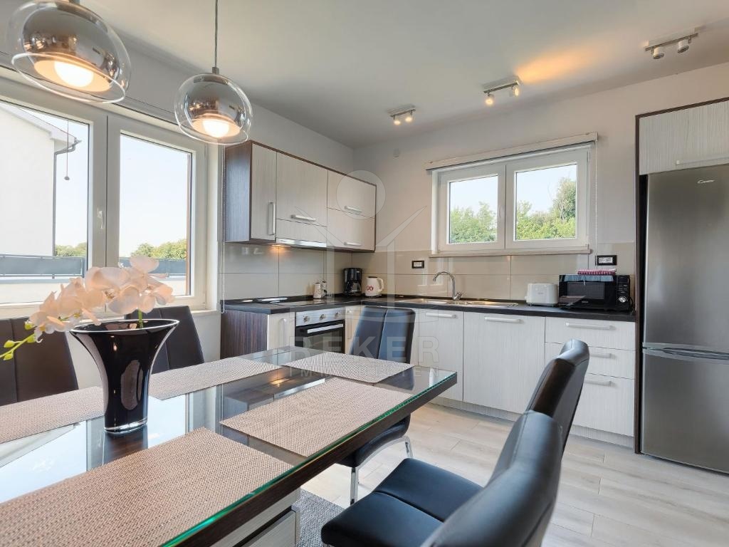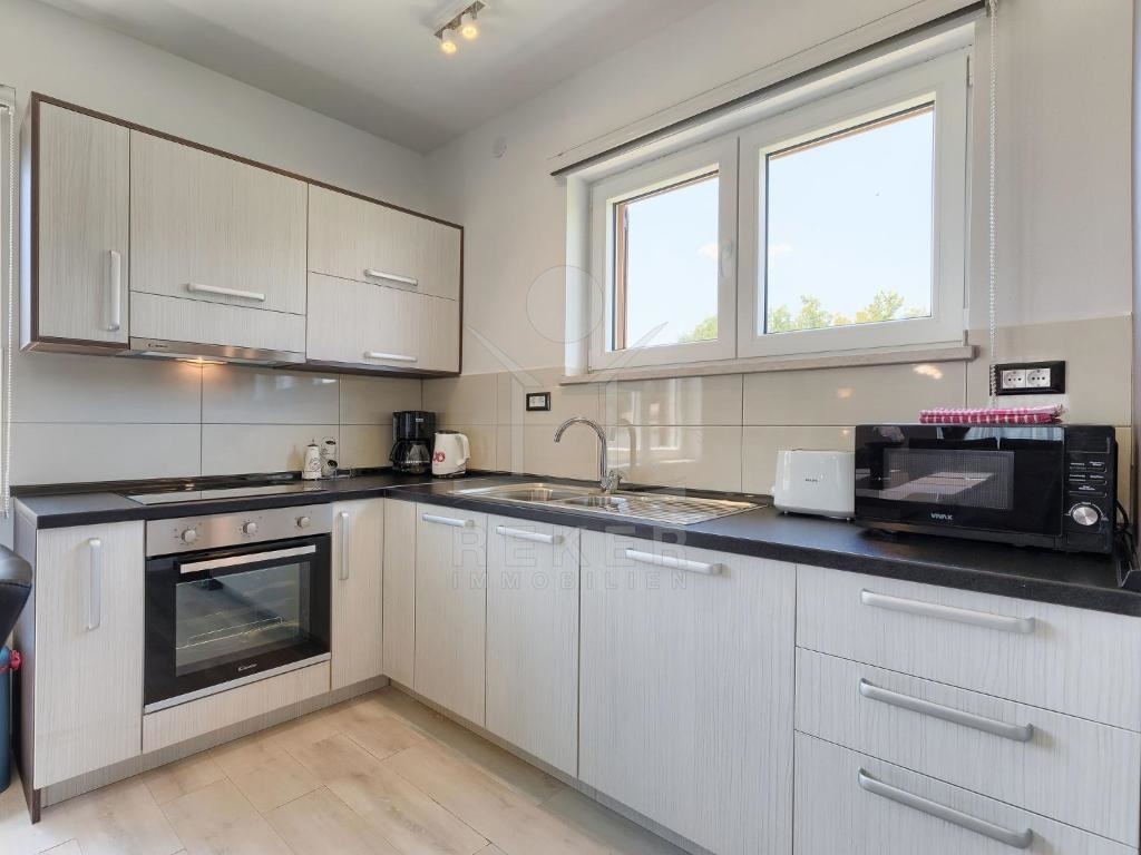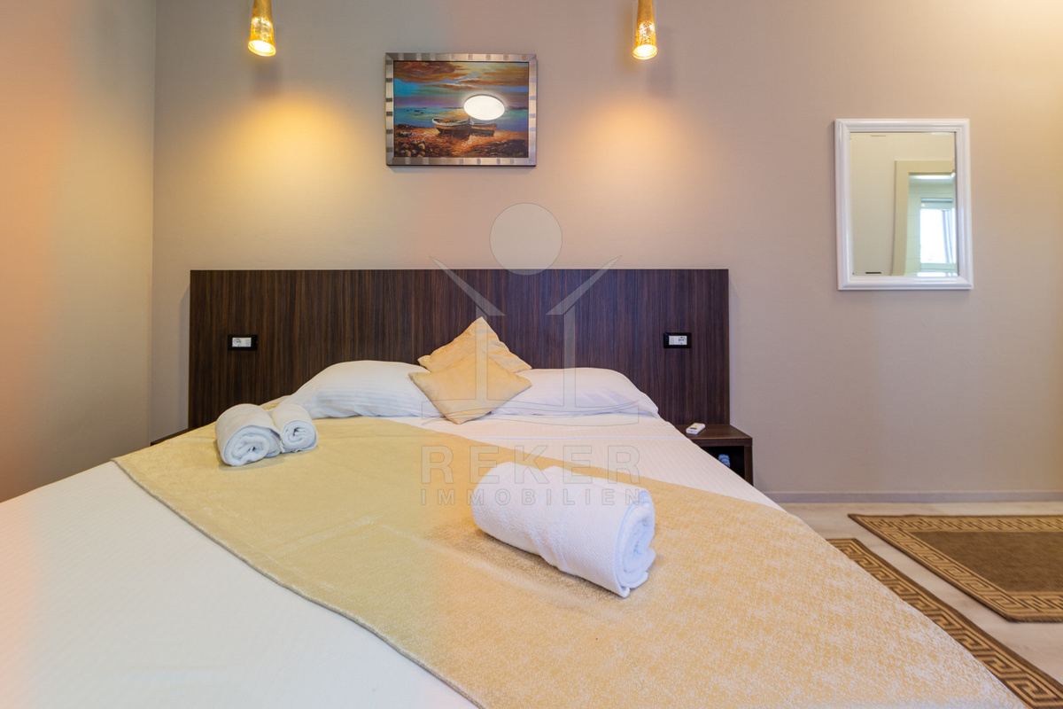 Die klimatisierte Wohnung beeindruckt durch eine moderne Einrichtung und bietet viel Platz auf zwei Etagen. Im Erdgeschoss befindet sich eine geräumige Eingangshalle und ein offenes Raumkonzept, das ein großes Wohnzimmer, eine Küche und ein Esszimmer, sowie ein gemütliches Schlafzimmer und ein modernes Badezimmer vereint. Die Wohnung ist komplett möbliert und bietet einen hohen Komfort. Hier finden Sie alles, was Sie für ein stilvolles Leben benötigen.