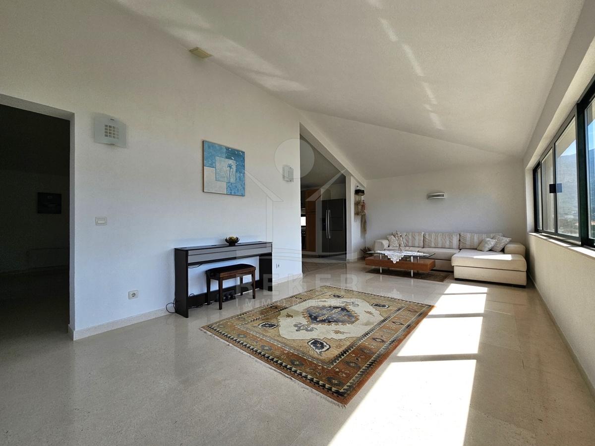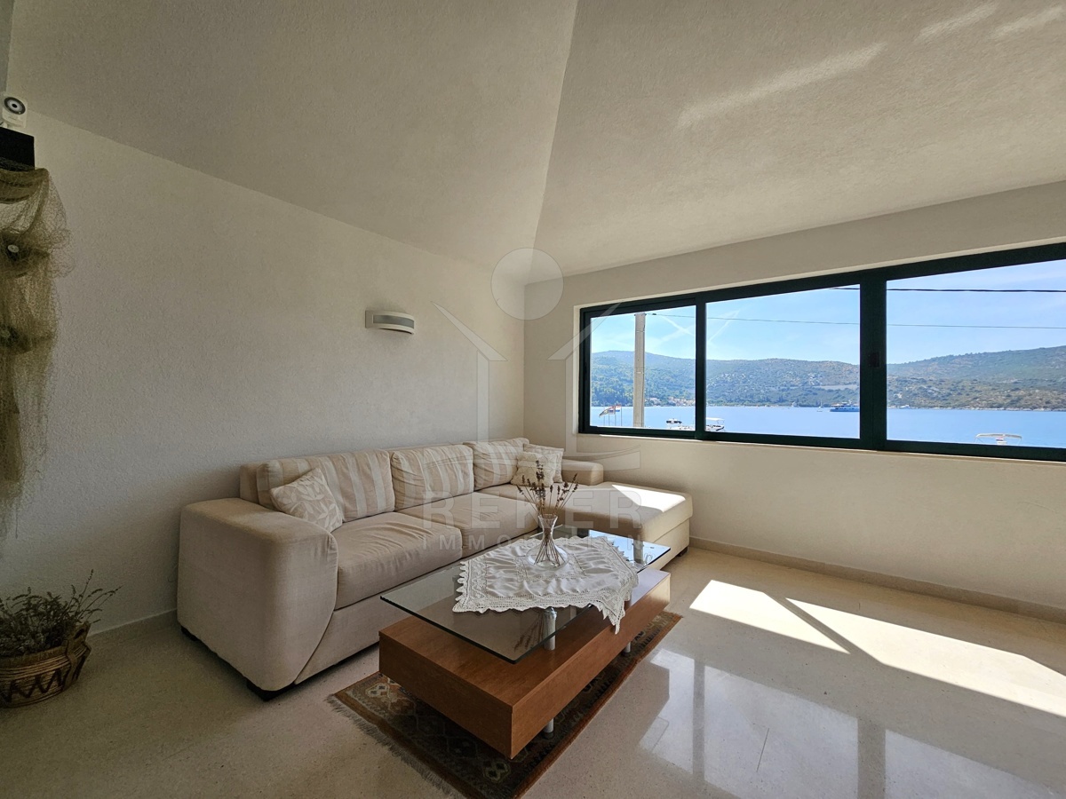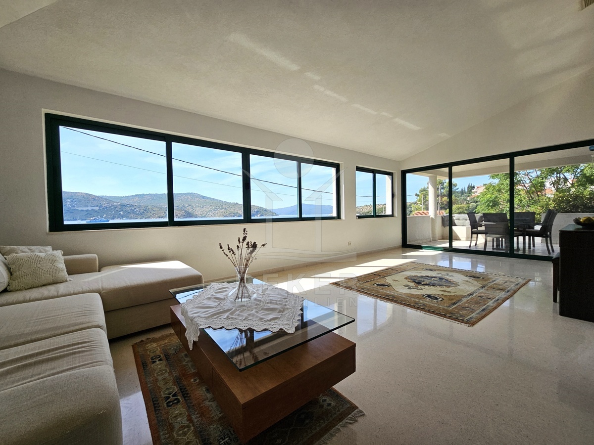 Die erste Etage beeindruckt mit einem großzügigen, lichtdurchfluteten Wohnzimmer, das dank großer Glasfenster einen Panoramablick auf das Meer bietet. Eine geräumige Terrasse mit eleganten Loungemöbeln lädt dazu ein, den Meerblick zu genießen. Außentreppen verbinden in perfekter Harmonie den Garten mit dem weitläufigen Balkon der ersten Etage, was ein nahtloses Erlebnis im Freien ermöglicht.