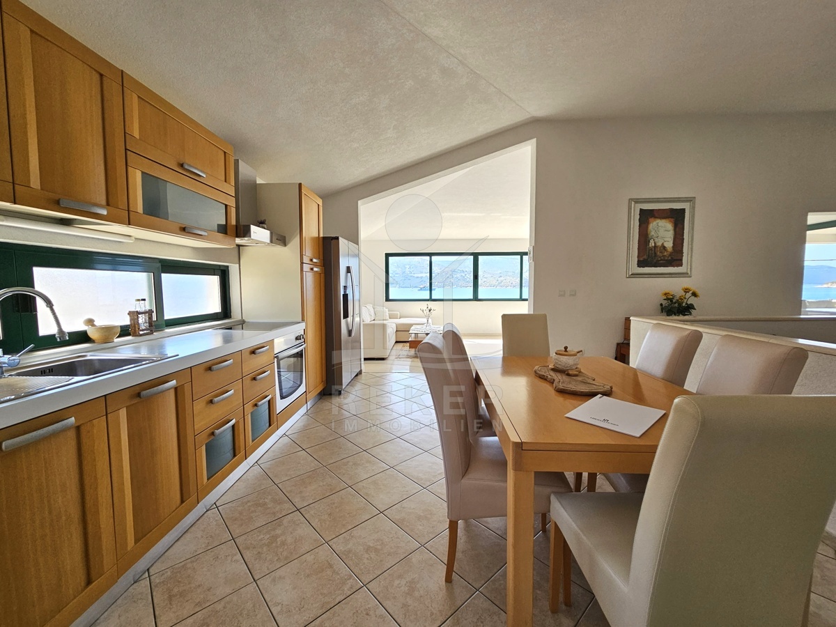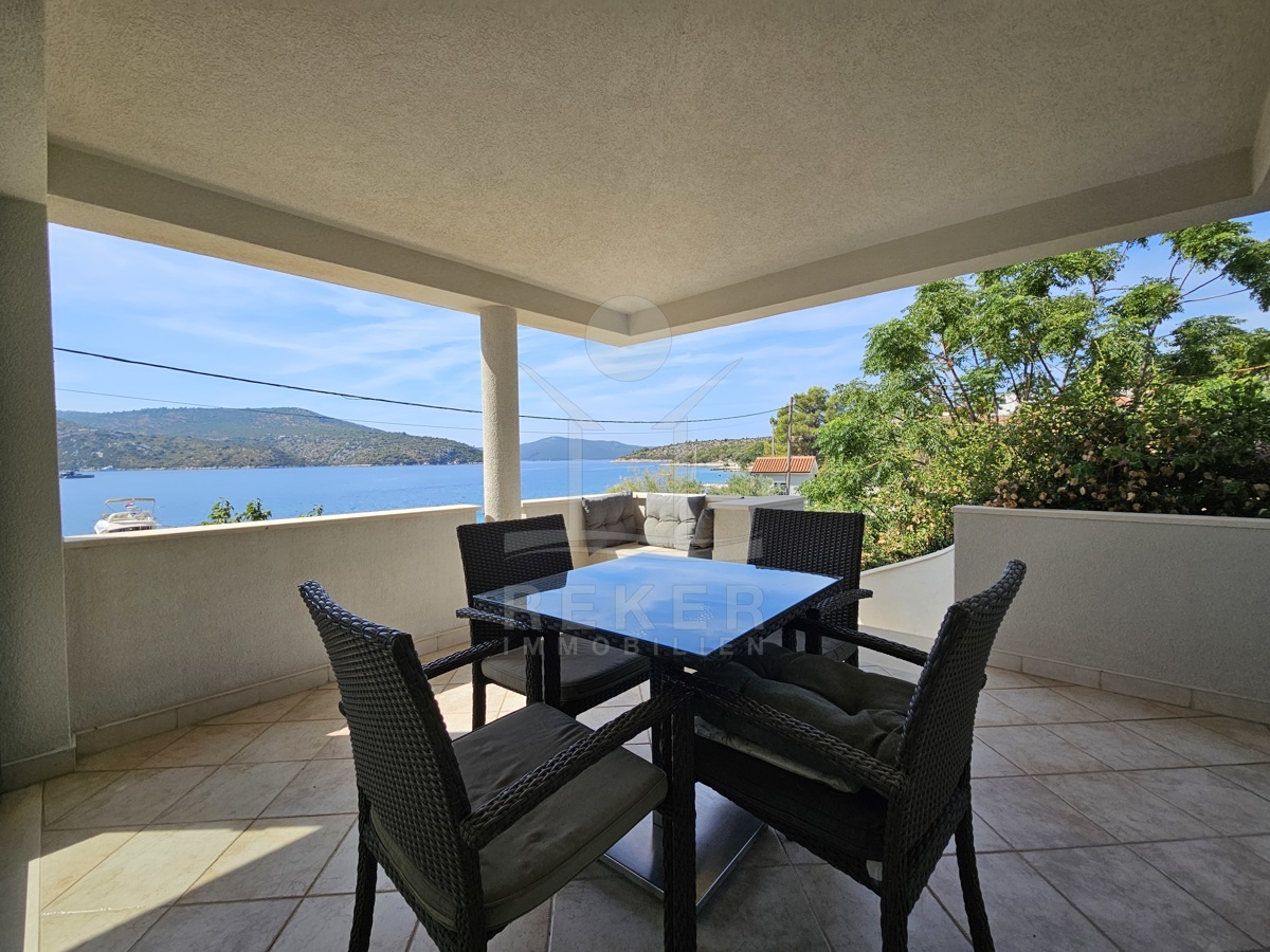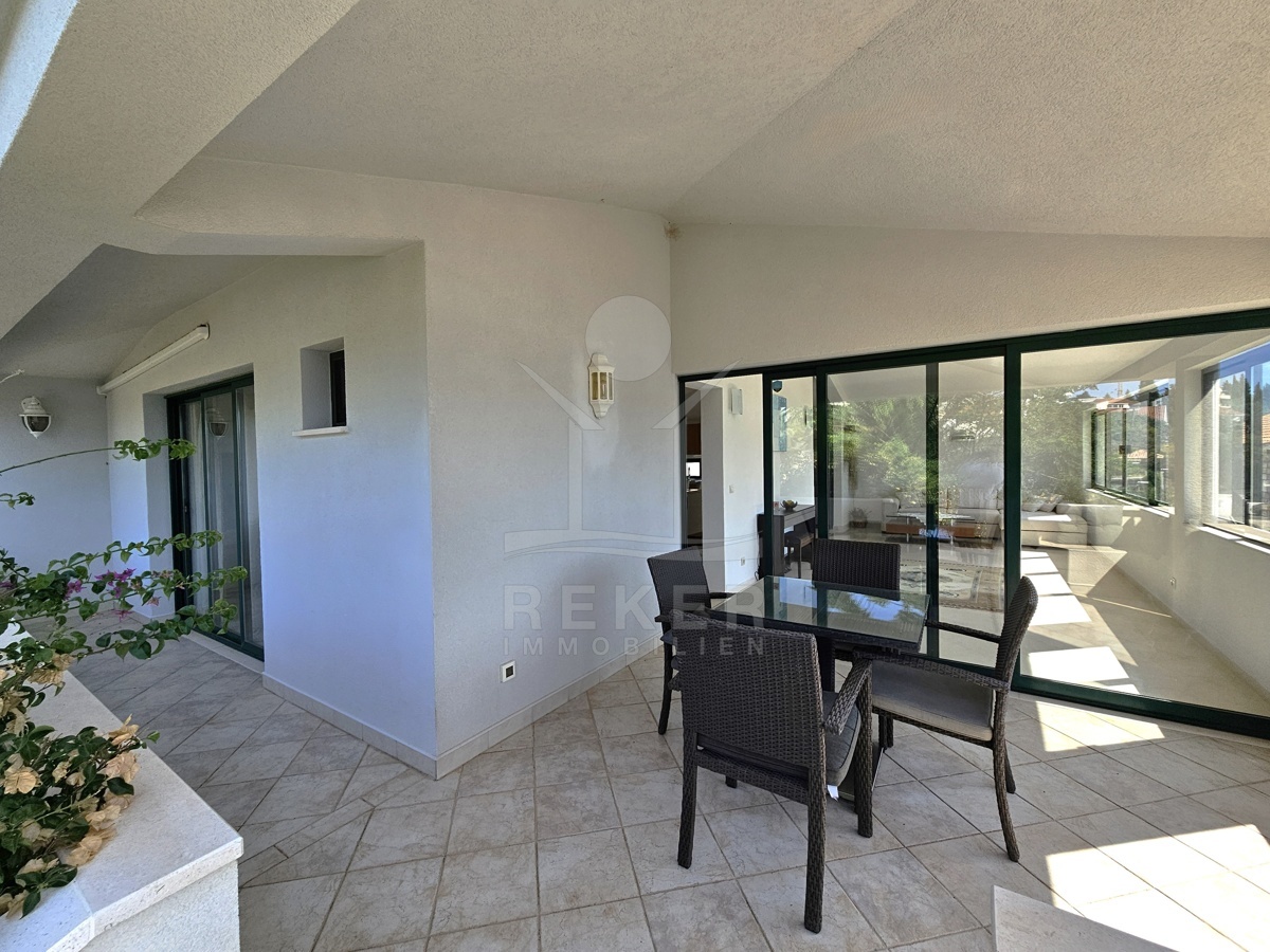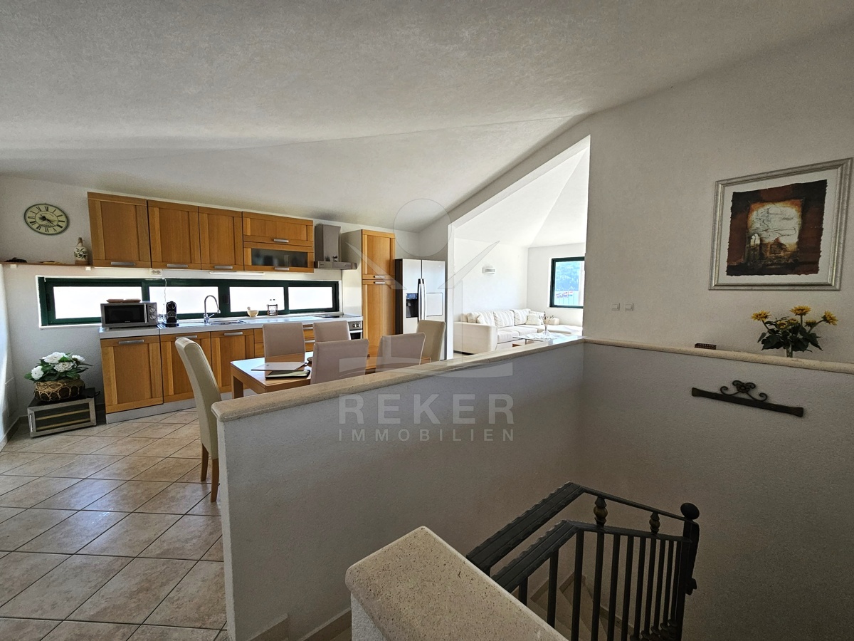 Die erste Etage beeindruckt mit einem großzügigen, lichtdurchfluteten Wohnzimmer, das dank großer Glasfenster einen Panoramablick auf das Meer bietet. Eine geräumige Terrasse mit eleganten Loungemöbeln lädt dazu ein, den Meerblick zu genießen. Außentreppen verbinden in perfekter Harmonie den Garten mit dem weitläufigen Balkon der ersten Etage, was ein nahtloses Erlebnis im Freien ermöglicht.