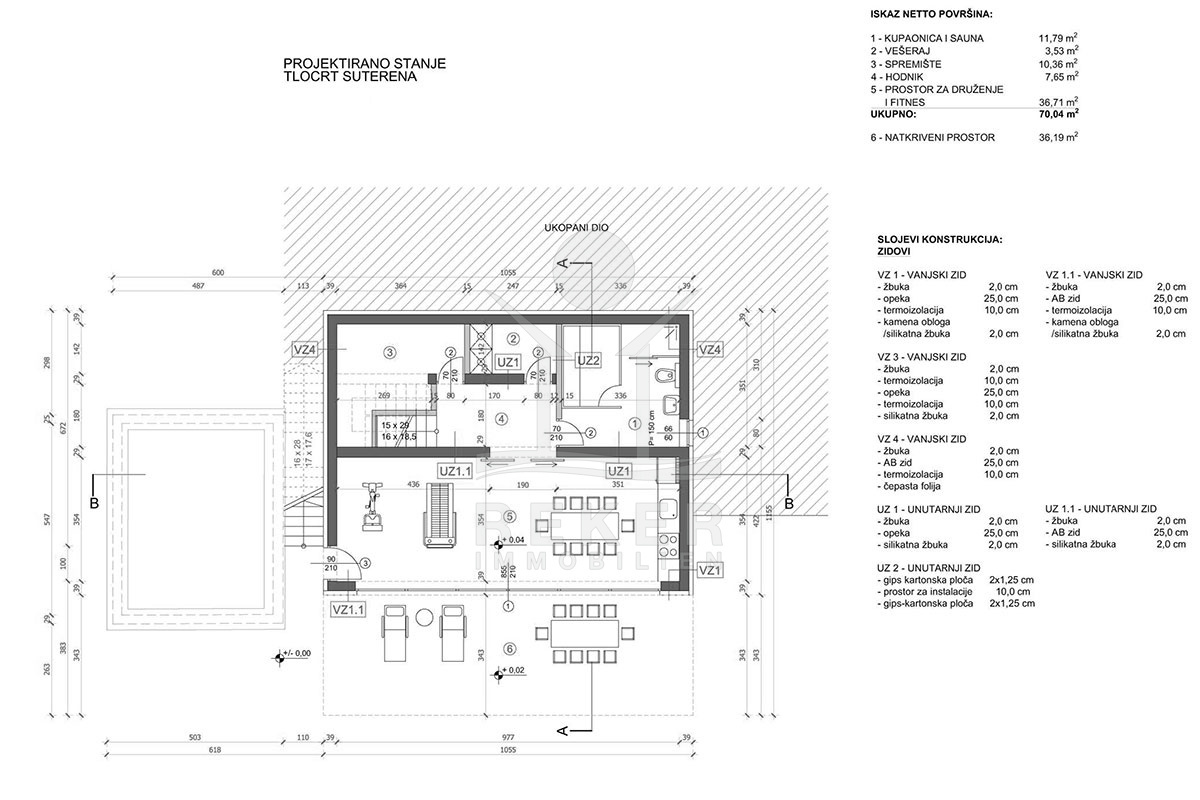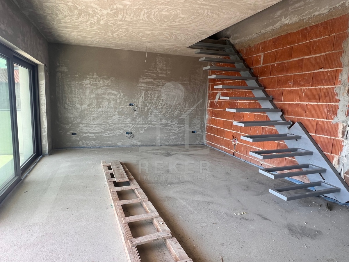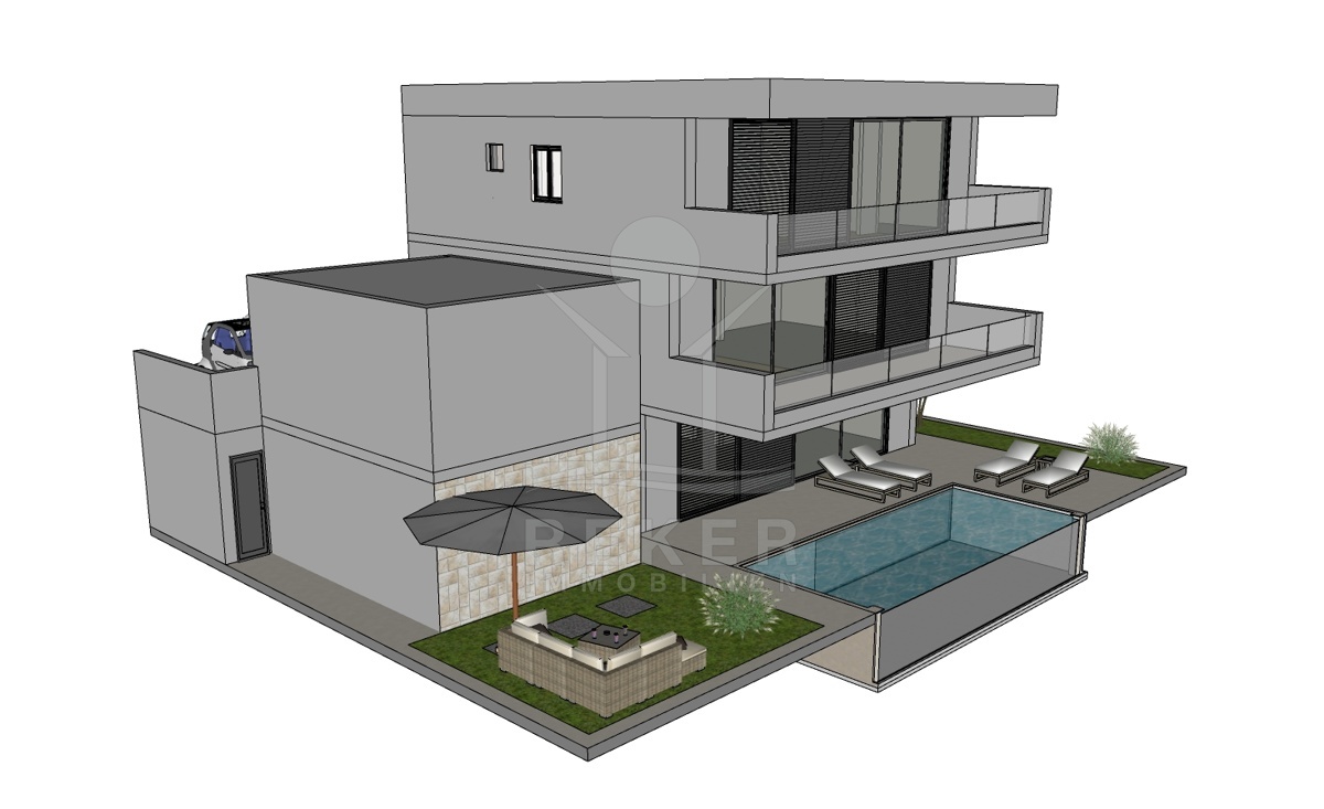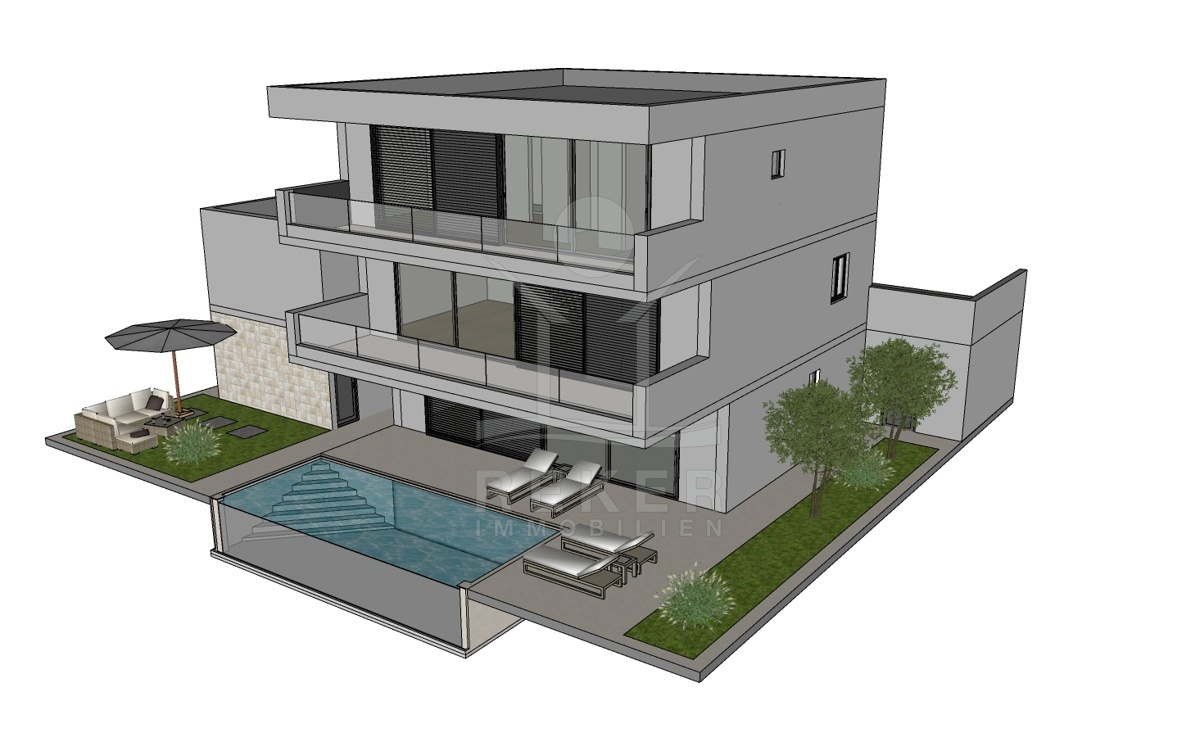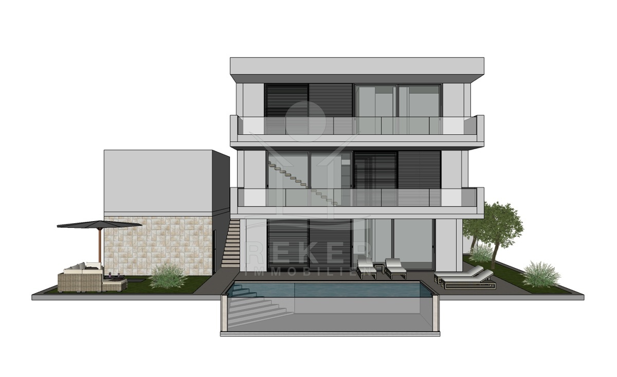 Im Untergeschoss befindet sich eine Sauna, ein Fitness-Studio und eine Taverne, die zu entspannten Abenden einlädt. Das Erdgeschoss verfügt über einen offenen Wohnraum mit Küche und Esszimmer, ein Schlafzimmer, ein Badezimmer und eine Speisekammer. Das Obergeschoss bietet drei weitere Schlafzimmer, die jeweils über ein eigenes Badezimmer verfügen, sodass jeder seinen privaten Rückzugsort hat. Diese Villa bietet ein luxuriöses Wohnen mit Wellness-Charakter und ist perfekt für Menschen, die das Leben in vollen Zügen genießen möchten