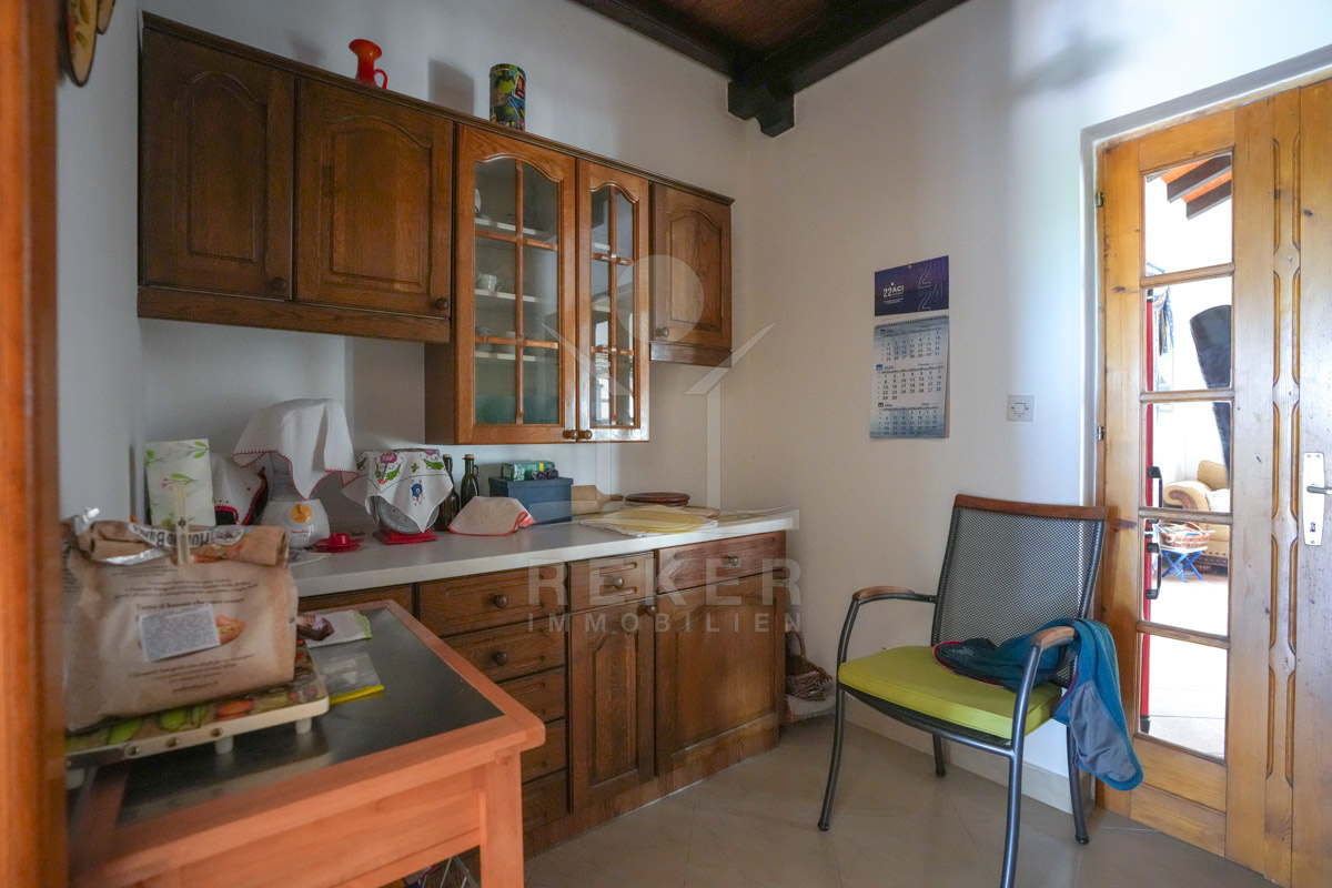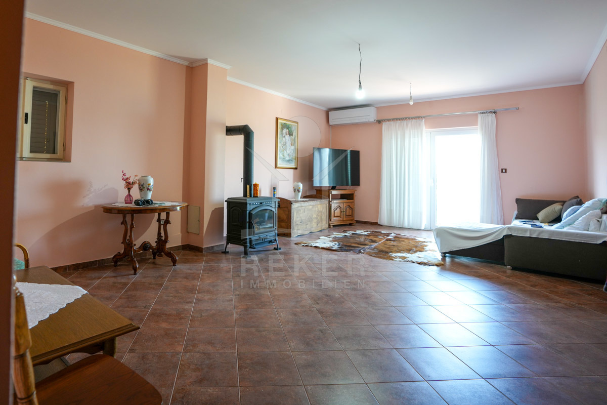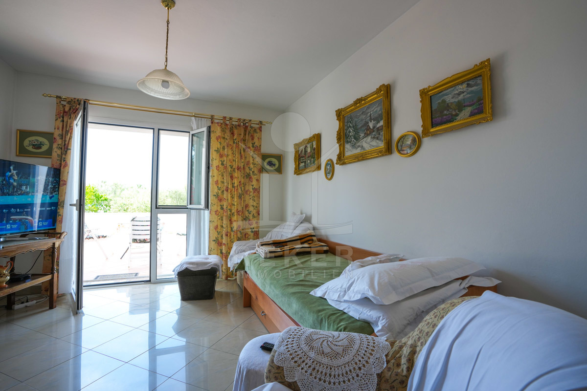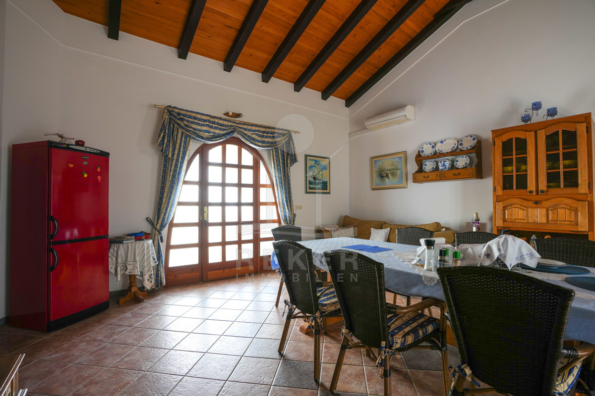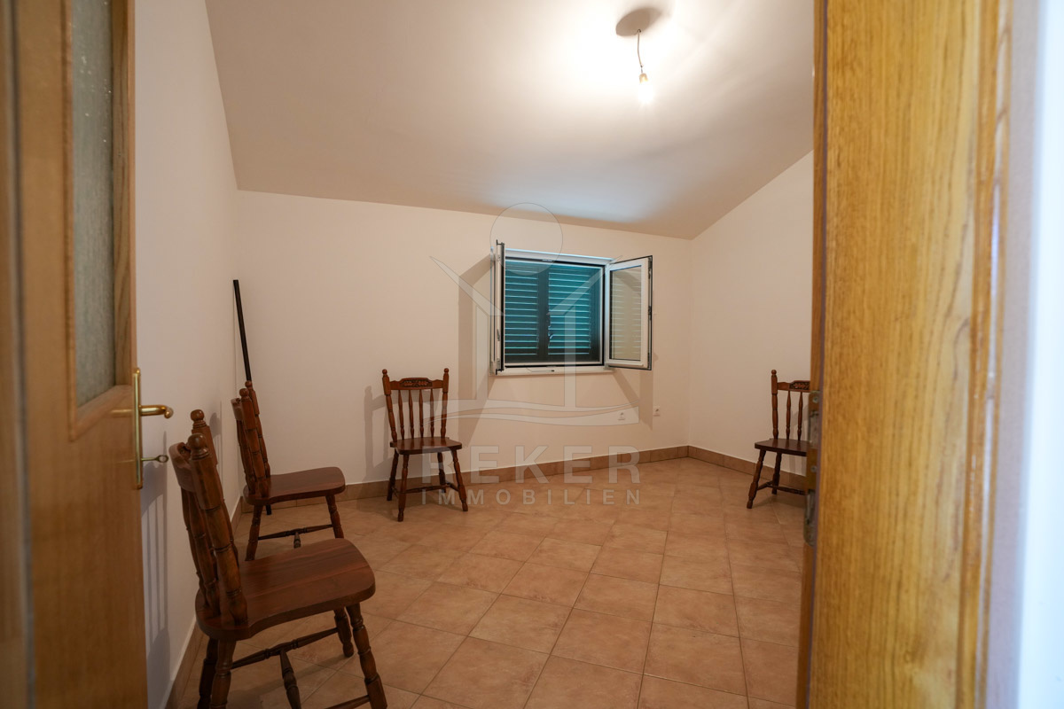 Im 1. Stock erwartet Sie ein großer offener Wohnbereich mit Zugang zu einem Balkon mit Blick auf das Meer und die umliegenden Inseln. Zudem gibt es zwei Schlafzimmer, ein Badezimmer und ein WC. Die beiden Wohnungen sind durch einen Gemeinschaftsraum verbunden, der als Treffpunkt für Familie und Freunde dient. Mit einem großen Tisch, Holzdecke und eigener Küche ist er ideal für gesellige Zusammenkünfte.
