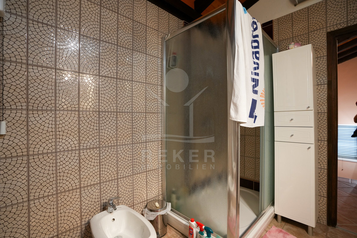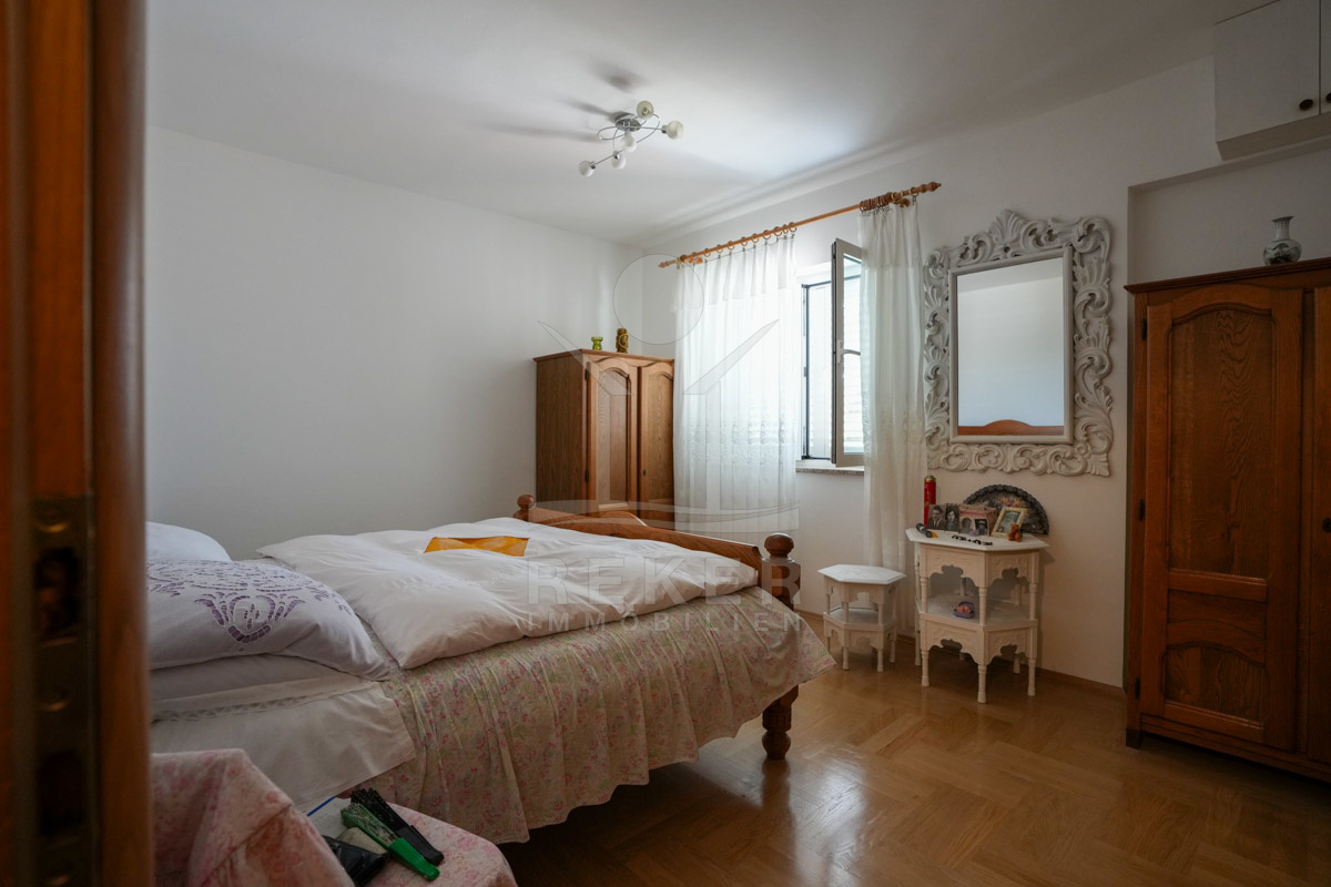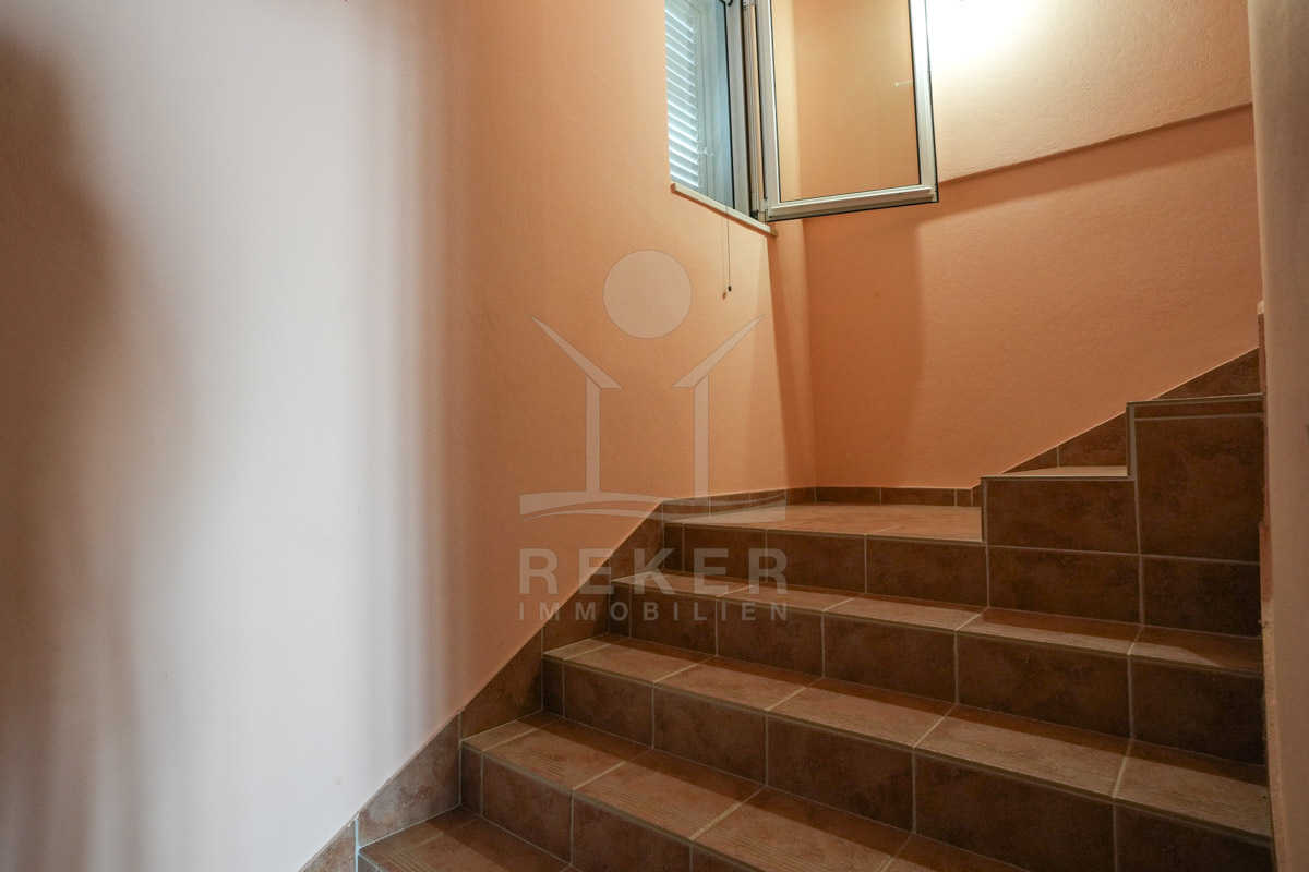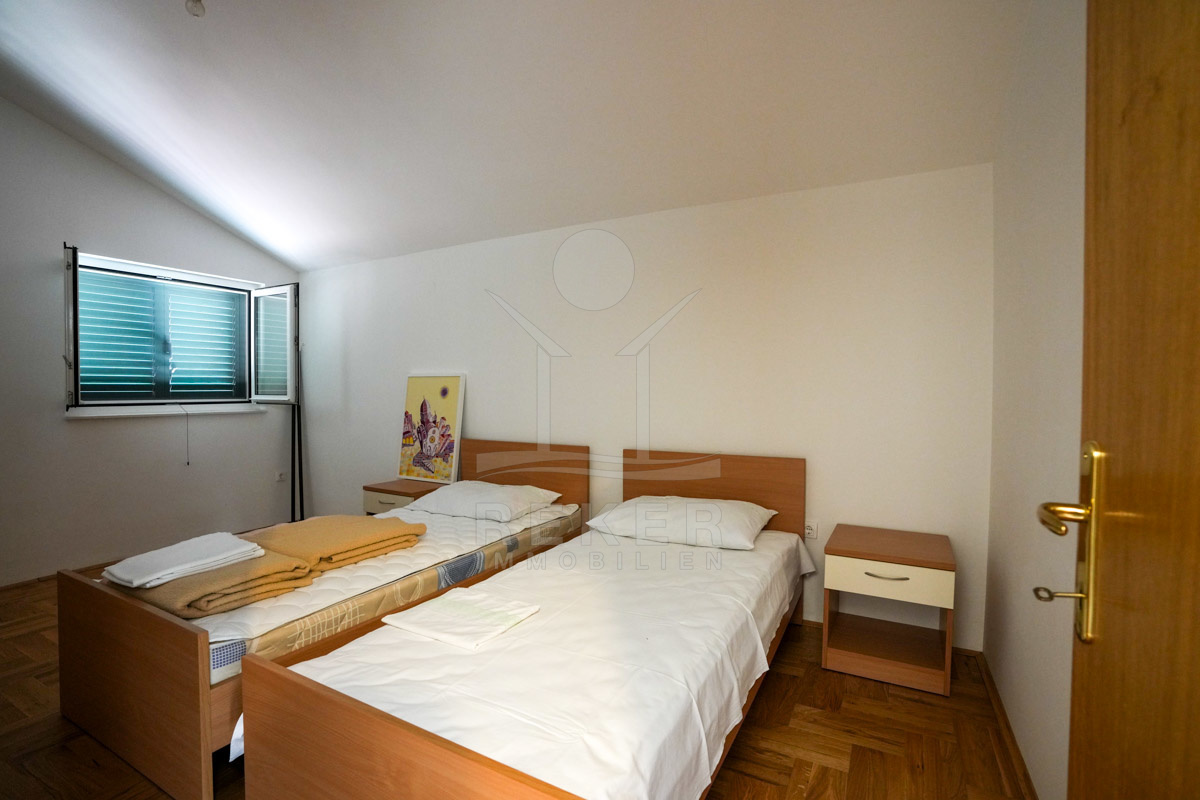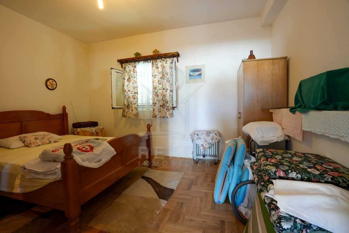 Im 1. Stock erwartet Sie ein großer offener Wohnbereich mit Zugang zu einem Balkon mit Blick auf das Meer und die umliegenden Inseln. Zudem gibt es zwei Schlafzimmer, ein Badezimmer und ein WC. Die beiden Wohnungen sind durch einen Gemeinschaftsraum verbunden, der als Treffpunkt für Familie und Freunde dient. Mit einem großen Tisch, Holzdecke und eigener Küche ist er ideal für gesellige Zusammenkünfte.