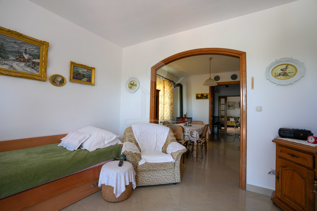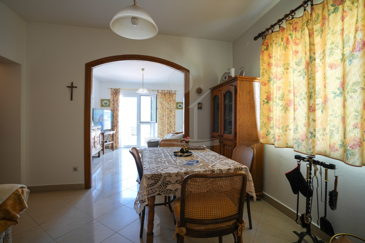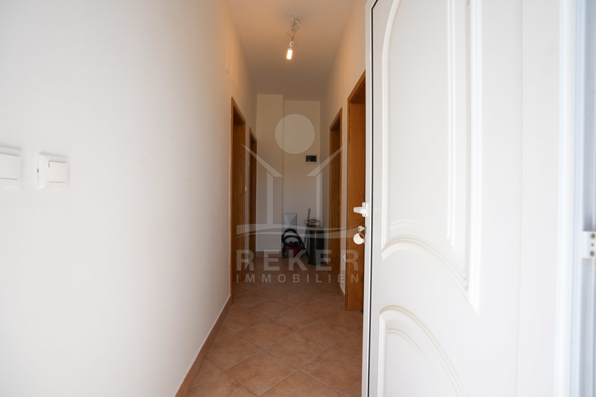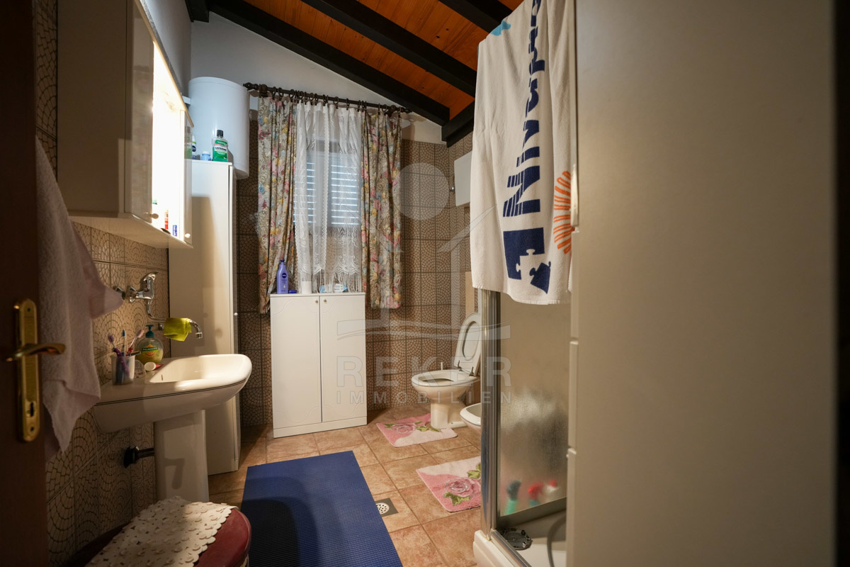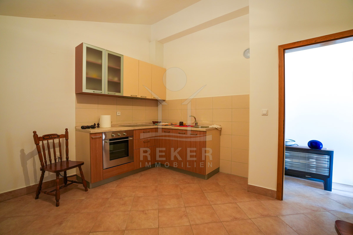 Im 1. Stock erwartet Sie ein großer offener Wohnbereich mit Zugang zu einem Balkon mit Blick auf das Meer und die umliegenden Inseln. Zudem gibt es zwei Schlafzimmer, ein Badezimmer und ein WC. Die beiden Wohnungen sind durch einen Gemeinschaftsraum verbunden, der als Treffpunkt für Familie und Freunde dient. Mit einem großen Tisch, Holzdecke und eigener Küche ist er ideal für gesellige Zusammenkünfte.