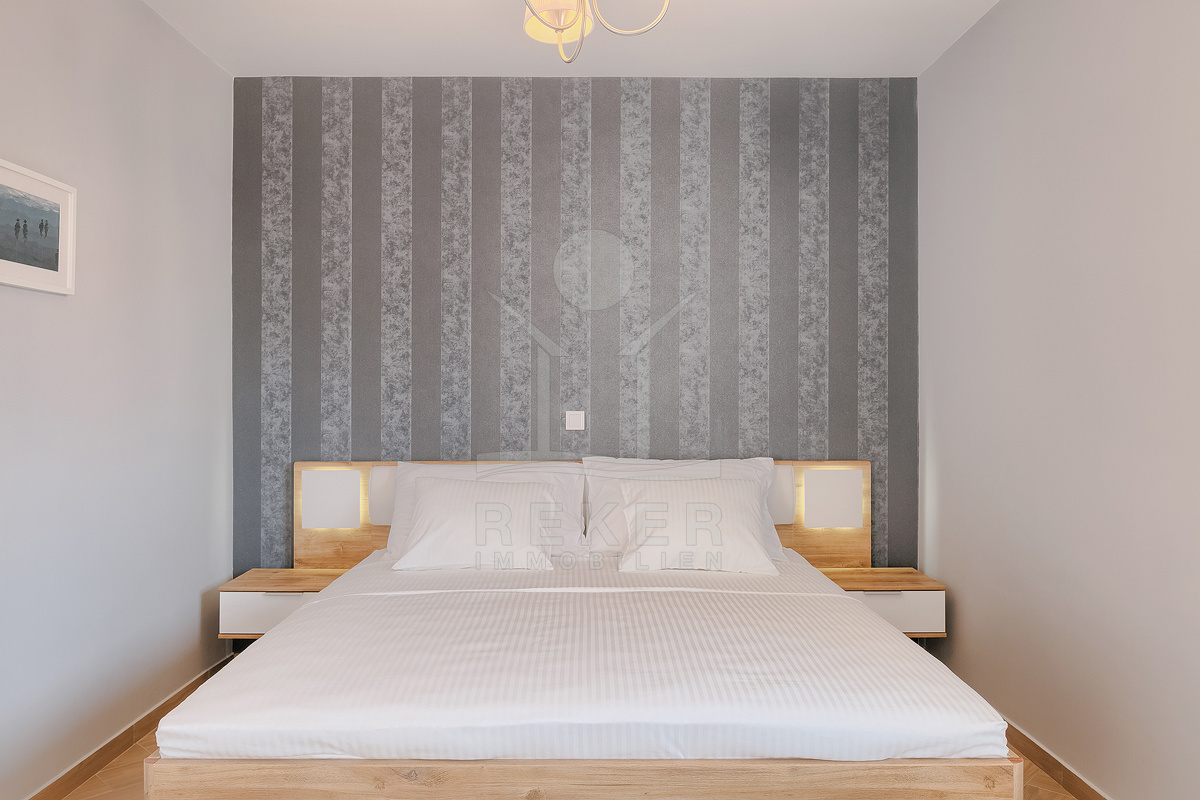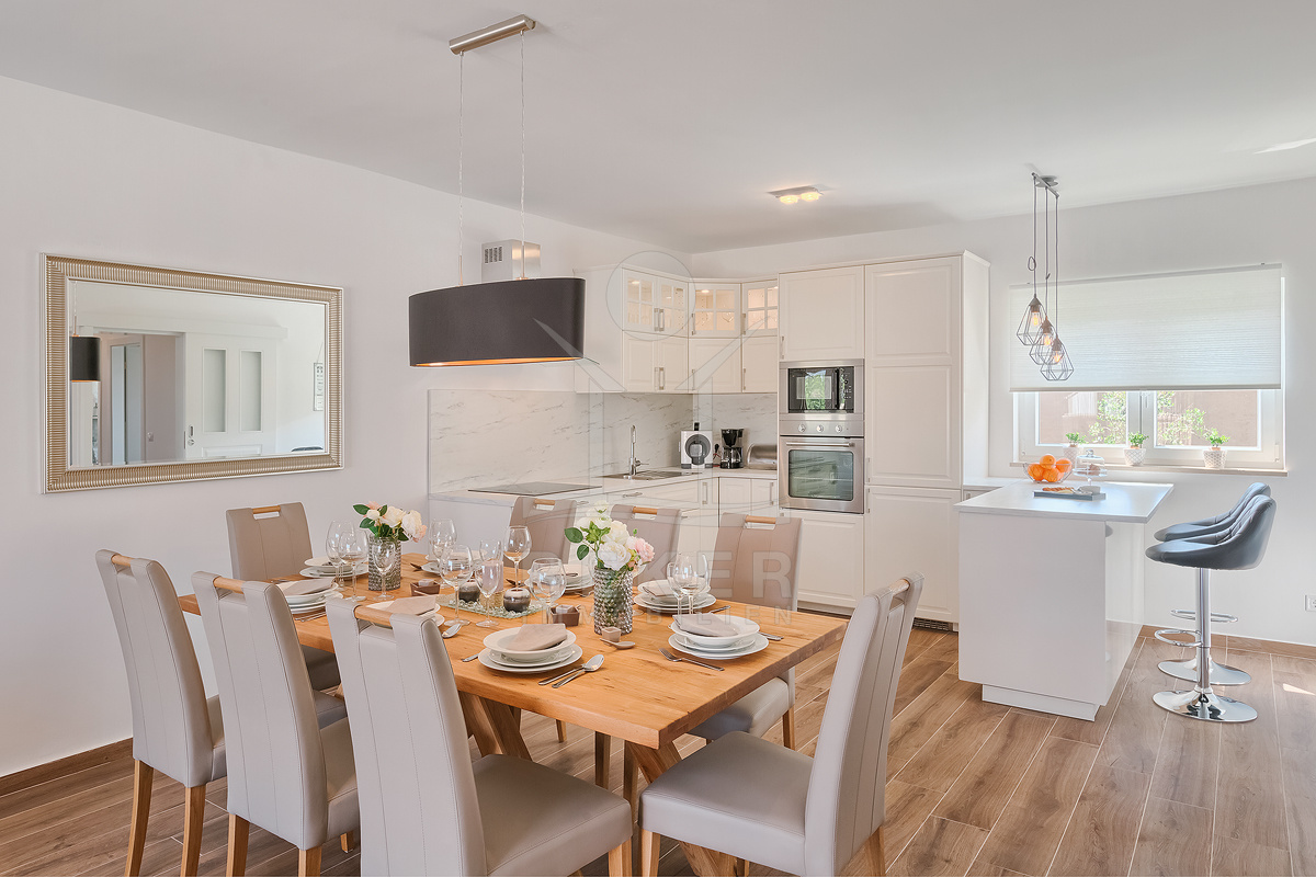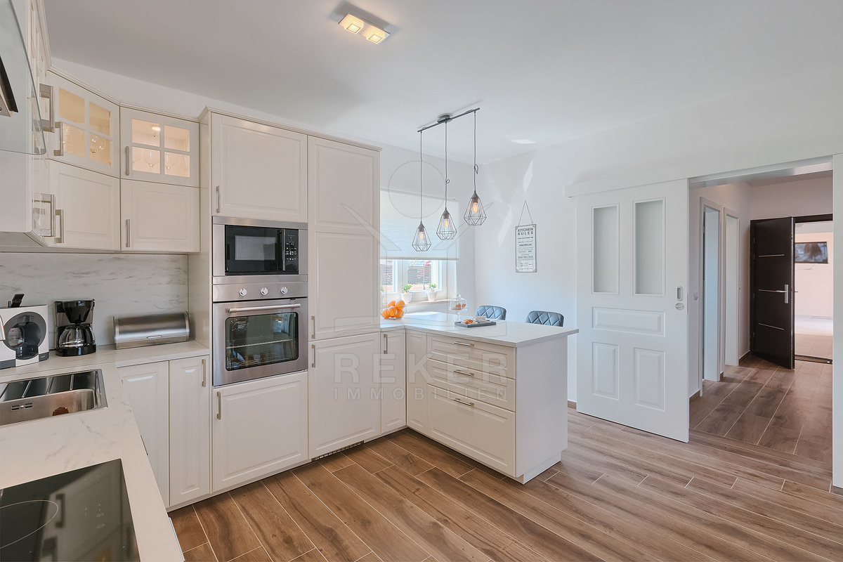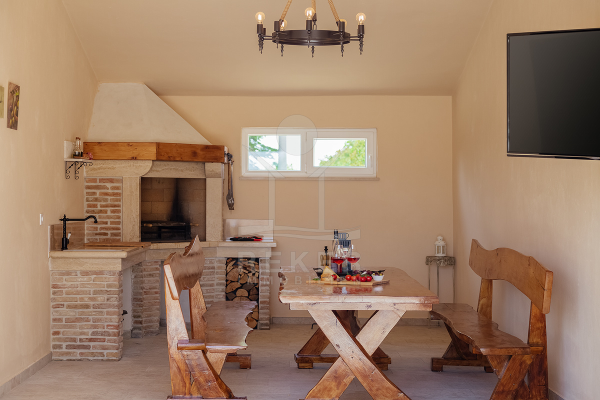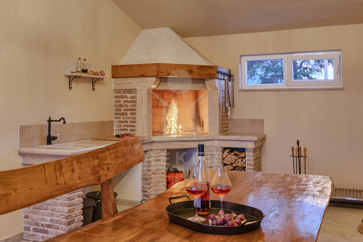 Ein zusätzlicher Aufenthaltsraum, die Konoba, lädt mit Grill und Kamin zu geselligen Abenden ein, perfekt für Barbecues oder gemütliche Stunden in guter Gesellschaft. Hier lässt es sich wunderbar entspannen und genießen.
