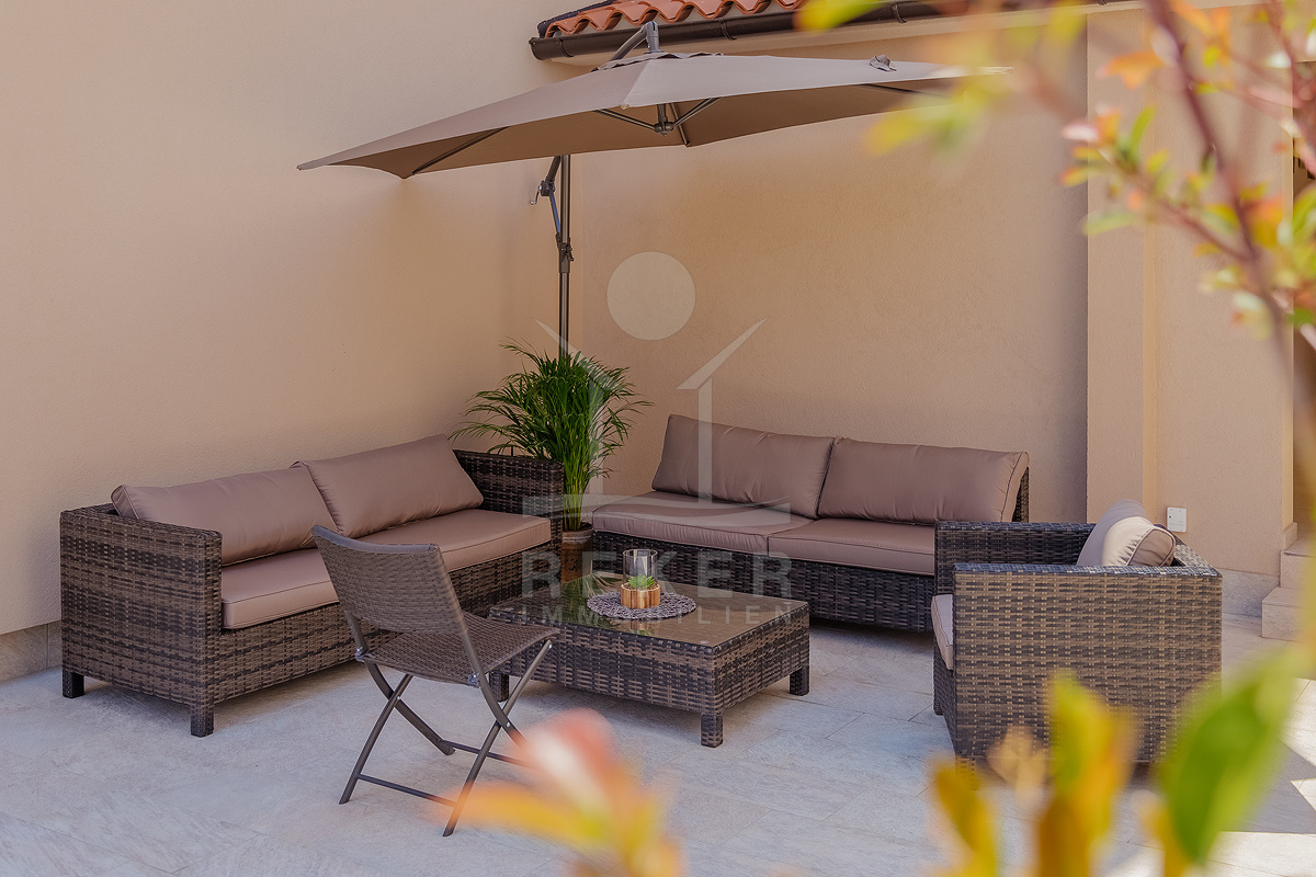 Die Terrasse der Villa ist ein Ort der Entspannung und Erholung. Ein wunderschön gestalteter Außenbereich mit Pool, Sonnenliegen und einer einladenden Sitzlounge lädt dazu ein, die warmen Tage im Freien zu genießen. Der liebevoll angelegte Garten vervollständigt das Bild eines perfekten Rückzugsortes. Diese Villa bietet nicht nur eine luxuriöse Unterkunft, sondern auch ein unvergleichliches Ambiente zum Wohlfühlen.