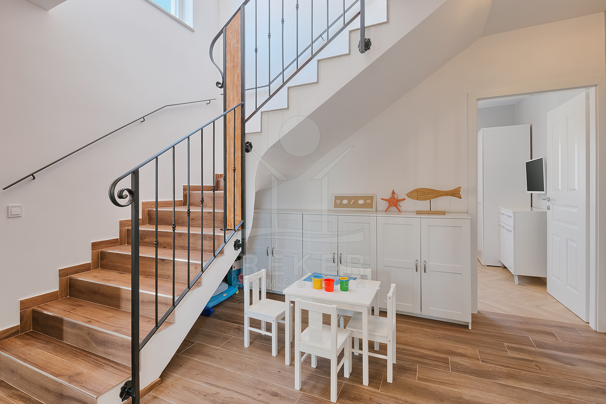 Das Haus verfügt über eine Klimaanlage, die für angenehme Temperaturen sorgt. Der Eingangsbereich im Erdgeschoss führt zu einem offenen Wohn-, Ess- und Küchenbereich mit Zugang zur Terrasse und dem Pool. Ein Schlafzimmer und ein Bad sind ebenfalls auf dieser Ebene zu finden.