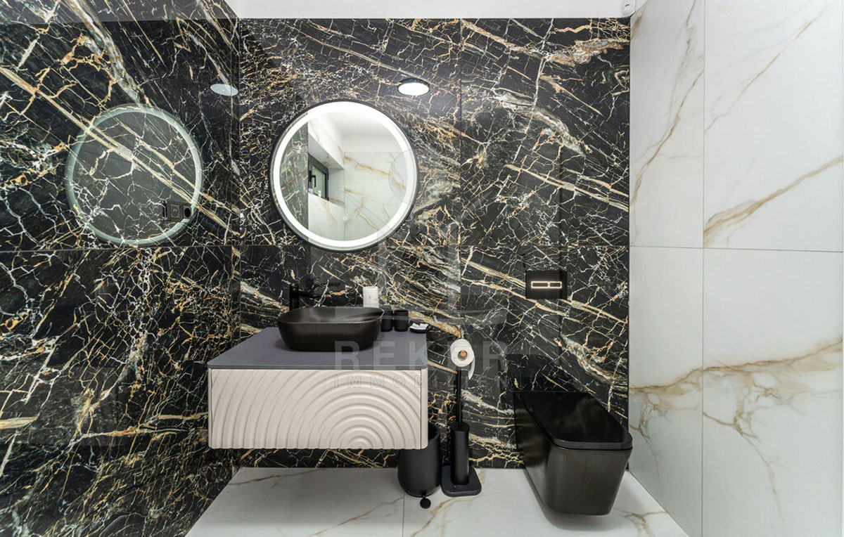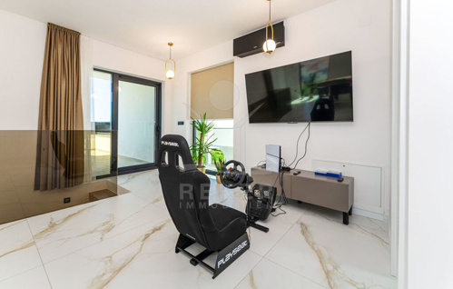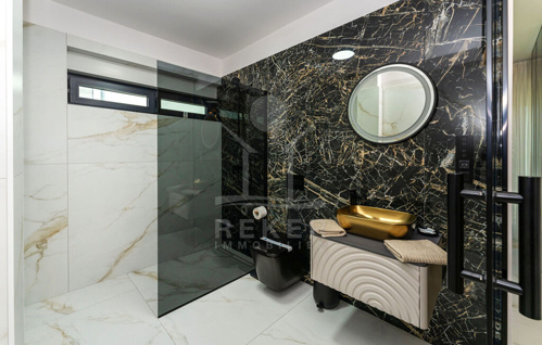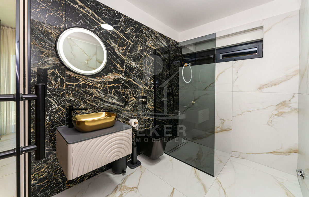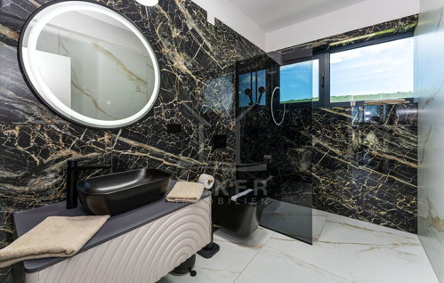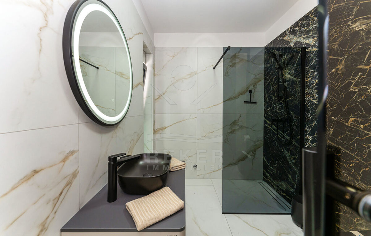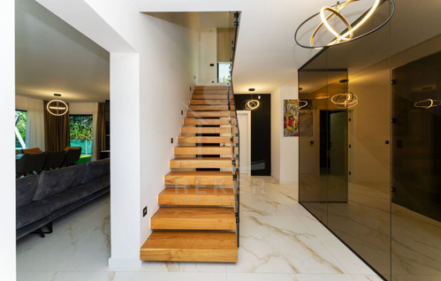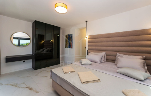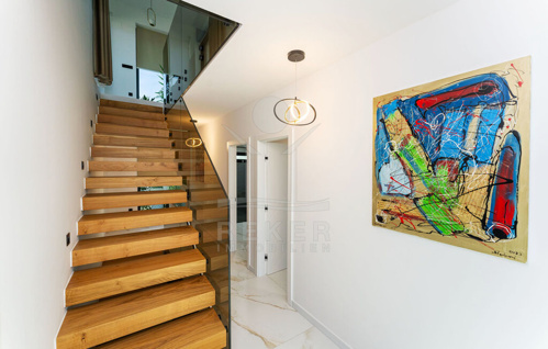 Über eine schwebende, moderne Treppe mit Glasgeländer gelangen Sie ins Obergeschoss, wo vier Schlafzimmer mit eigenen Badezimmern auf Sie warten. Jedes Schlafzimmer bietet Zugang zur Terrassen (Fläche der Terrassen beträgt 56 m²) mit herrlichem Meerblick, der zum Träumen einlädt.