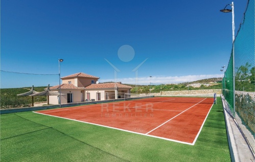 Zum Anwesen gehört ein Tennisplatz mit professionellem Belag für aktive Stunden im Freien. Der Kinderspielplatz sorgt zudem für Unterhaltung der jüngsten Bewohner.