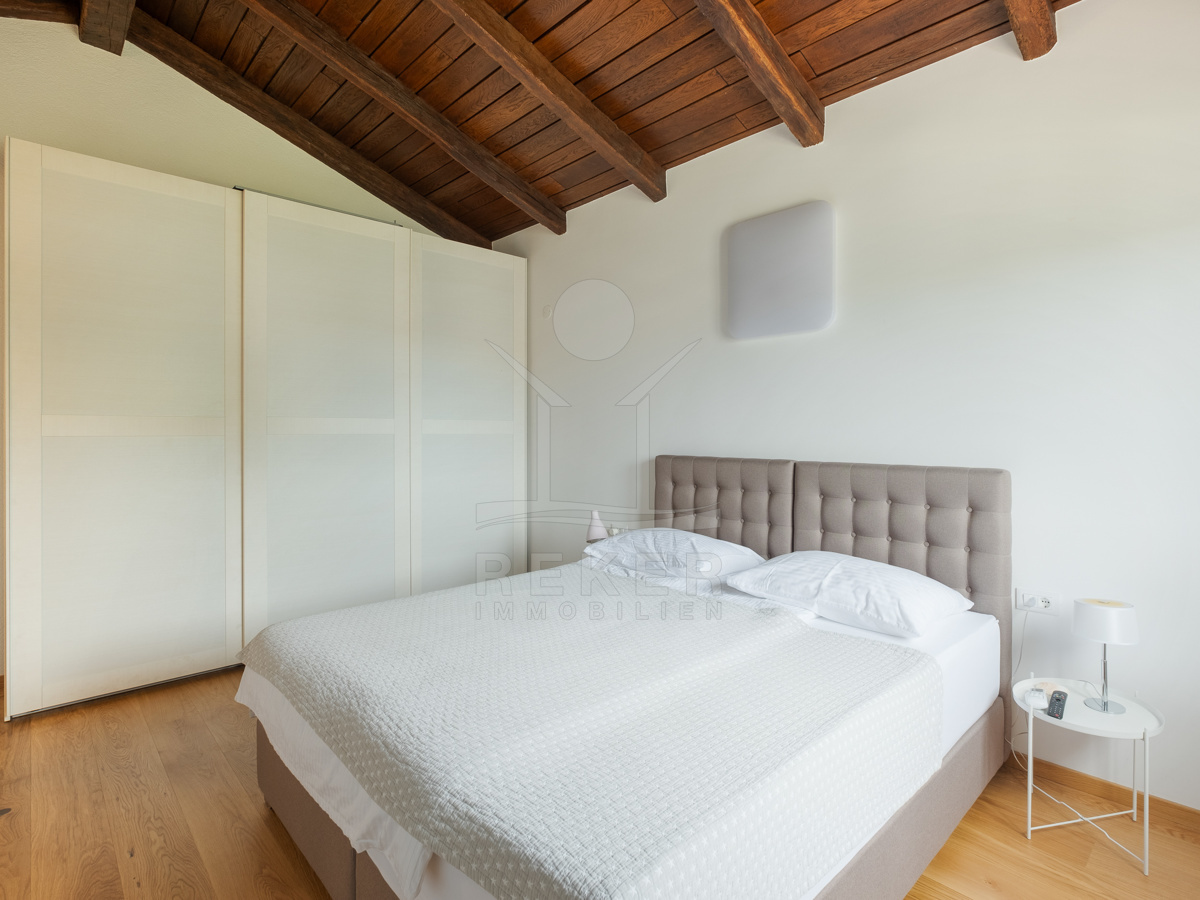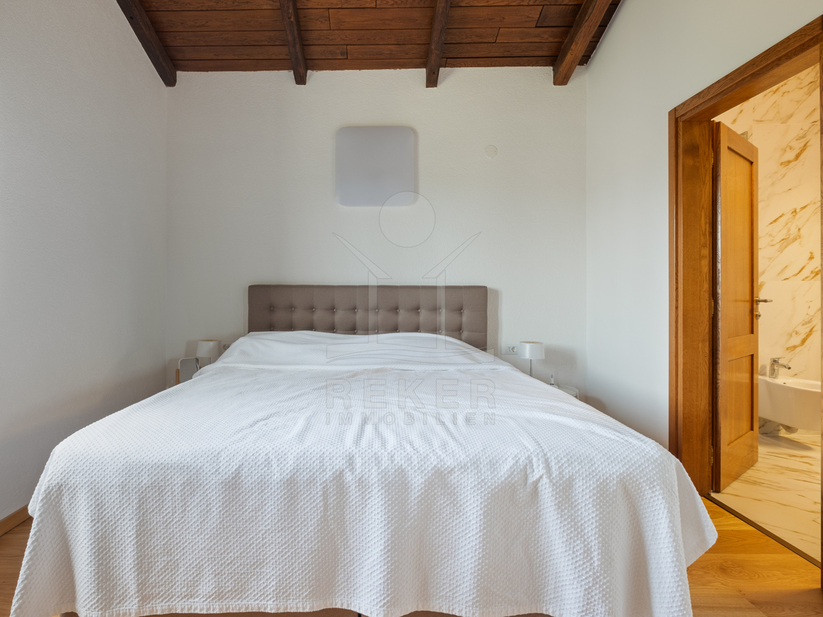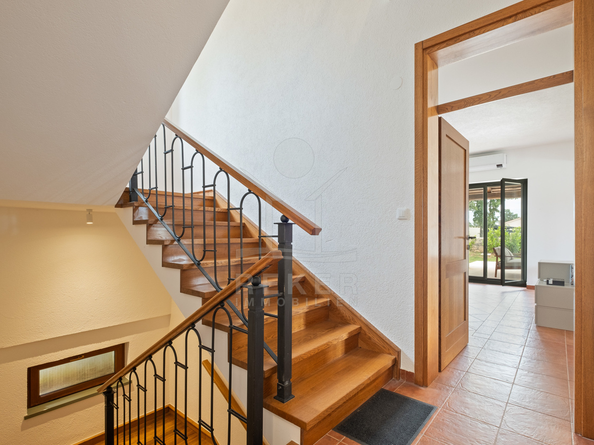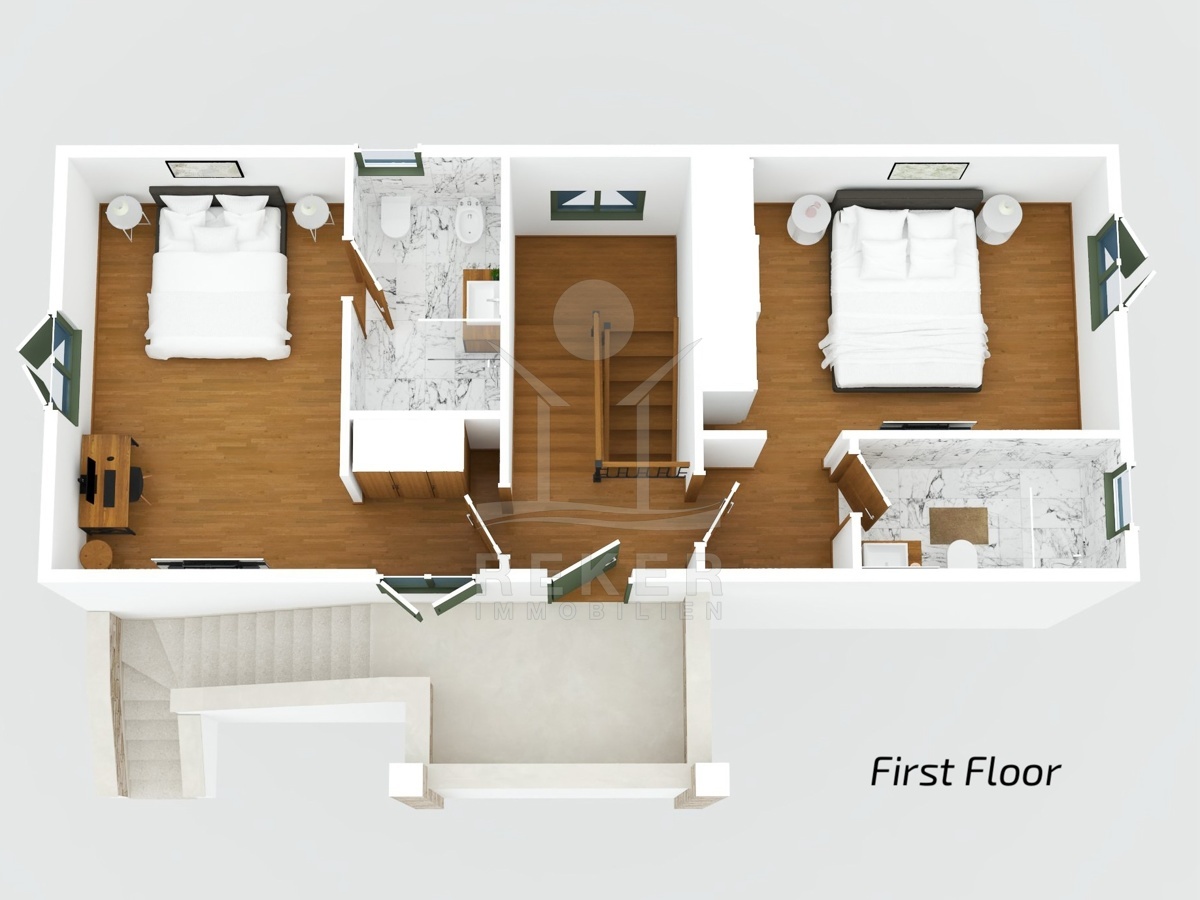 Eine elegante Innentreppe führt Sie in den ersten Stock, wo sich zwei weitere Schlafzimmer mit jeweils eigenem Bad befinden. Hier erleben Sie luxuriösen Wohnkomfort mit Stil und Eleganz.