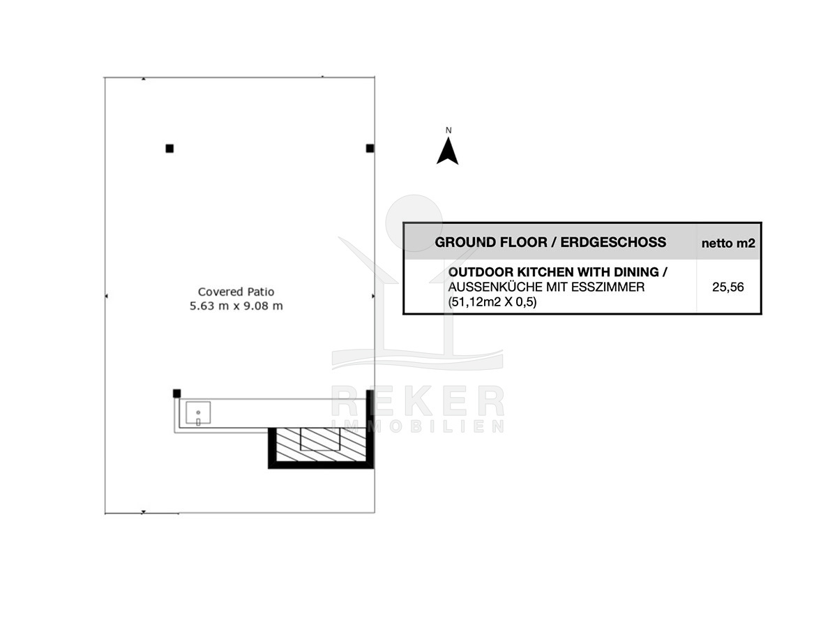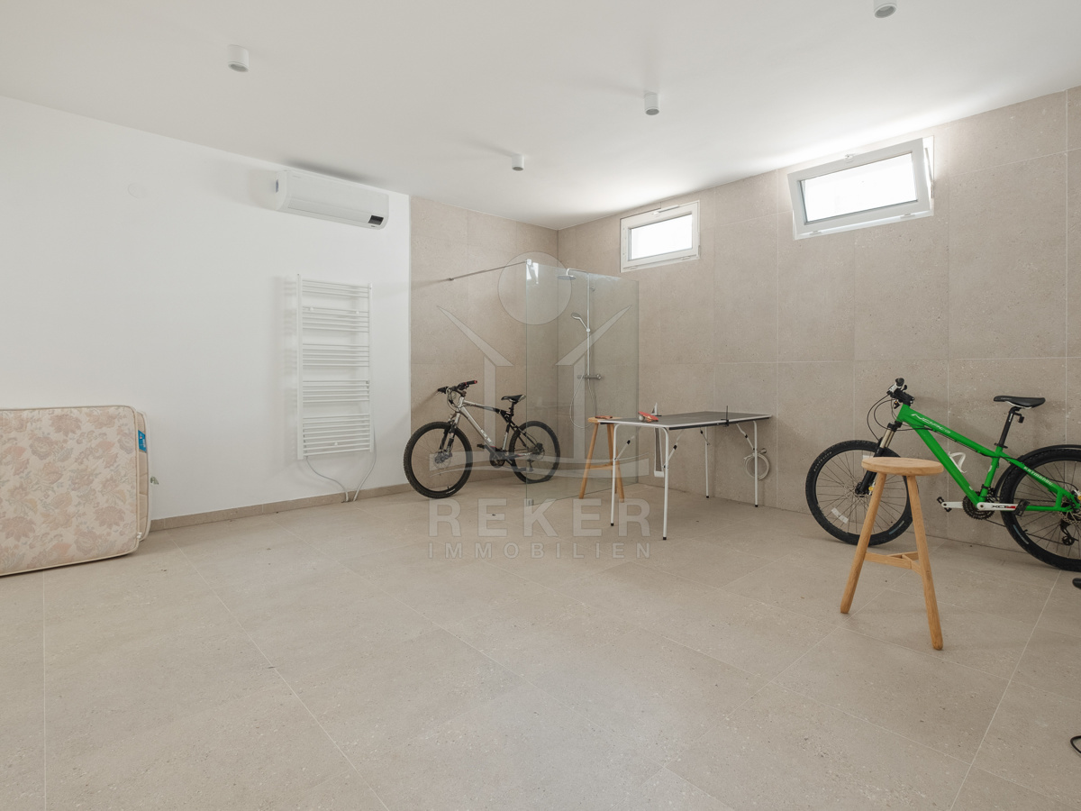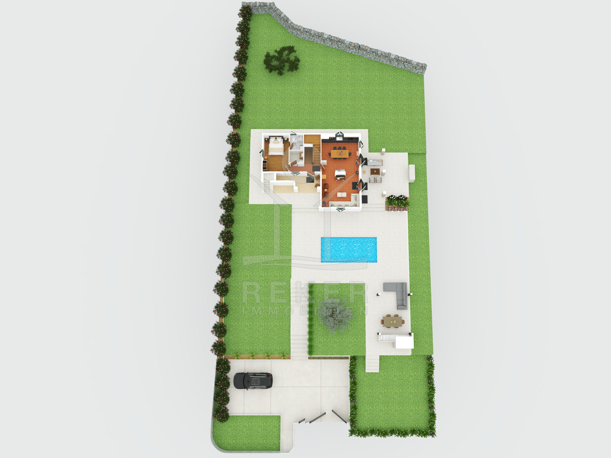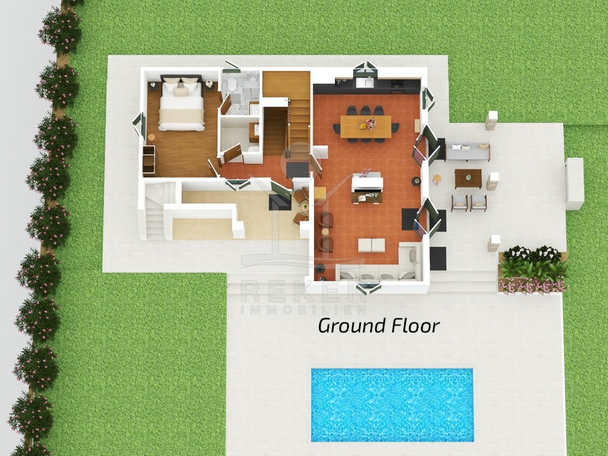 Die Villa wird inklusive Möbeln verkauft und bietet luxuriöses Wohnen auf höchstem Niveau. Im Erdgeschoss erwartet Sie ein offener Wohn-, Ess- und Küchenbereich mit Zugang zur überdachten Terrasse. Ein Schlafzimmer mit eigenem Badezimmer sowie ein zusätzliches WC bieten viel Platz und Komfort.