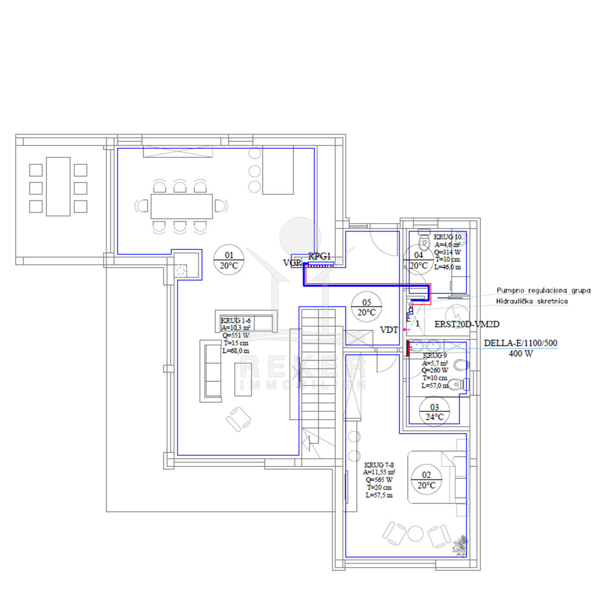 Die Villa wird in der Rohbauphase verkauft, ohne Tischlerei und Fassade. Die Terrassen werden betoniert und das Dach wird fertiggestellt, ebenso wie Fenster und Innenwände. Zur Heizung und Kühlung sind eine Fußbodenheizung und eine Klimaanlage geplant.