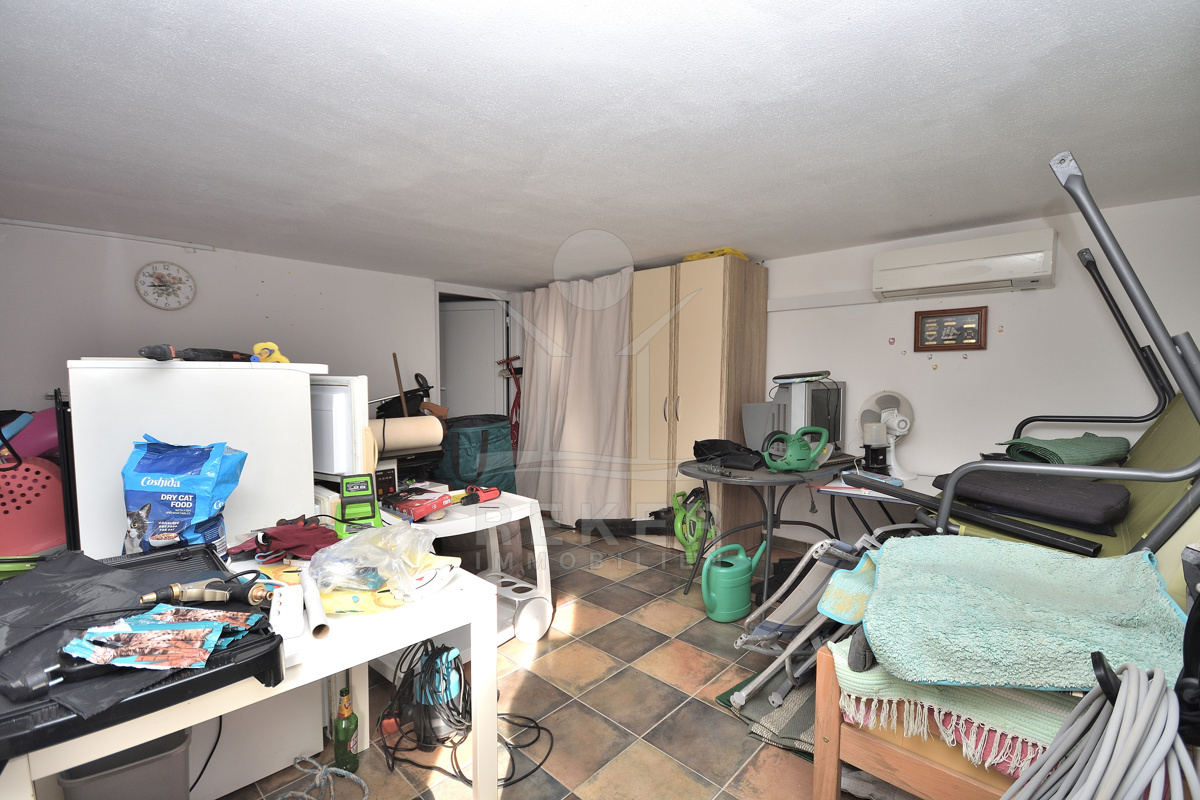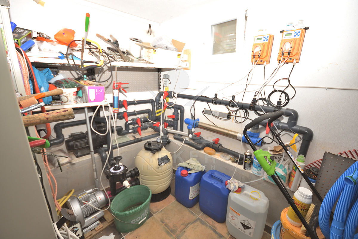 Die weitläufige Terrasse ist ein wahres Highlight und bietet eine einladende Oase zum Entspannen und Feiern im Freien. Mit einem Pool von 32 m² und einer praktischen Außendusche ist die Terrasse ideal für sonnige Tage und erfrischende Schwimmmomente. Auf der Seite der Villa befindet sich ein einladender traditioneller Steingrill sowie ein überdachter Bereich, der Platz für gesellige Zusammenkünfte mit Familie und Freunden bietet.