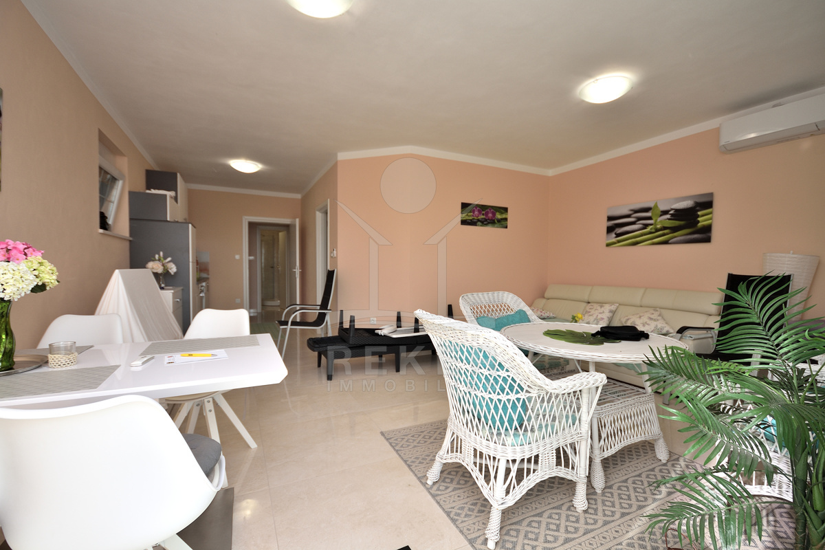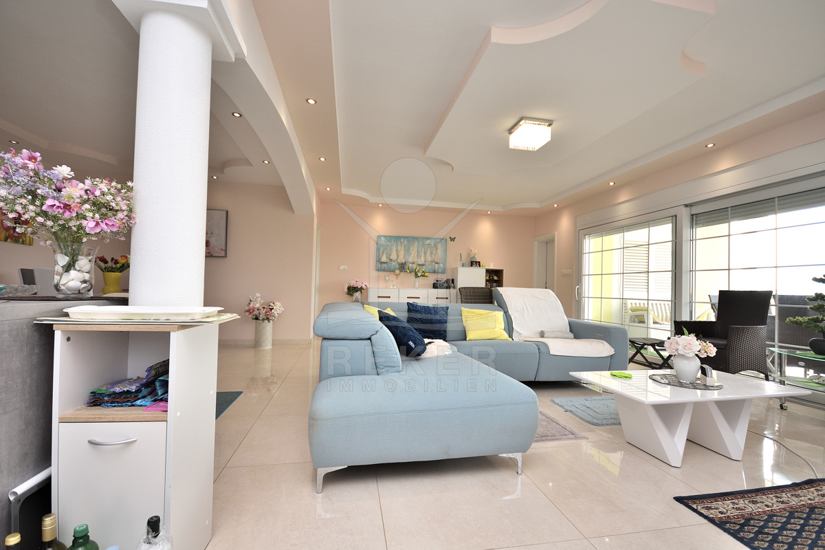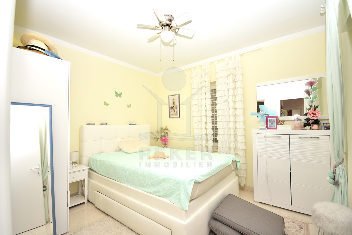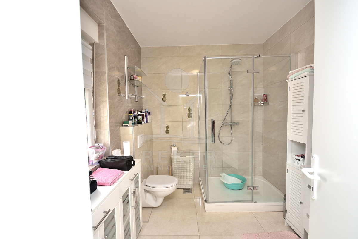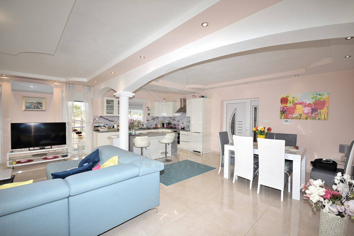 Die komfortable Wohnung im Erdgeschoss der Villa bietet luxuriöse Ausstattung und eine großzügige Fläche von 143 m². Vom stilvollen Eingangsbereich mit Treppe gelangen Sie in drei Schlafzimmer, die jeweils über eigene Badezimmer verfügen. Die modern gestaltete Küche und das angrenzende Esszimmer laden zu geselligen Abenden ein, während der offene Wohnbereich direkten Zugang zur überdachten Terrasse mit 26 m² bietet – ideal für entspannte Stunden im Freien. Diese großzügige und luxuriös ausgestattete Wohnung ist inklusive Möbeln zu erwerben, sodass Sie direkt einziehen können.
