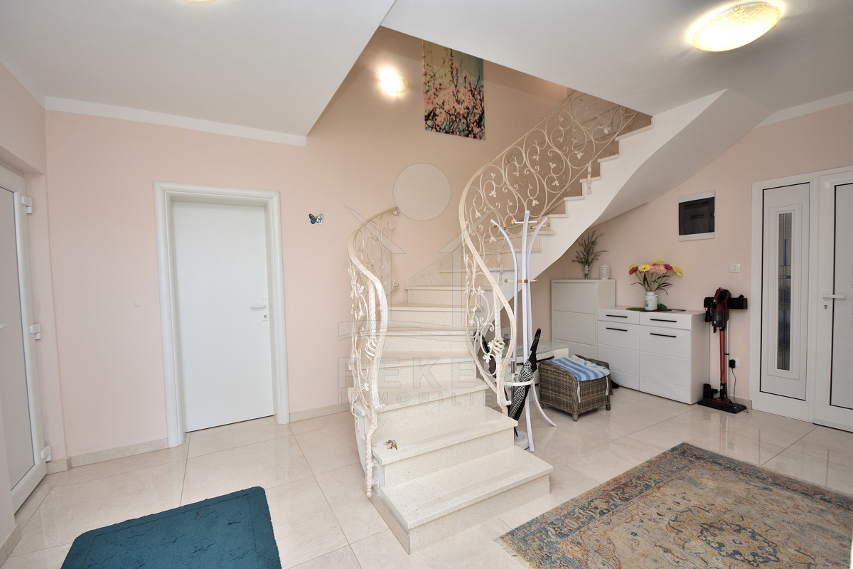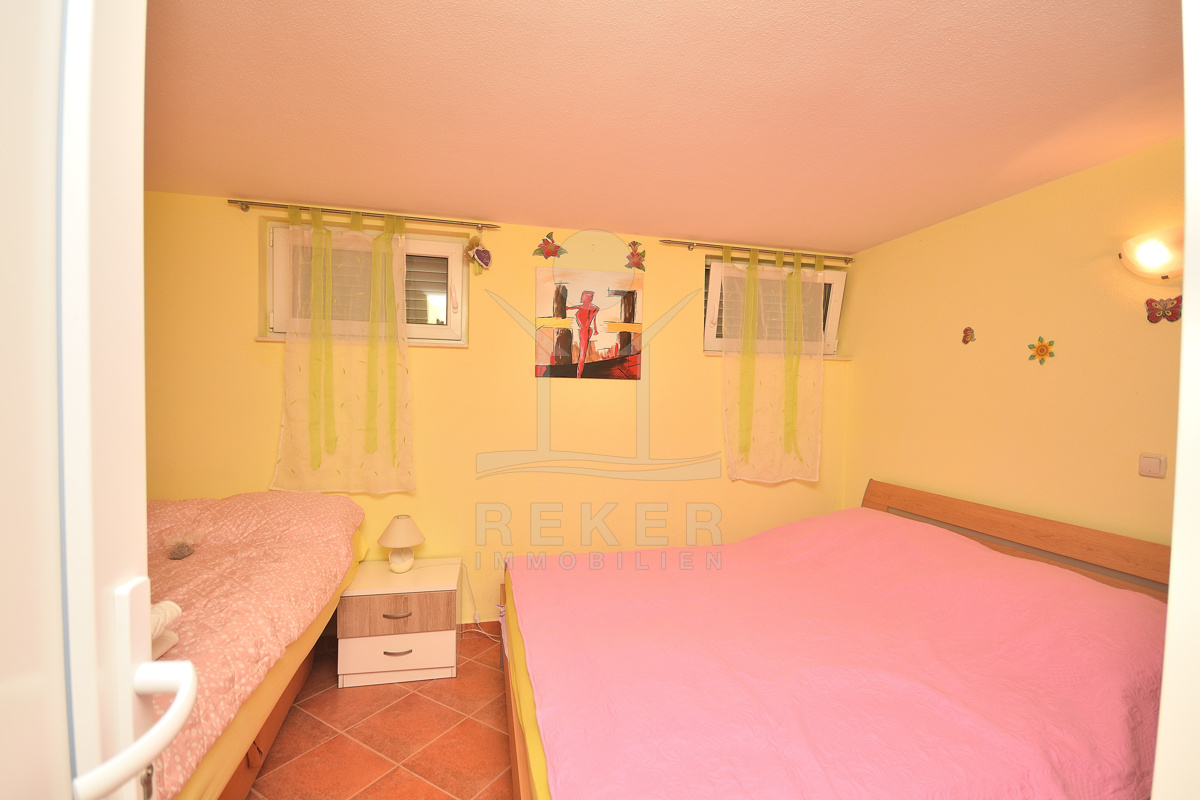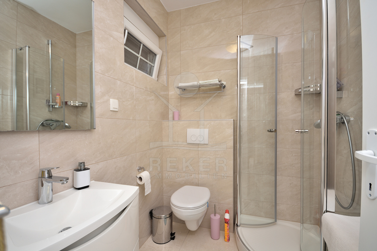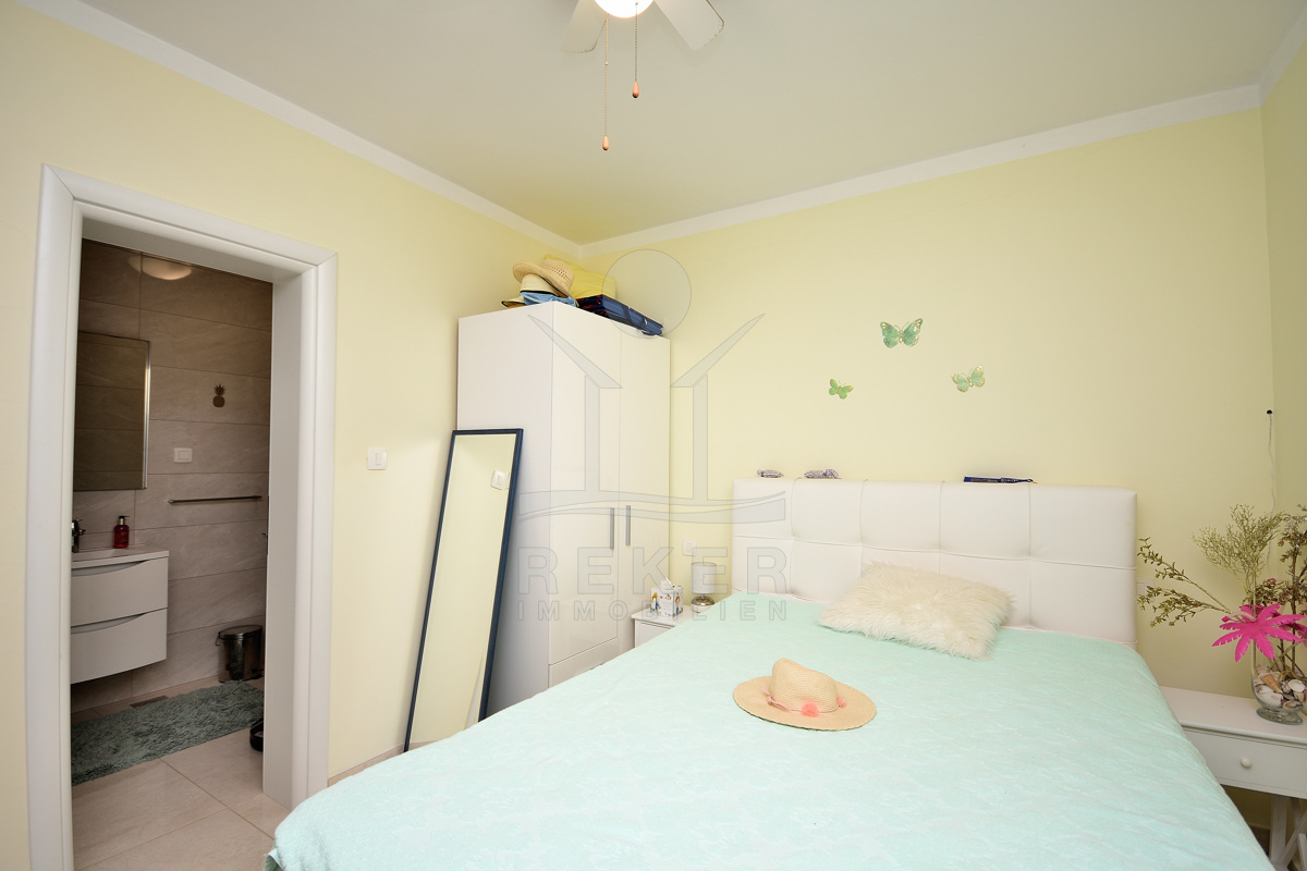 Über eine verspielte Treppe gelangen Sie in das Obergeschoss (Souterrain), wo eine separate Wohnung von 30 m² auf Sie wartet. Diese besteht aus einem Schlafzimmer, einem Badezimmer, einer Küche, einem Essbereich und einem Wohnzimmer. Die angrenzende Terrasse bietet Ihnen einen herrlichen Blick auf das Meer und die Umgebung – perfekt für entspannte Tage und traumhafte Sonnenuntergänge.