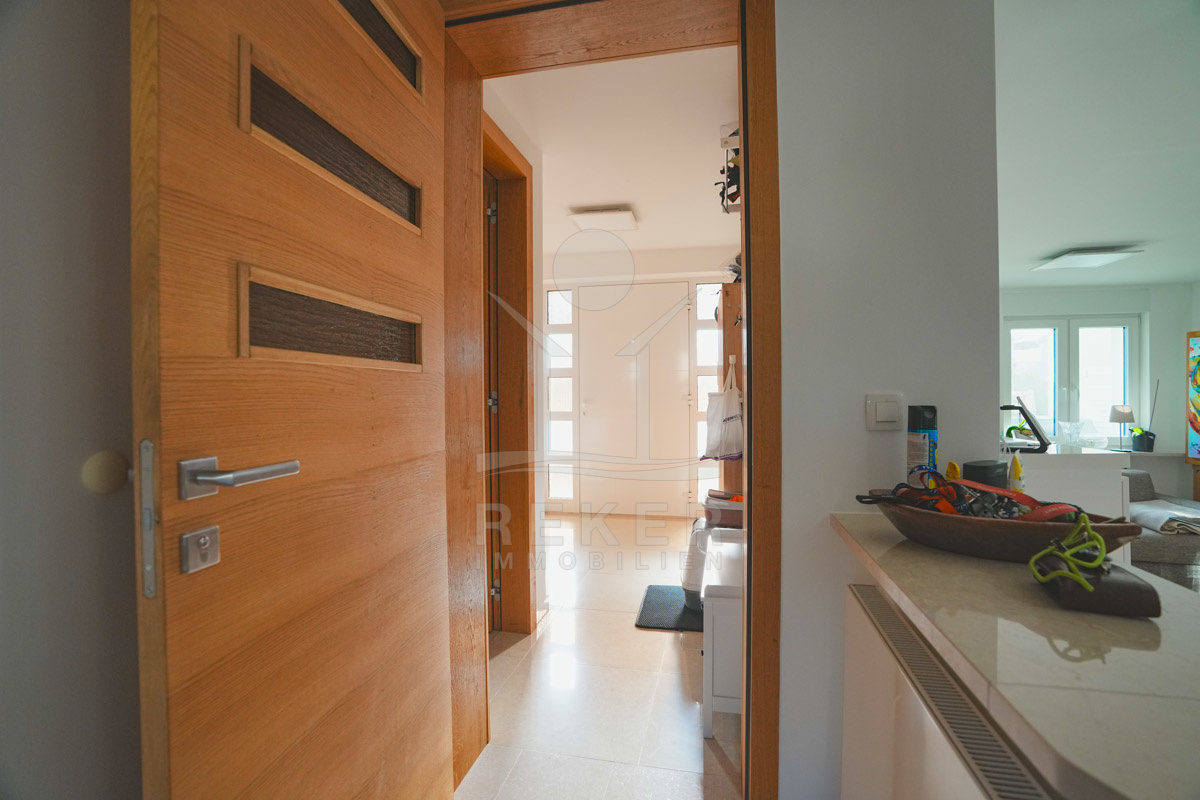 Die Villa umfasst insgesamt 170 m² Wohnfläche und wird möbliert verkauft. Das Erdgeschoss bietet 91 m². Dort stehen Ihnen ein Eingangsbereich, ein Flur, ein Gäste-WC, ein Badezimmer sowie ein offen gestalteter Wohn-, Ess- und Küchenbereich zur Verfügung. Diese Aufteilung passt gut zum täglichen Leben und zu gemeinsamen Momenten. Ergänzt wird die Ebene durch einen Abstellraum, einen Technikraum und eine Speisekammer.