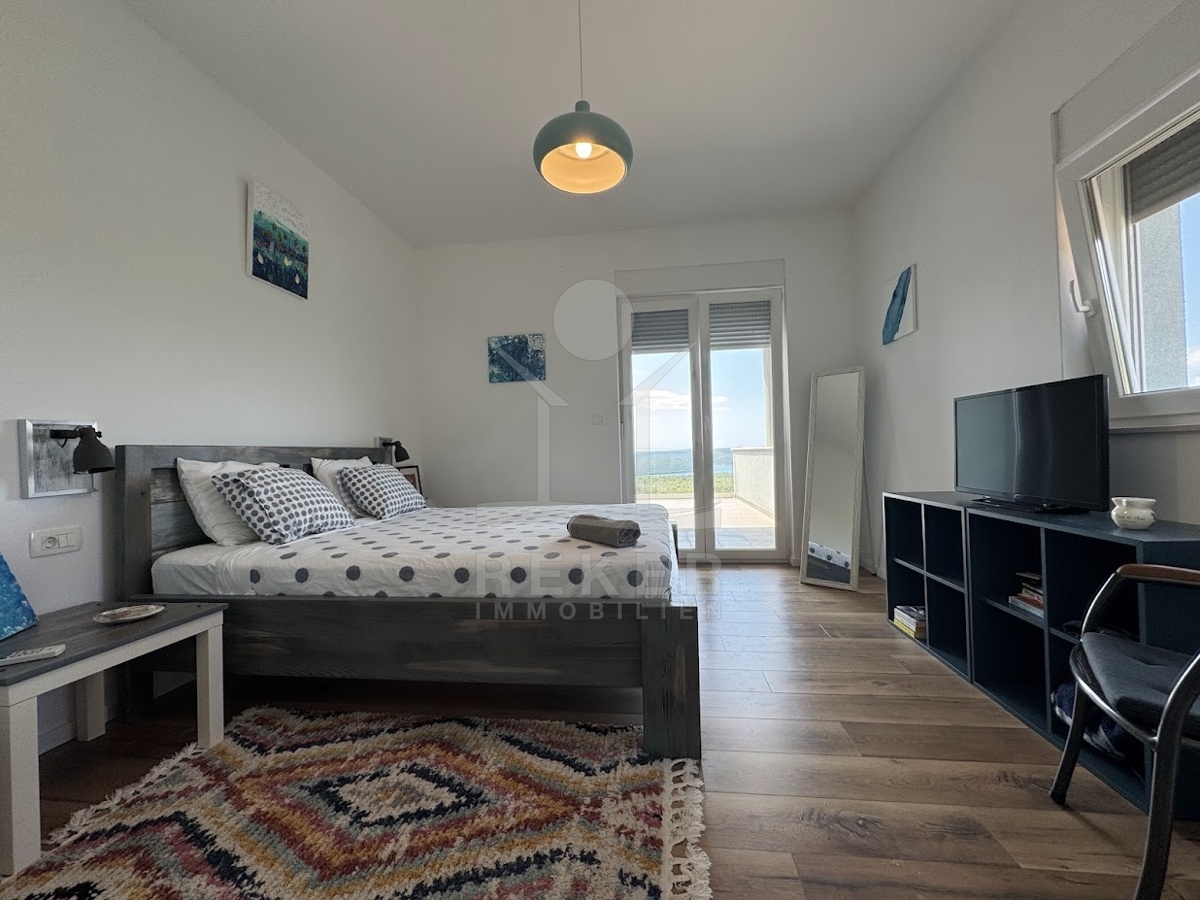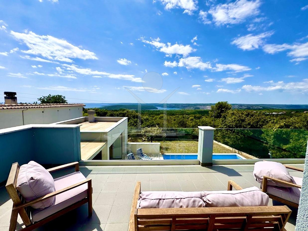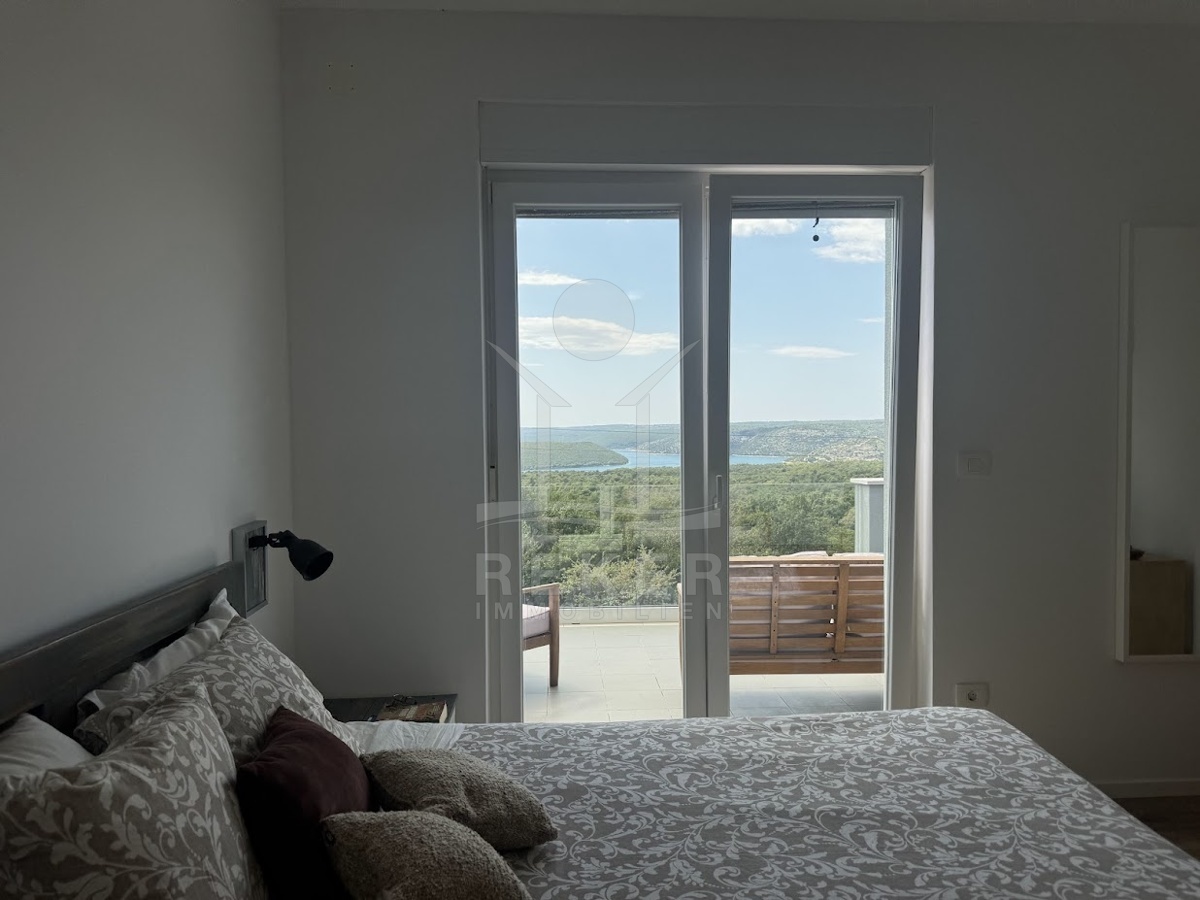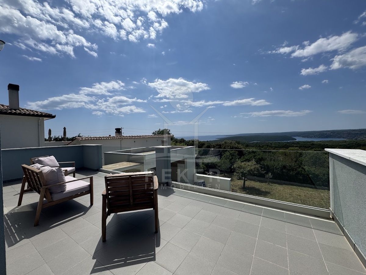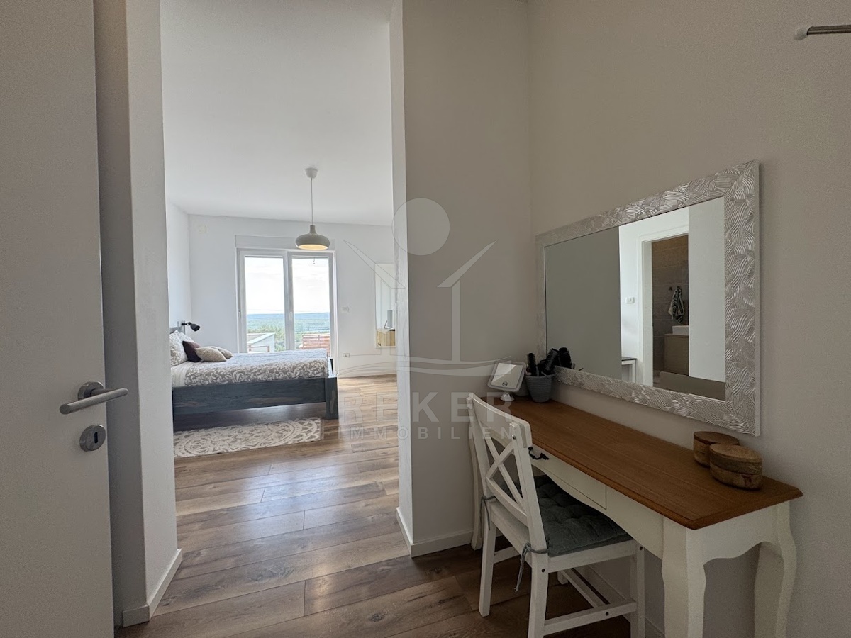 Im idyllischen Ort Viškovići in der Gemeinde Raša steht diese moderne Villa mit offenem Meerblick. Ruhig eingebettet in grüne Natur und nur rund 2 Kilometer von der Bucht Tunarica entfernt, verbindet sie Ruhe, Privatsphäre und Nähe zum Meer. Die Umgebung ist geprägt von Wäldern, mediterraner Vegetation und klarer Luft. Durch die Hanglage genießen Sie Sonne und Aussicht bis zum Horizont. Die Zufahrt ist bequem, das Umfeld gepflegt und nahezu frei von Verkehr.