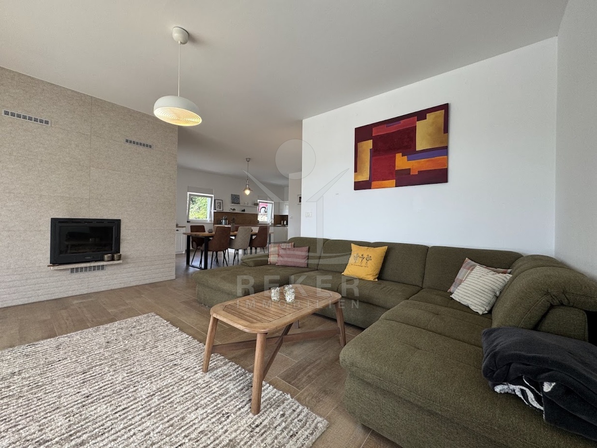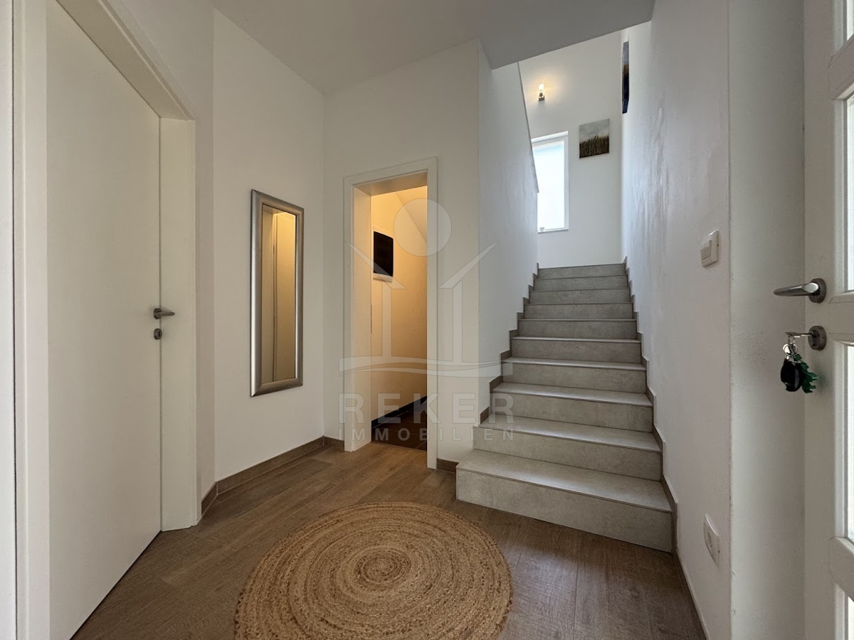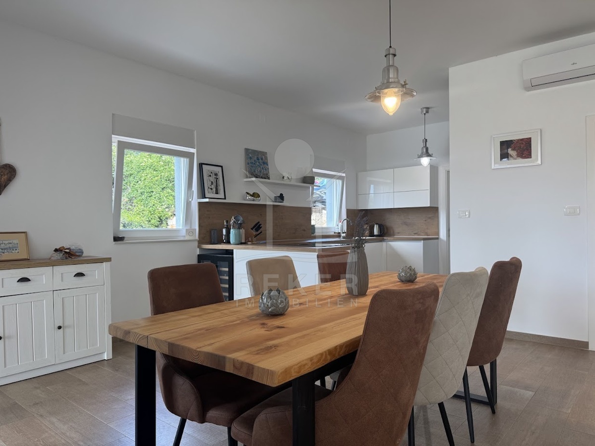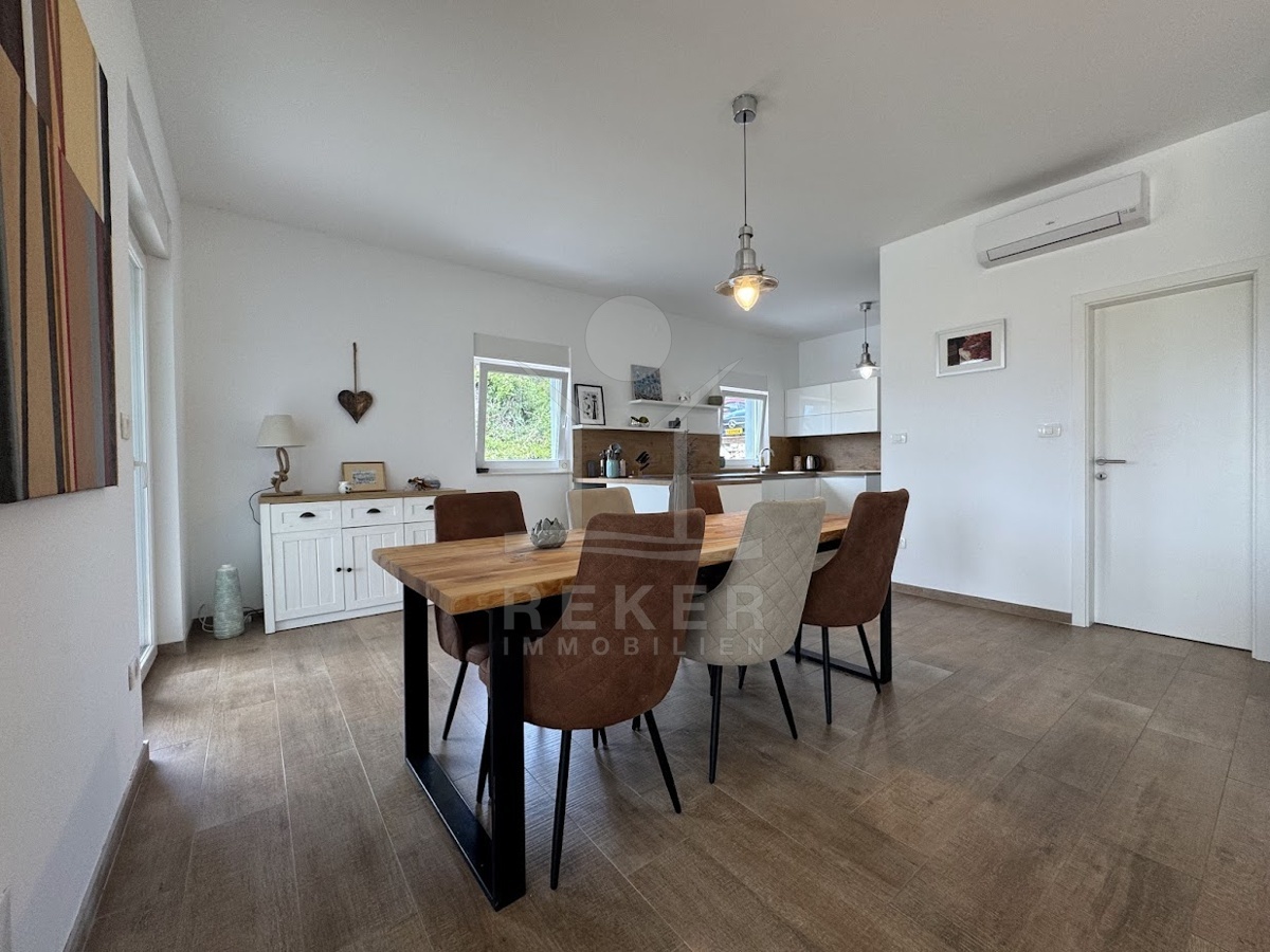 Im idyllischen Ort Viškovići in der Gemeinde Raša steht diese moderne Villa mit offenem Meerblick. Ruhig eingebettet in grüne Natur und nur rund 2 Kilometer von der Bucht Tunarica entfernt, verbindet sie Ruhe, Privatsphäre und Nähe zum Meer. Die Umgebung ist geprägt von Wäldern, mediterraner Vegetation und klarer Luft. Durch die Hanglage genießen Sie Sonne und Aussicht bis zum Horizont. Die Zufahrt ist bequem, das Umfeld gepflegt und nahezu frei von Verkehr.